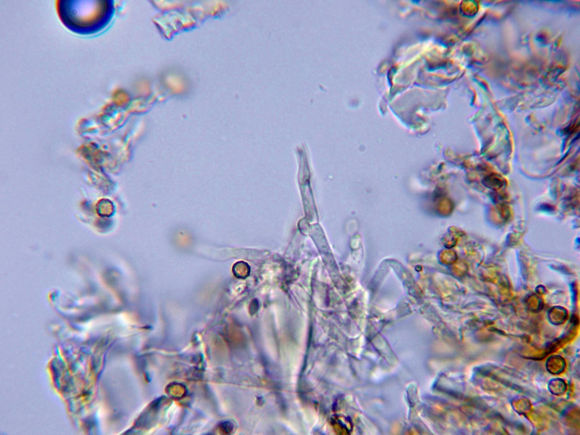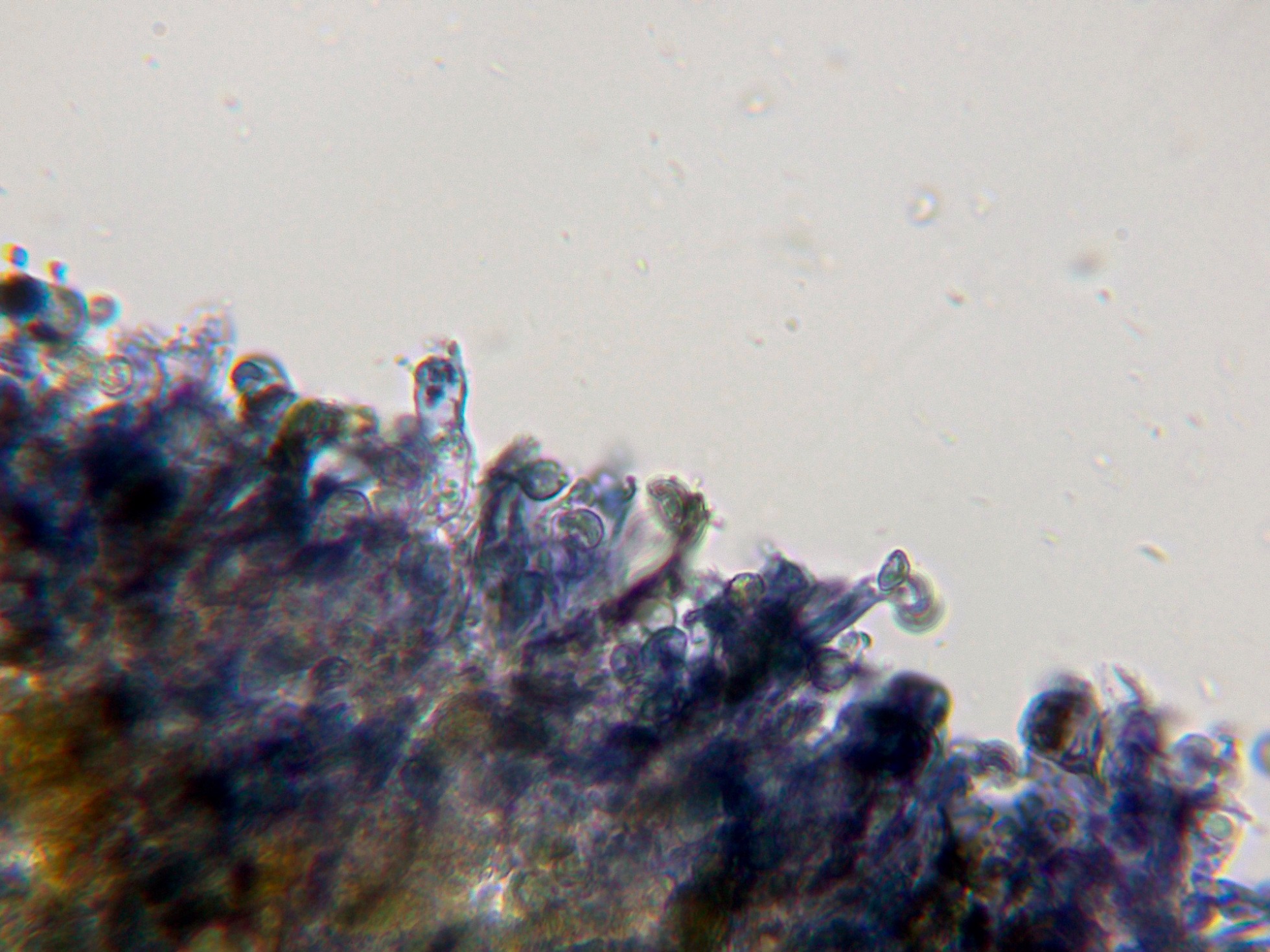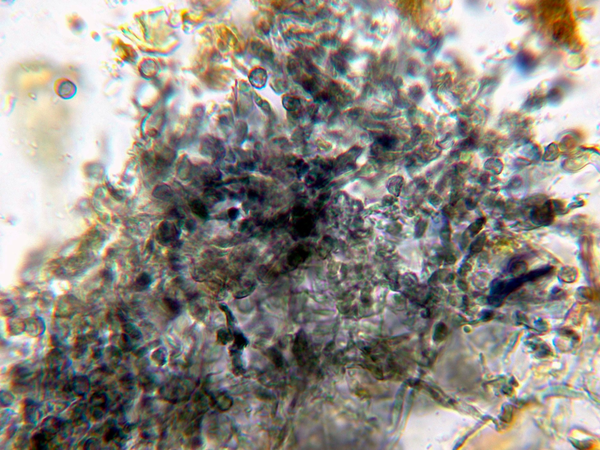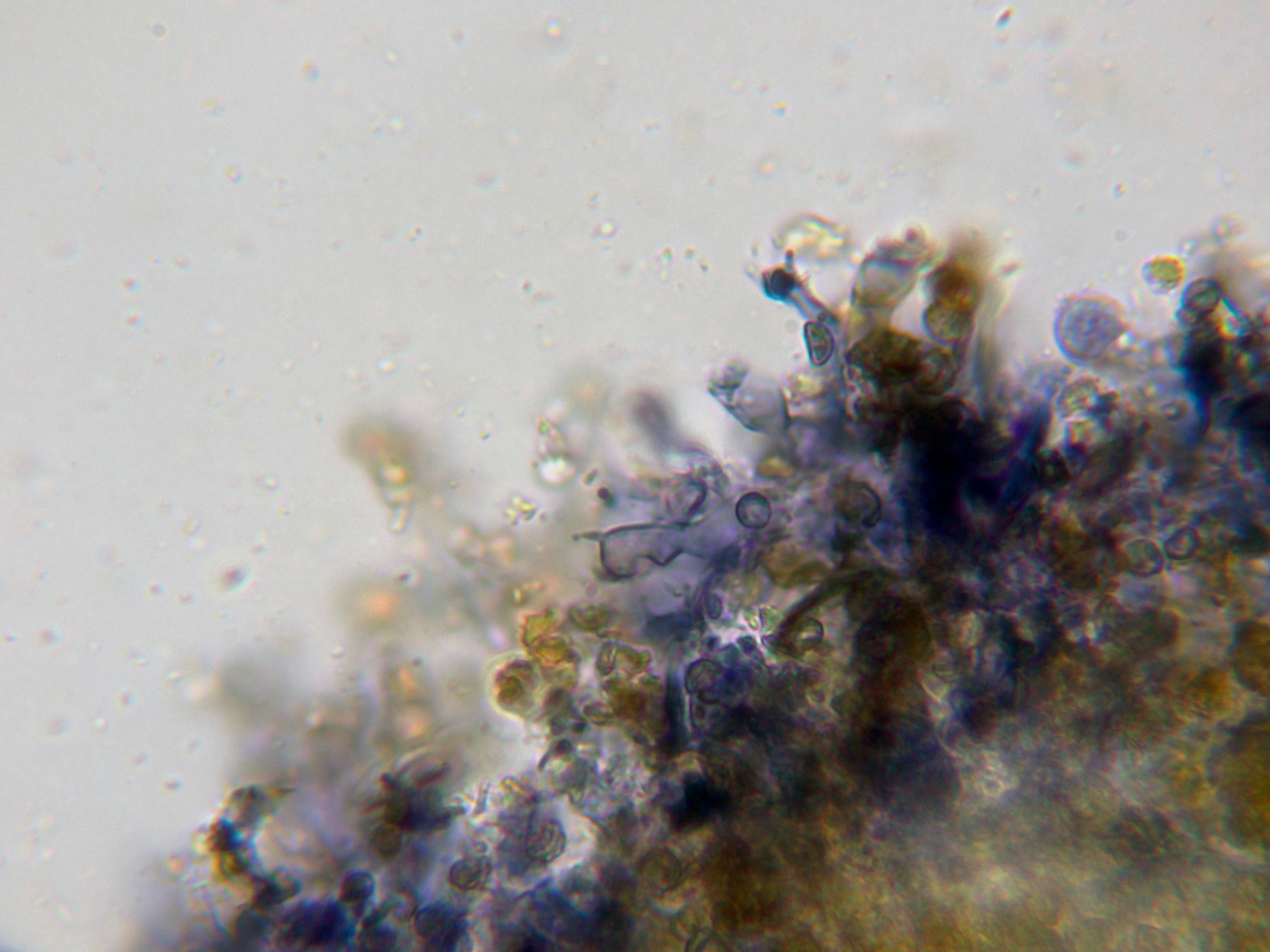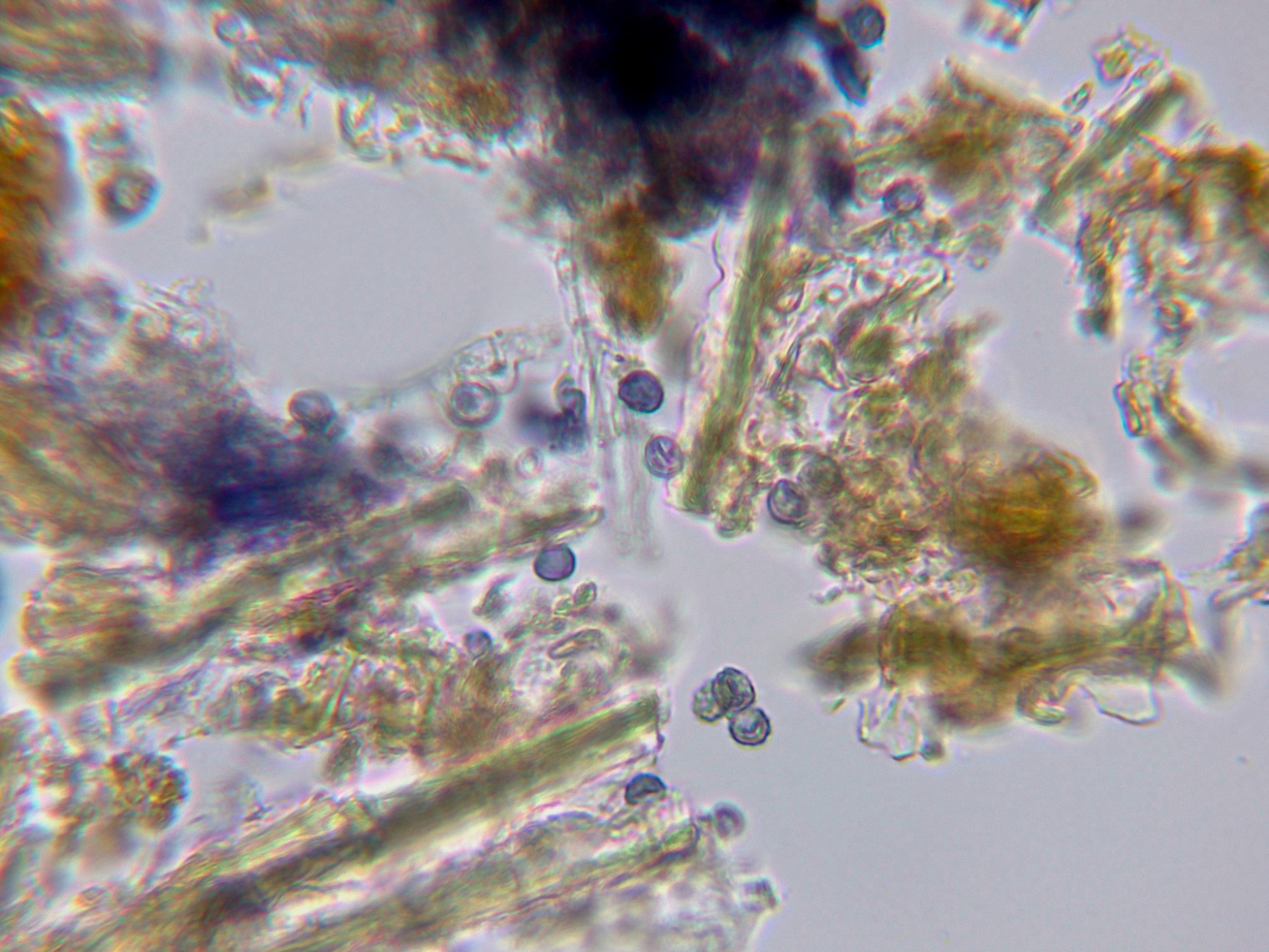 No obstante me surgen un par de dudas acerca de su identidad, la primera porqué el Amaurodon aquicoeruleus estaría referenciado en Australia, y esto queda "un poco lejos", y la segunda porqué las esporas del género Amaurodon por regla general adquieren un color azulado al aplicar KOH, y aunque este color desaparece a los pocos minutos, en mi estudio las esporas en solución de KOH al 20% se decoloraron prácticamente al instante, añado una imágen de las esporas en KOH.