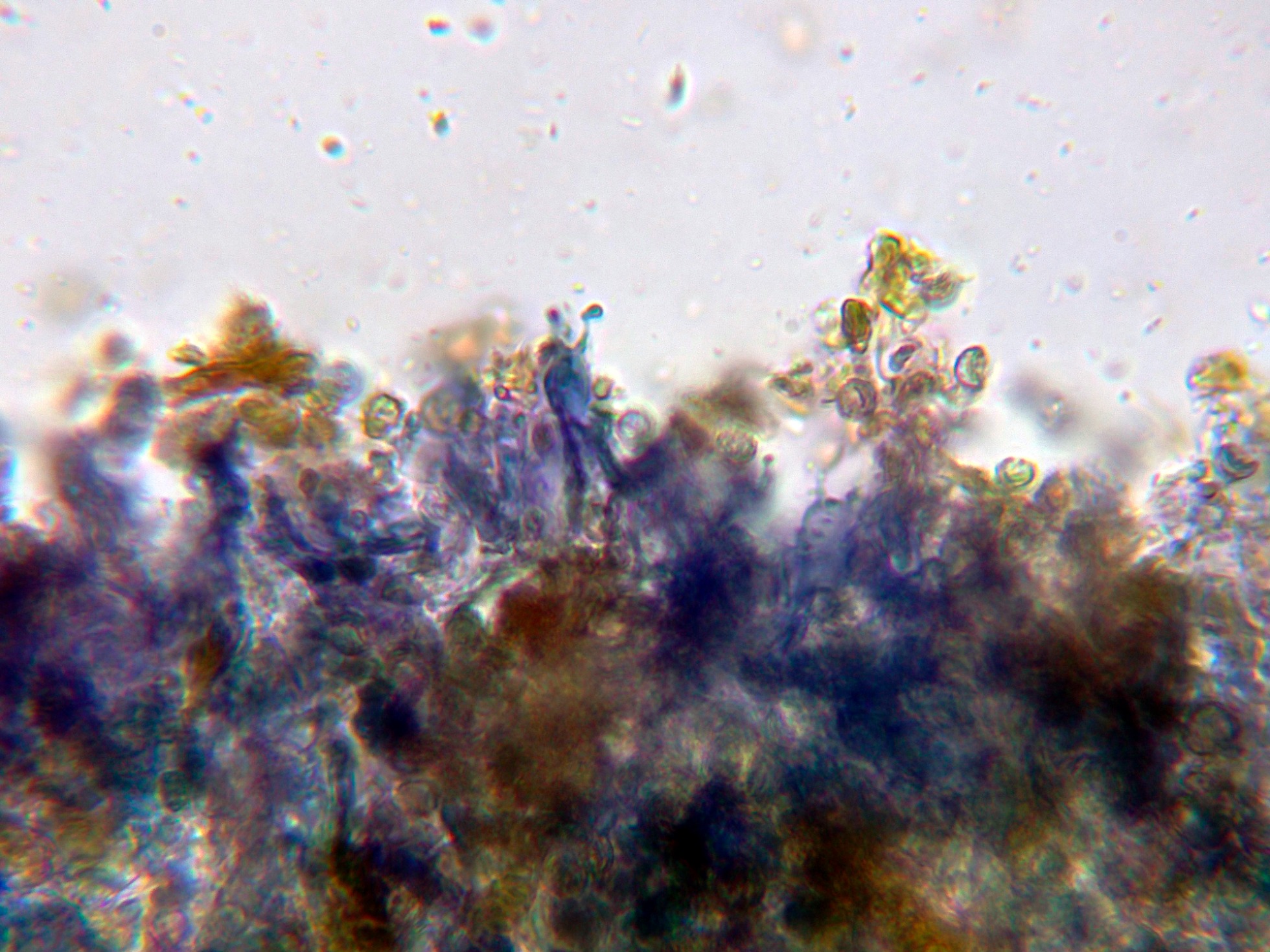 Himenio sin cistidios diferenciados, con basidios tetraspóricos con pigmento azulado en su interior.