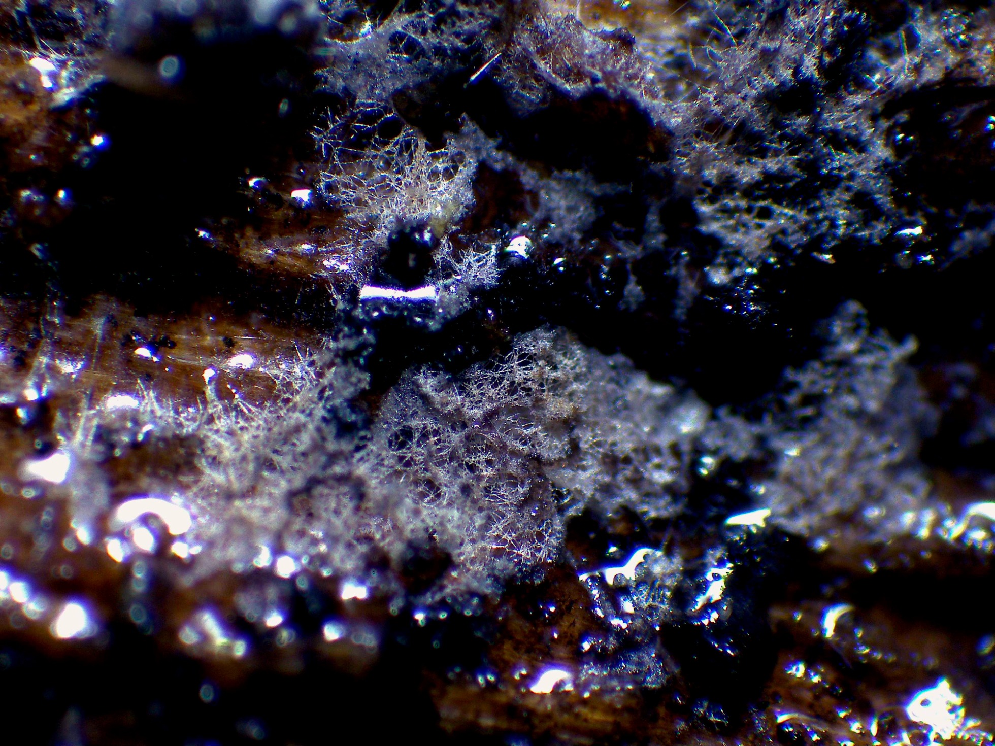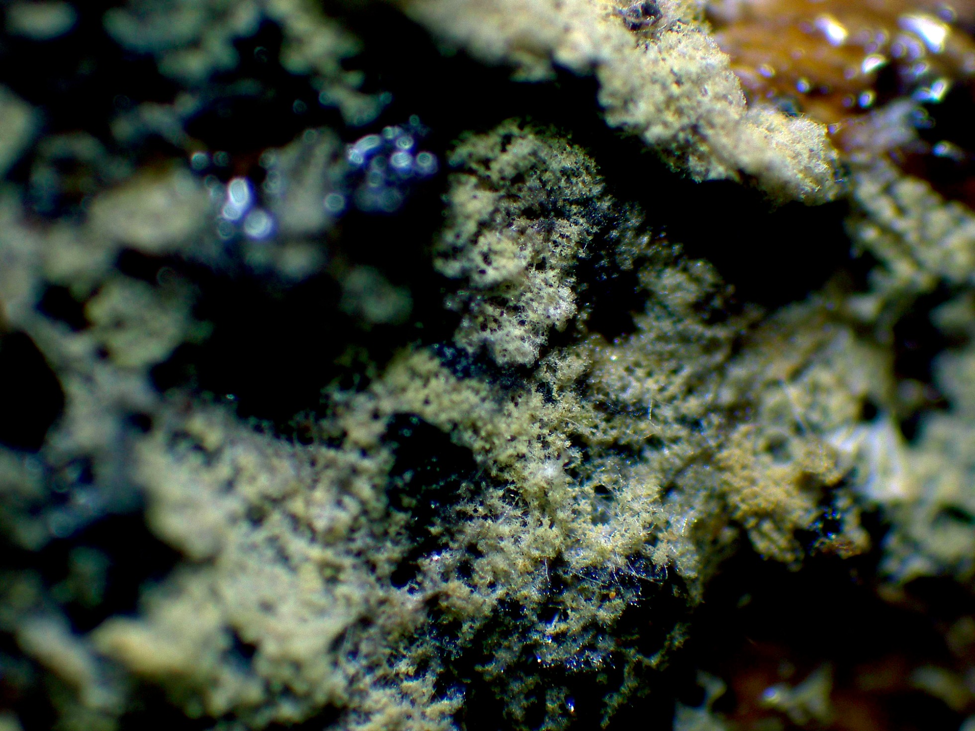 Una imagen de su superficie tomada en el mismo lugar a 20 aumentos, a destacar su muy poco grosor, dejando incluso entrever en algunos puntos la madera del sustrato.