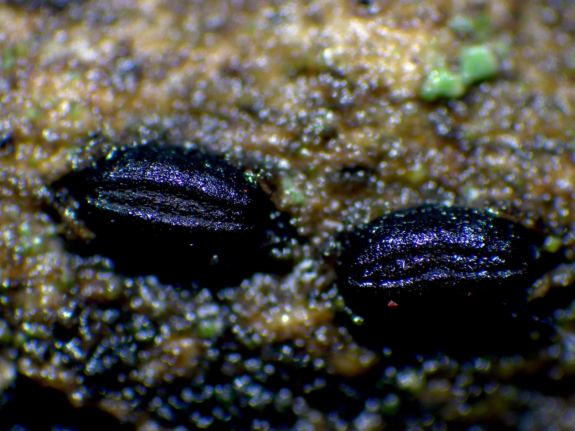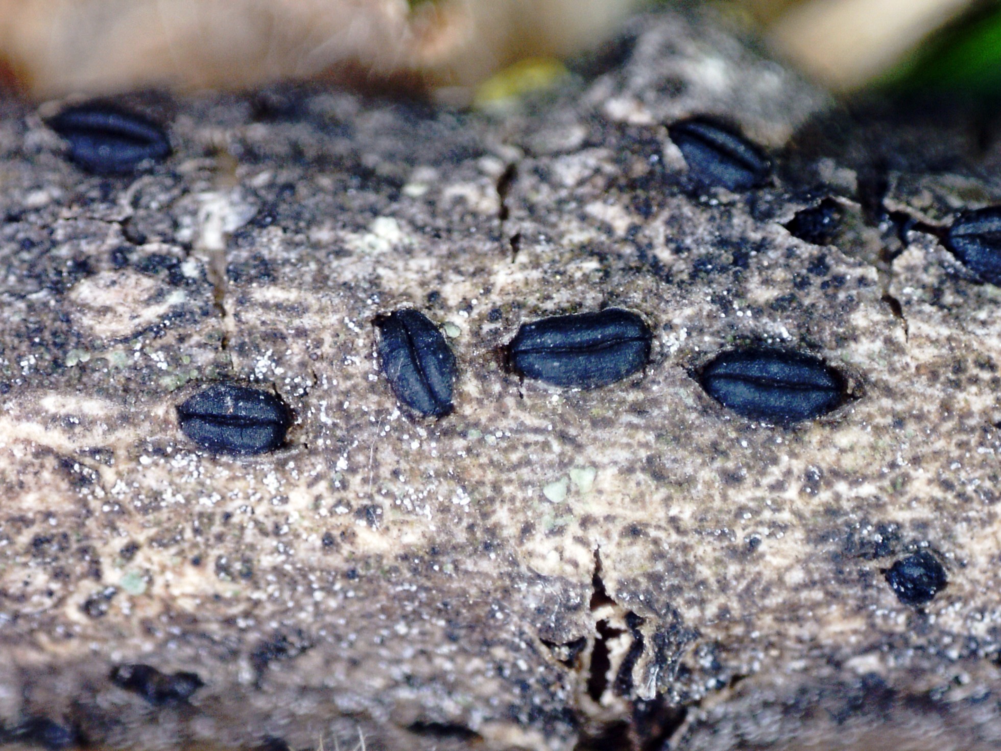 Ascomas de color negruzco tipo ascostroma, elipsoidales, de pequeño tamaño, con una forma que recuerda a los granos del café, el mayor de apenas poco más de 1 mm., con una hendidura que lo atraviesa por completo, dejando entrever el himenio por donde expulsará las esporas.