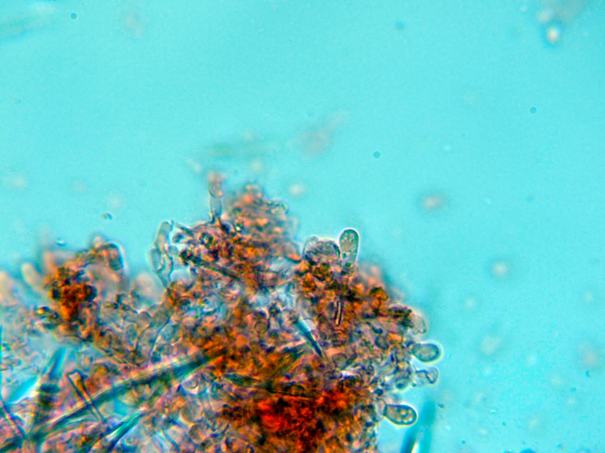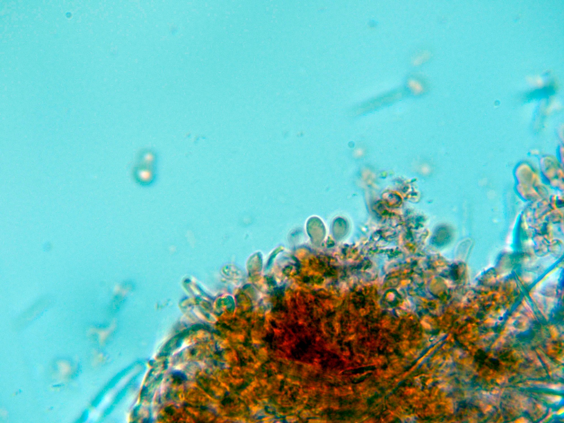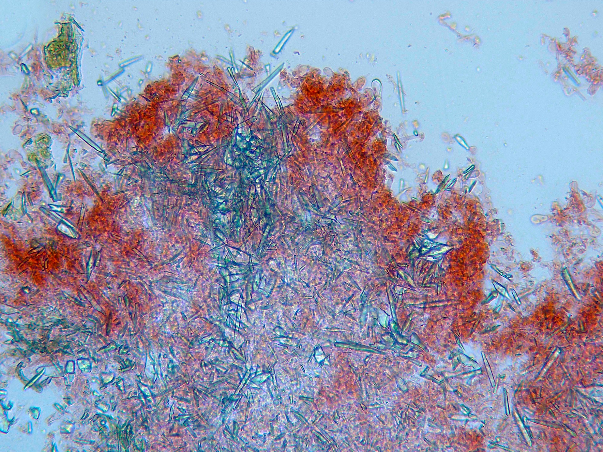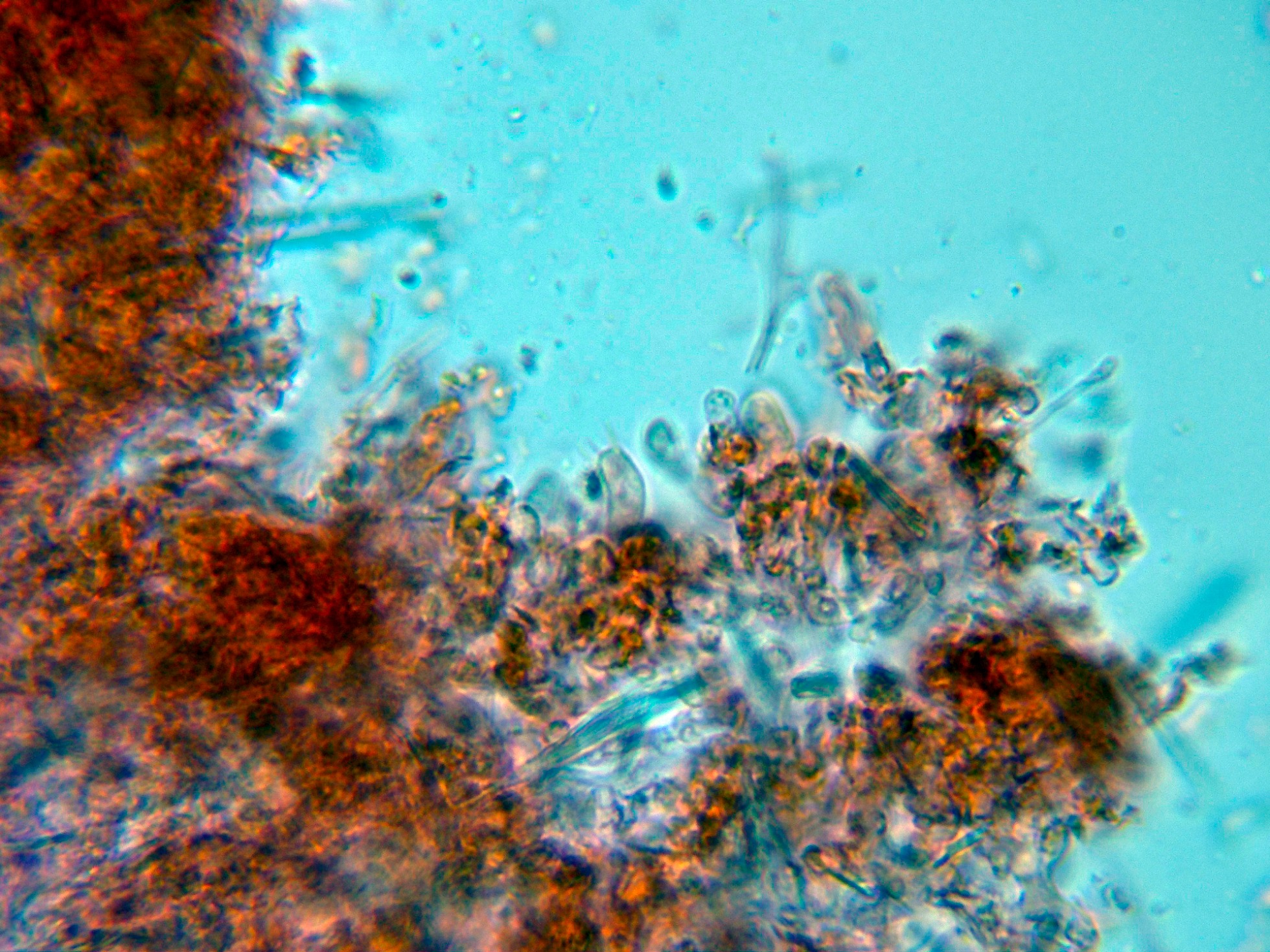 Hola Juan, son muchos los Corticales que presentan cristales en el subhimenio, por cierto su presencia o no resulta de considerable valor taxonómico, pero estos cristales generalmente son de Oxalato de calcio, en mi humilde opinión entiendo que no se corresponderían con Diatomeas, estás últimas de Dioxido de silicio (Sílice).