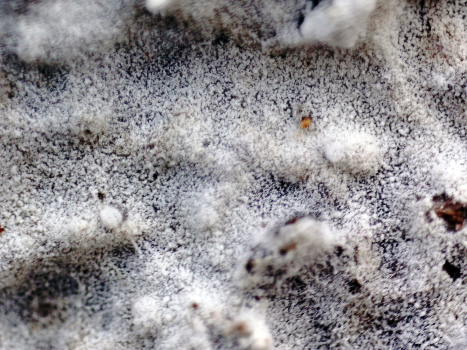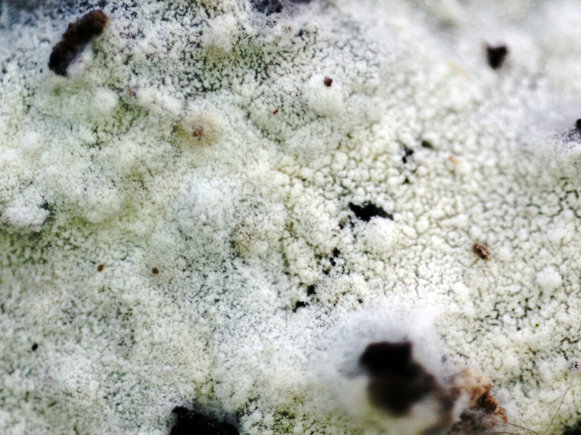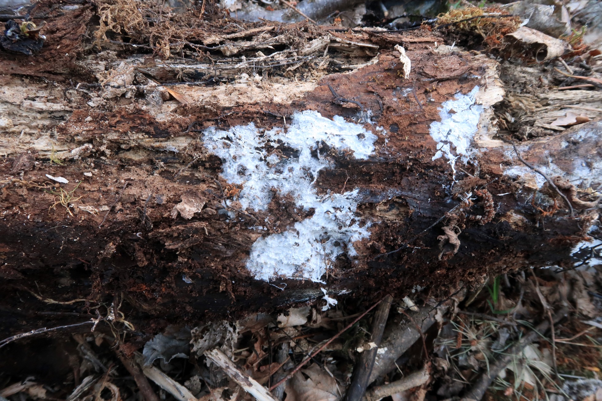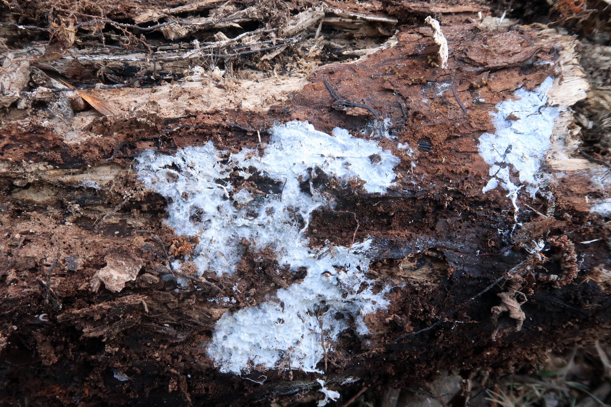 Un Corticial del pasado 7 de Abril, de color blanco, superficie polvorienta y borde de crecimiento con rizomorfos.