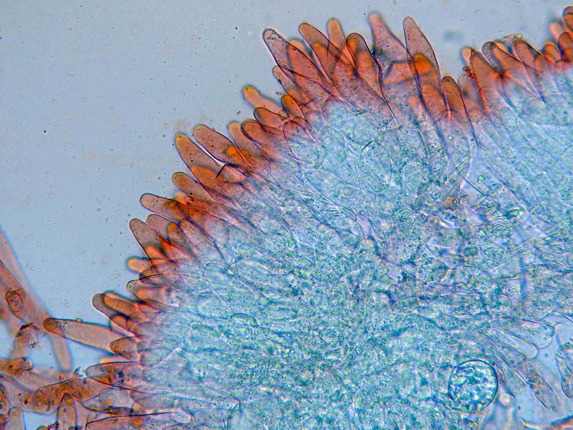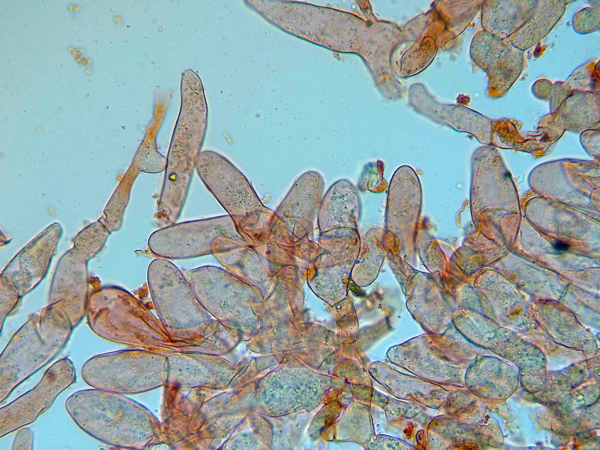 El segundo con abundantes cristales en el subhimenio, con cistidios capitados y pocas esporas observadas con unas medidas de (4.6) 4.64 - 6.1 × 3.5 - 4.35 (4.4) µm.