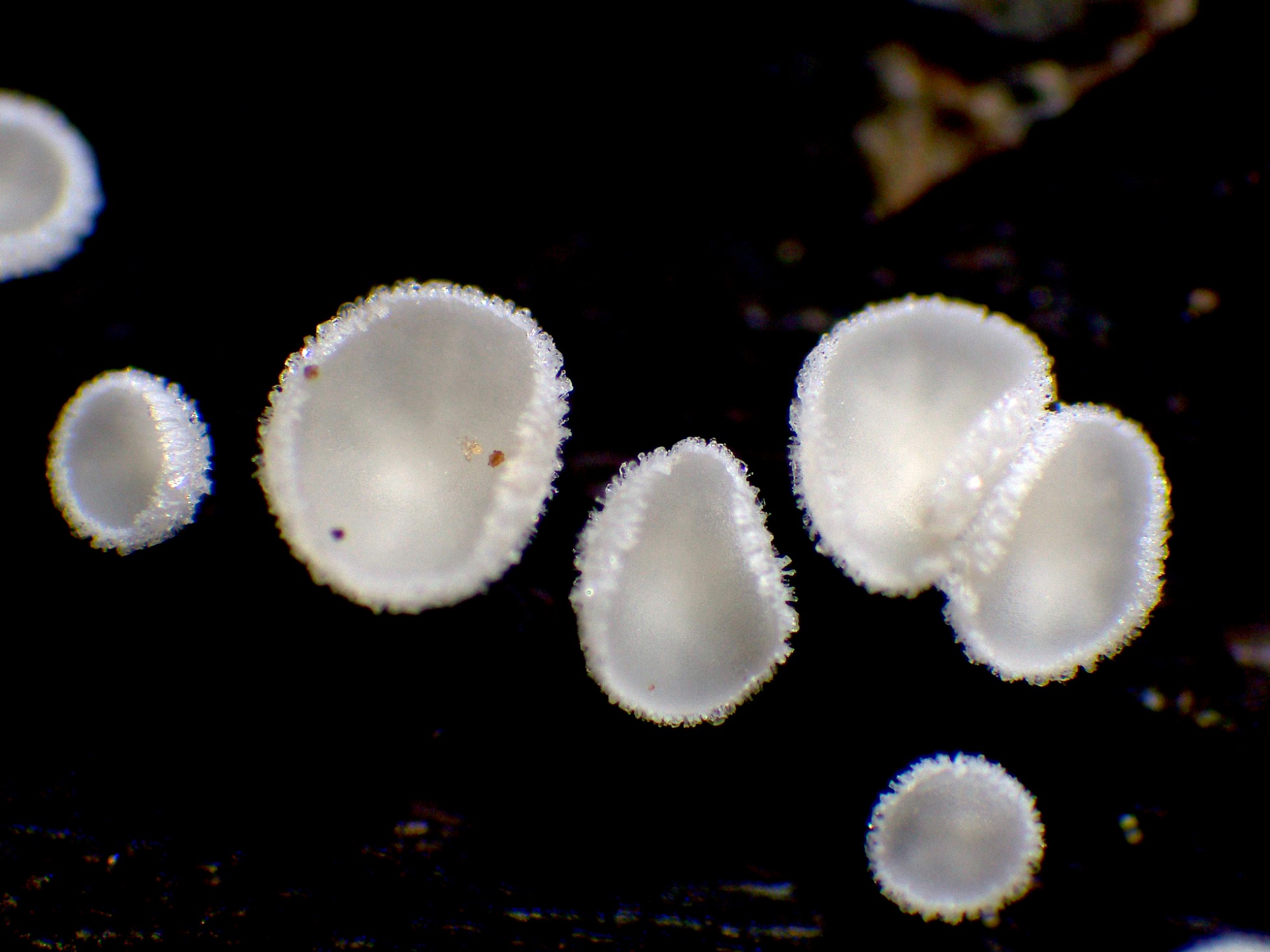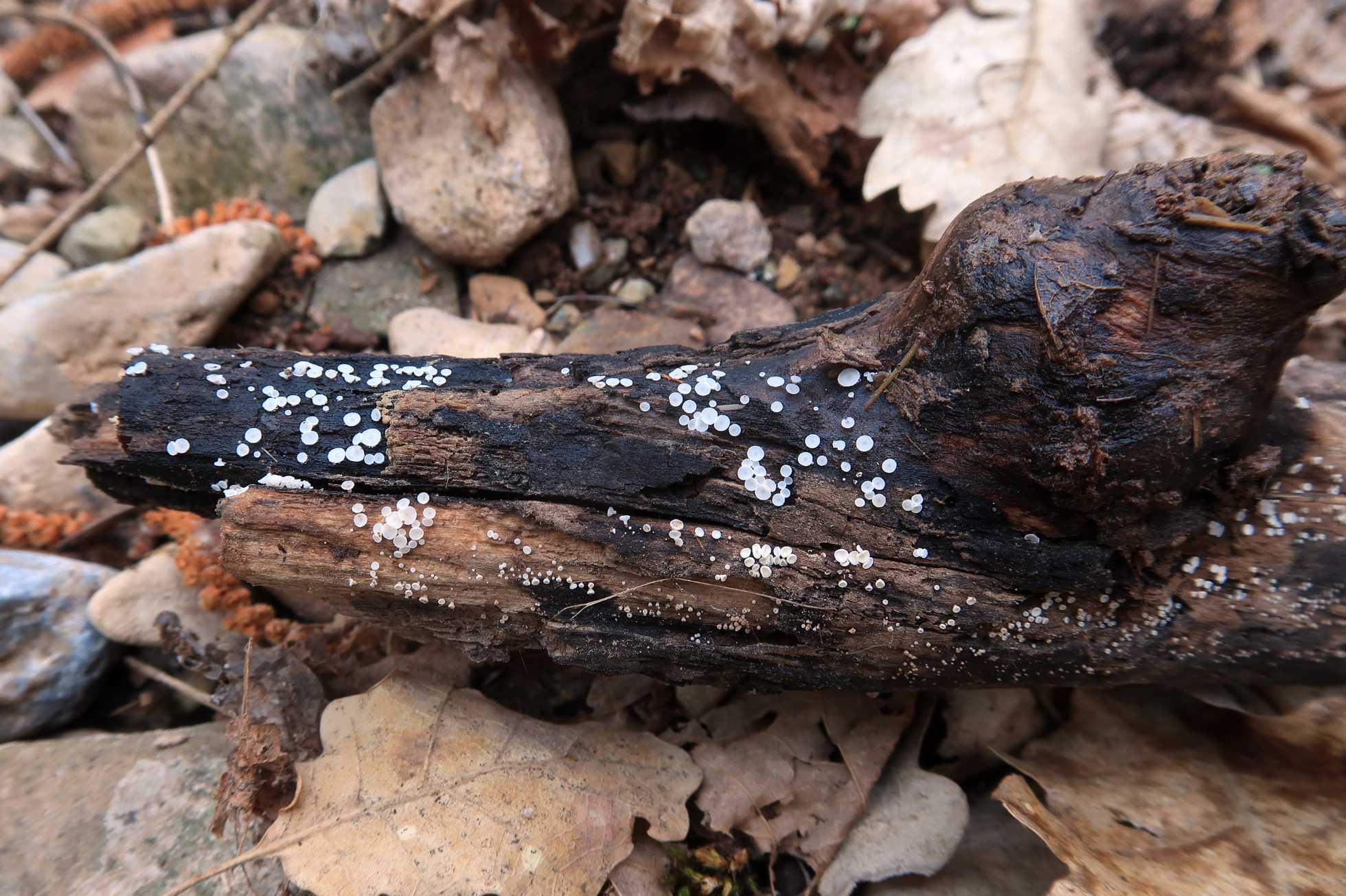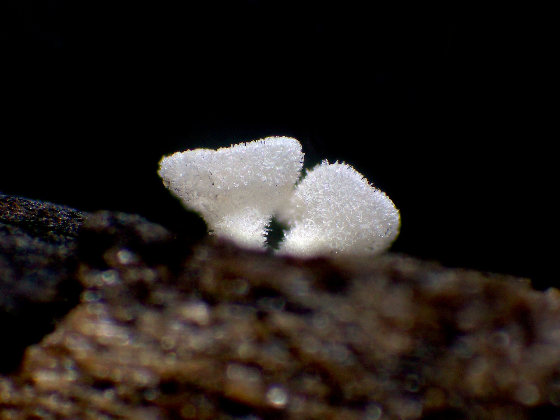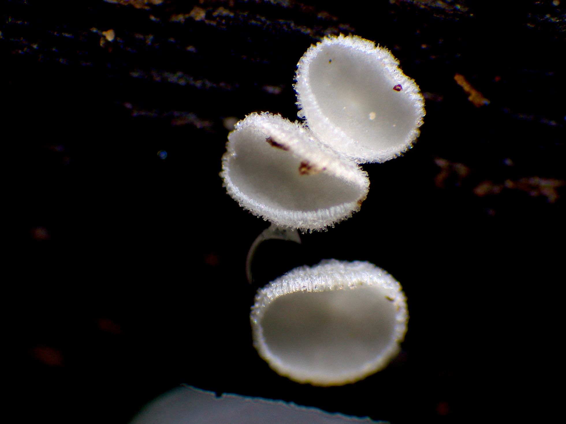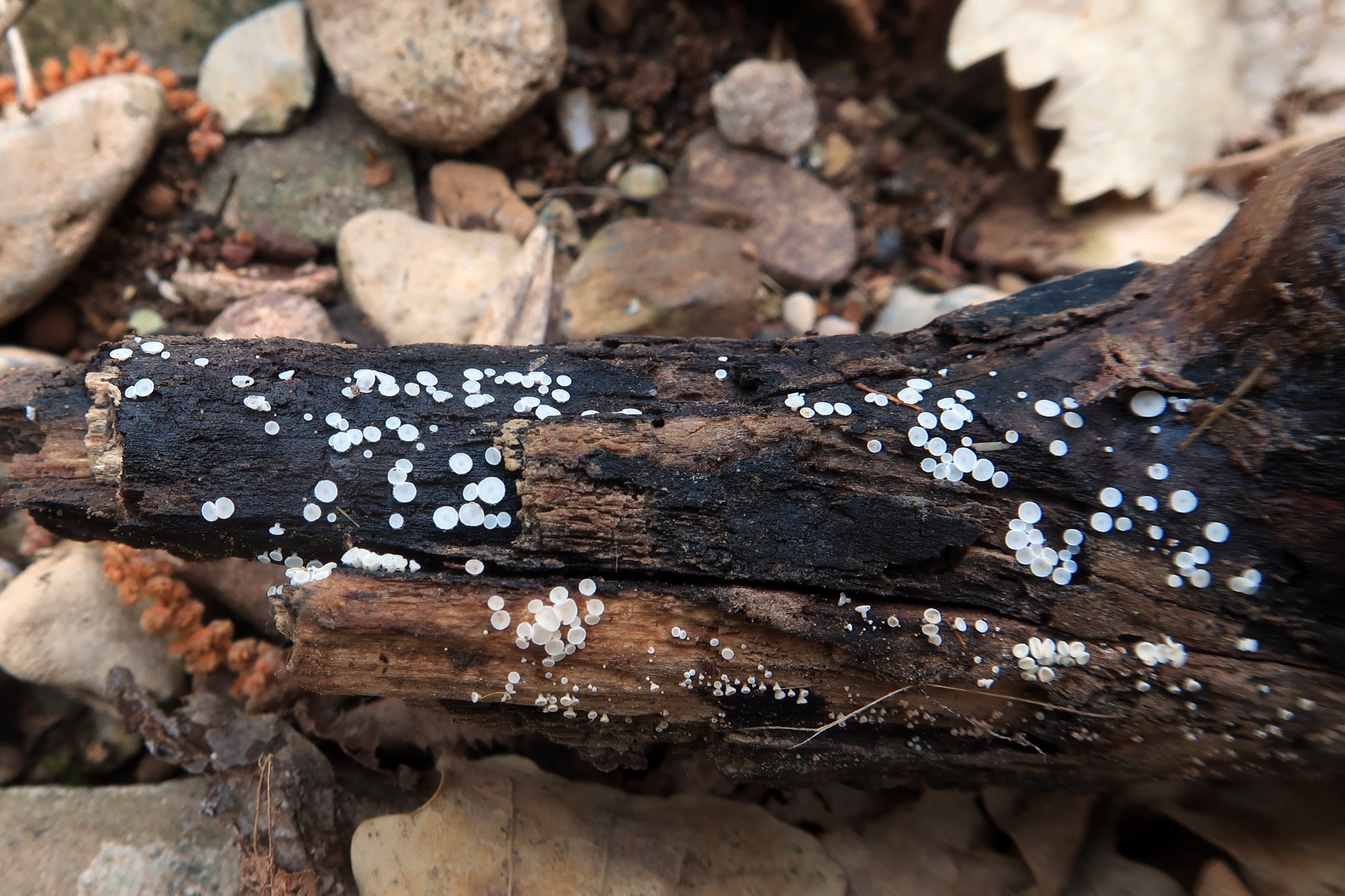 Apotecios de color blanco, con forma de disco con pie, de pequeño tamaño, (el mayor apenas llegaba a los 2 mm.), brotando de manera dispersa pero abundante sobre la superficie del tronco.