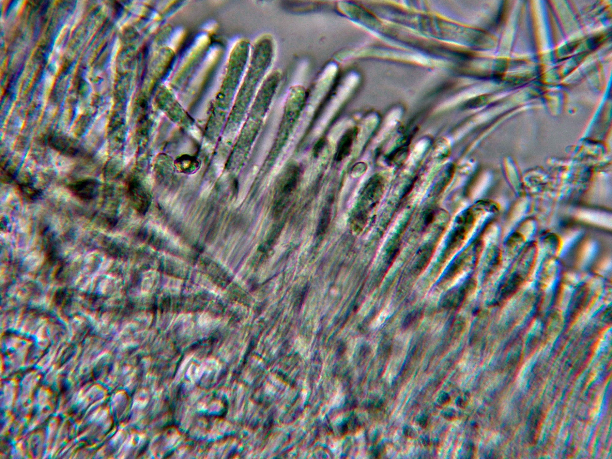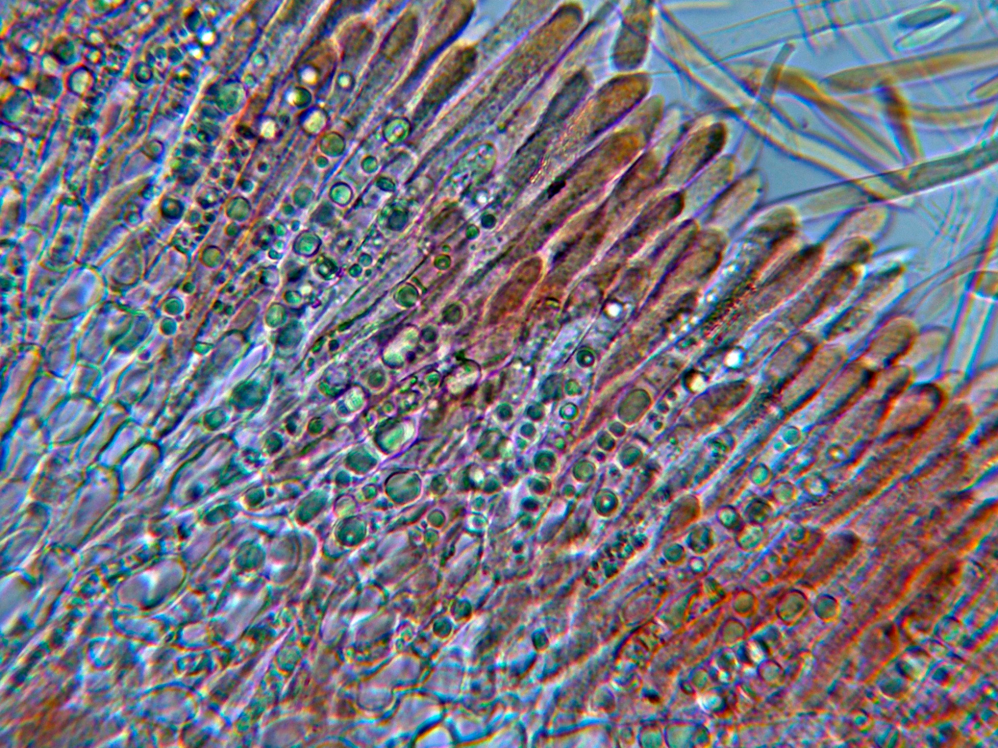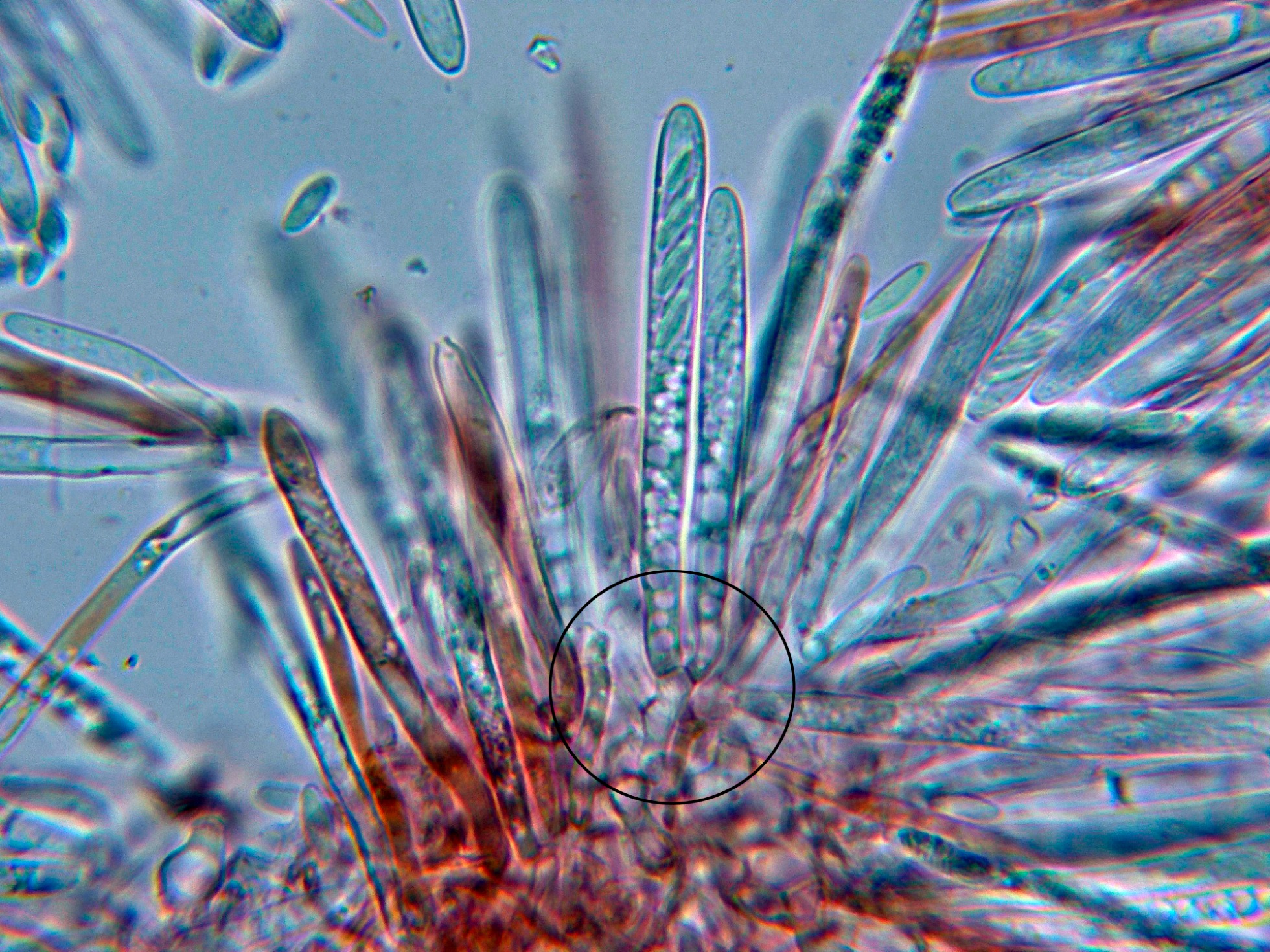 Paráfisis que sobresalen poco por encima del nivel de los ascos, muchas de ellas con contenido vacuolar en su interior.