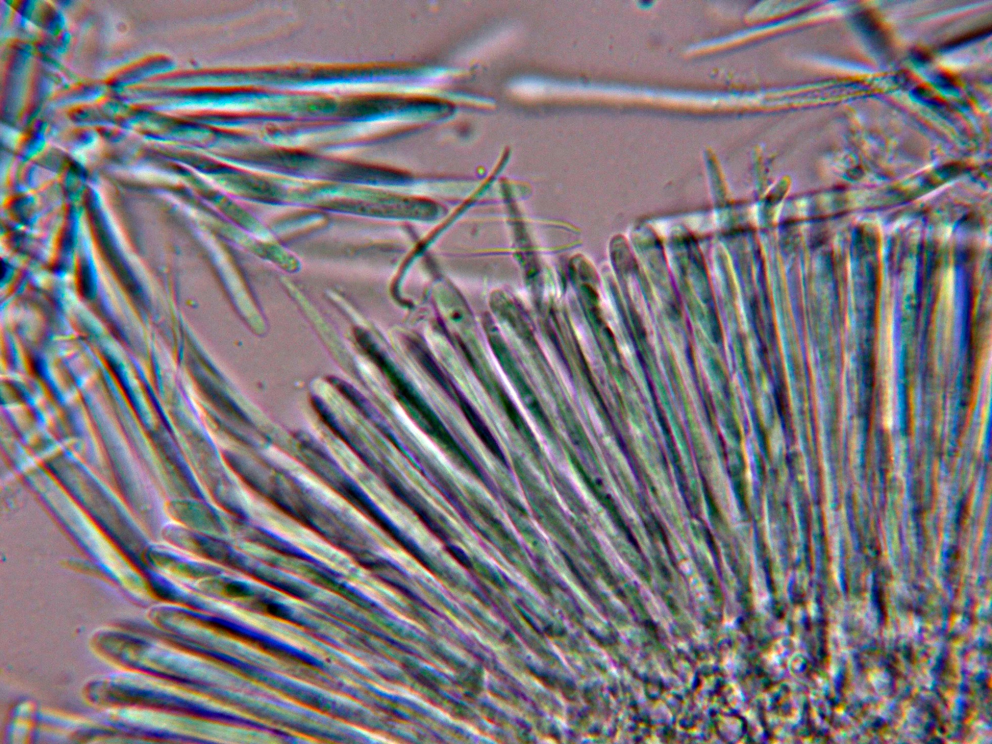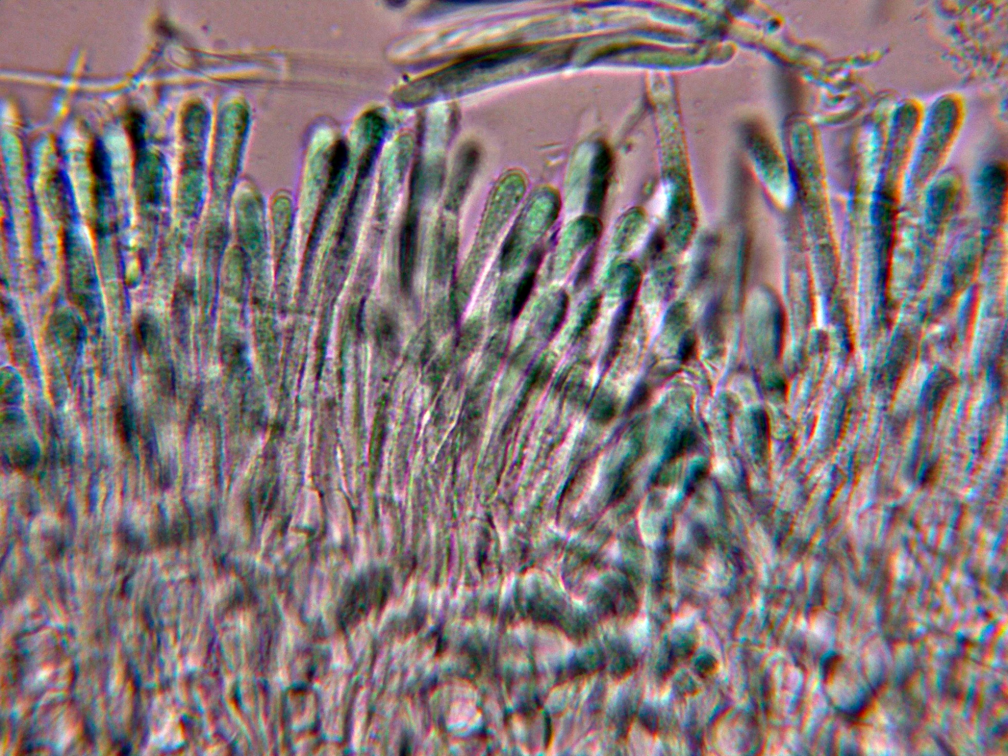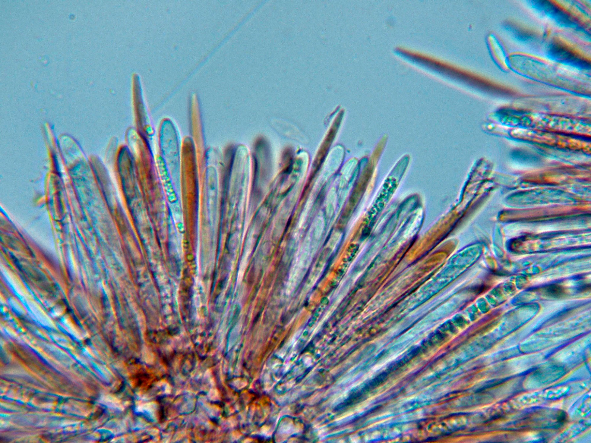 Paráfisis que sobresalen poco por encima del nivel de los ascos, muchas de ellas con contenido vacuolar en su interior.