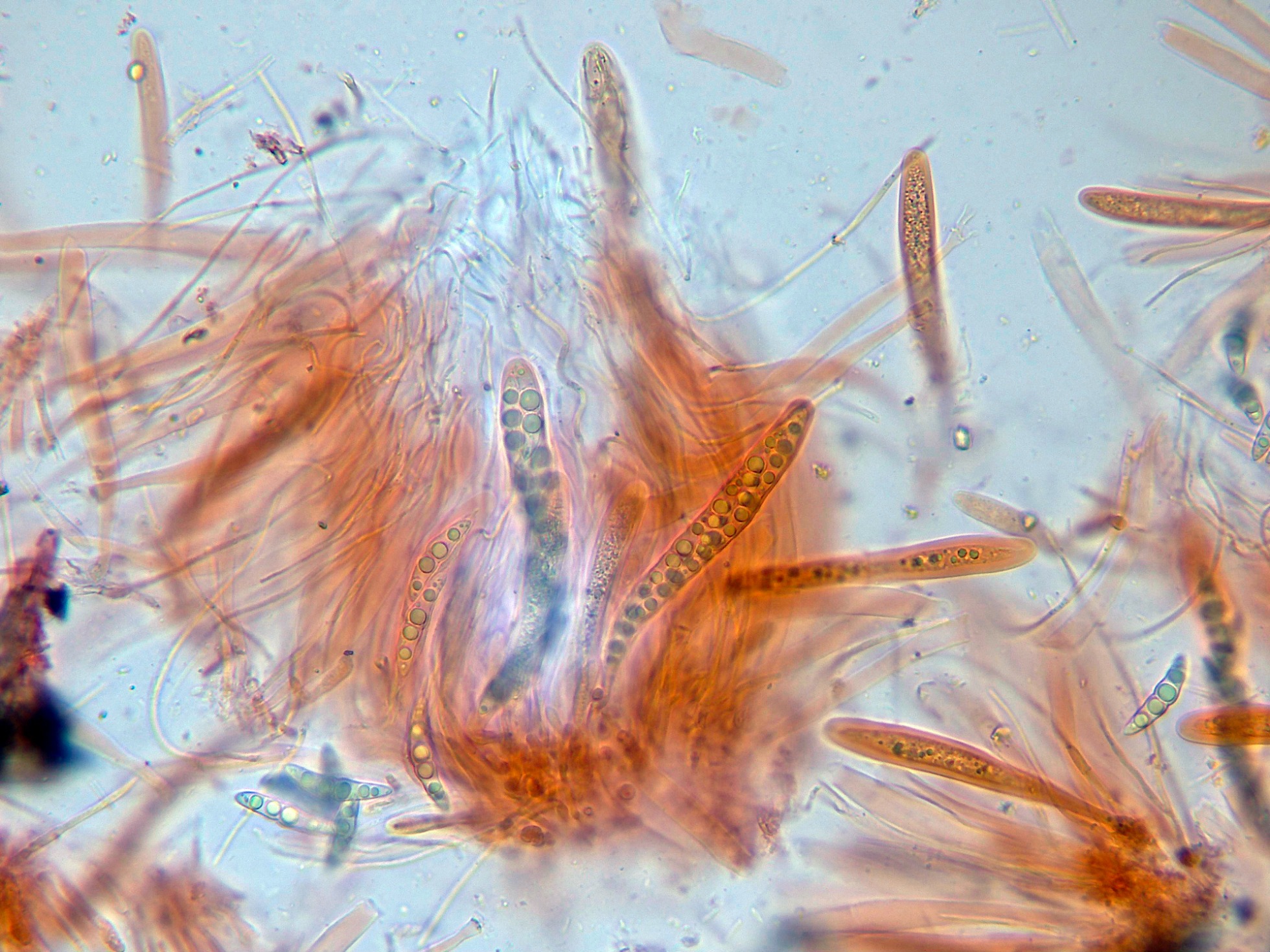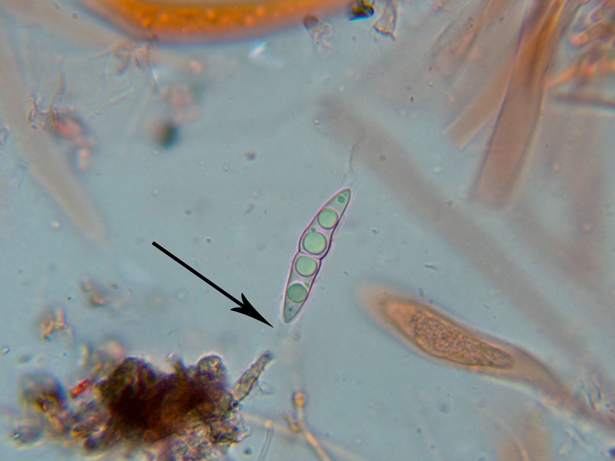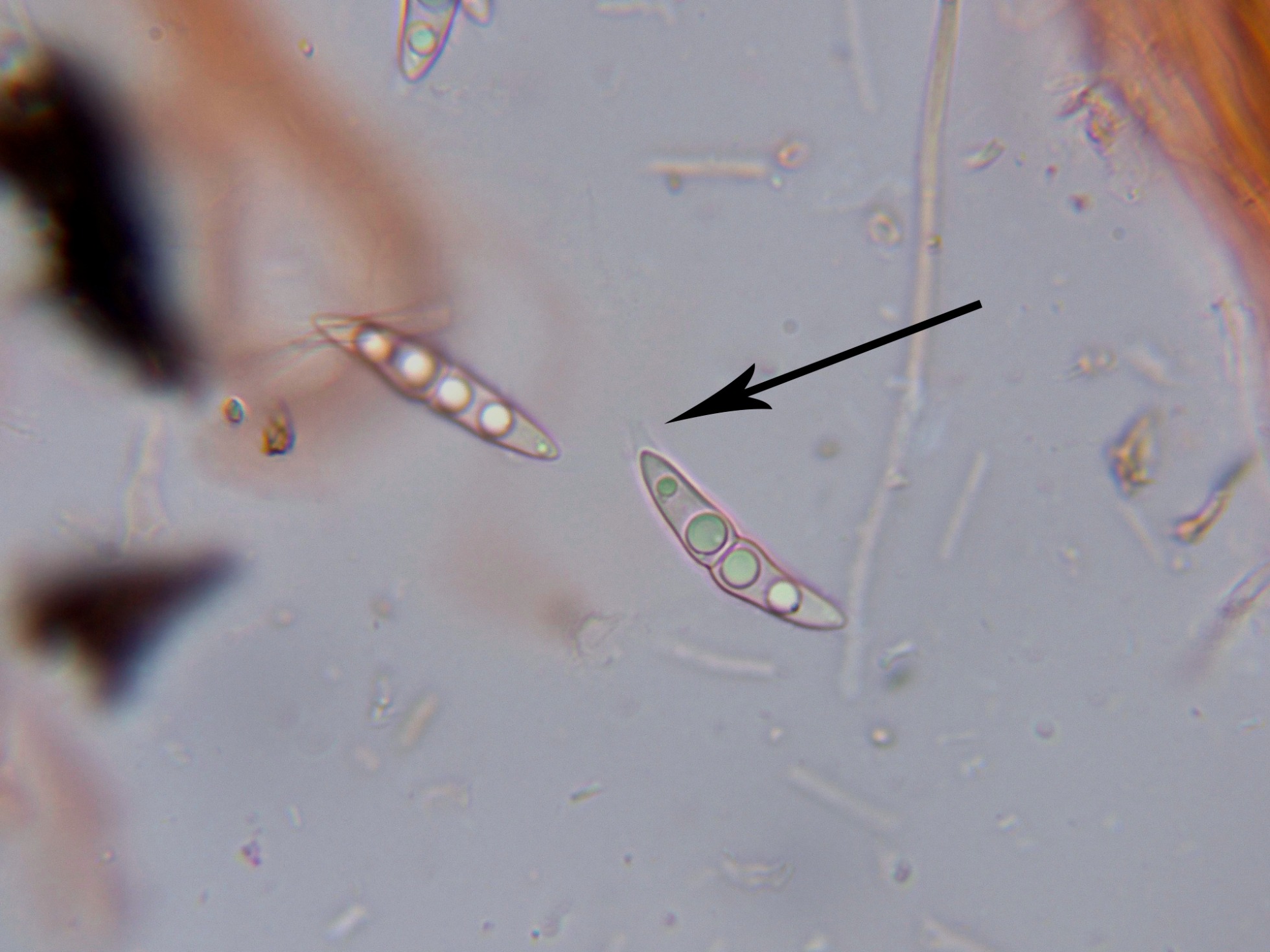 Se cita para la especie unos apéndices hialinos en los extremos de las ascosporas, tan importantes a nivel taxonómico, como difíciles de observar, adjunto unas imágenes señalando estos apéndices, de hasta 5 micras de largo.