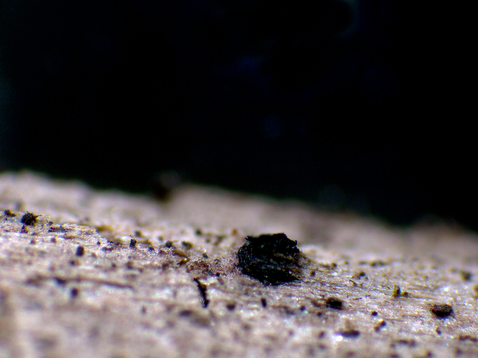 Un par de imágenes a 20 aumentos, fructificaciones negruzcas, erumpentes, a modo de granos alargados, de tan solo entre 0,4 a 0,7 mm.