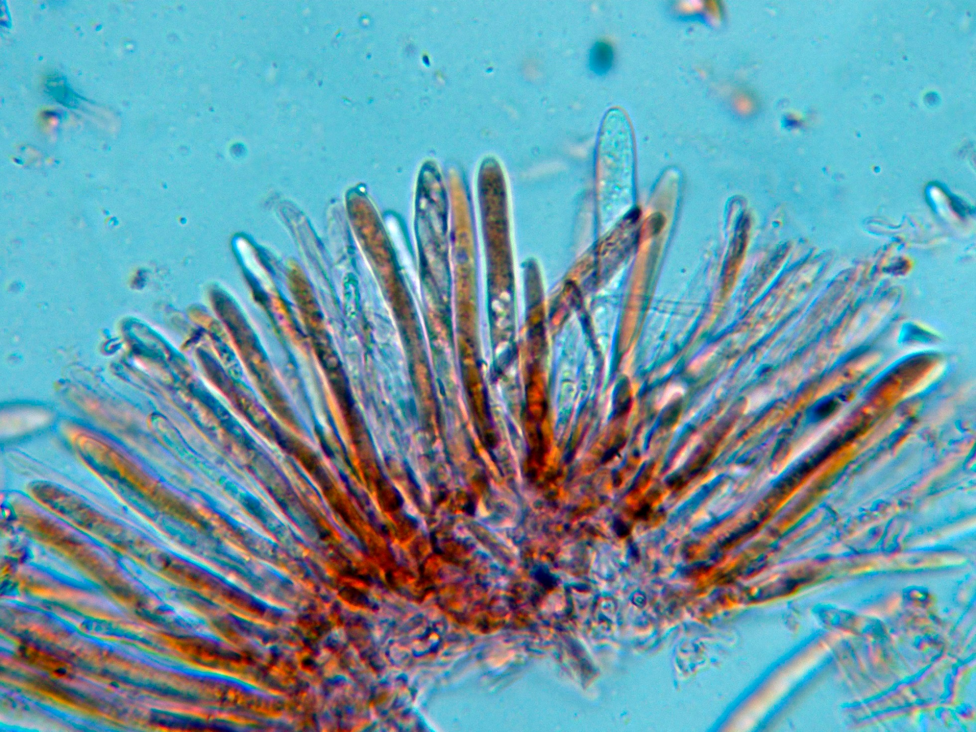 Observaciones: Determinación hecha siguiendo las claves que utilizamos todos, pero que no podemos nombrar, que sobre madera, esporas con contenido "0" de aceite, reacción del ápice de los ascos "bb", células marginales poco visibles y esporas con un tamaño de 7-12 x 2,5-3 µm, conducen irremediablemente a la Mollisia cinerea propuesta.