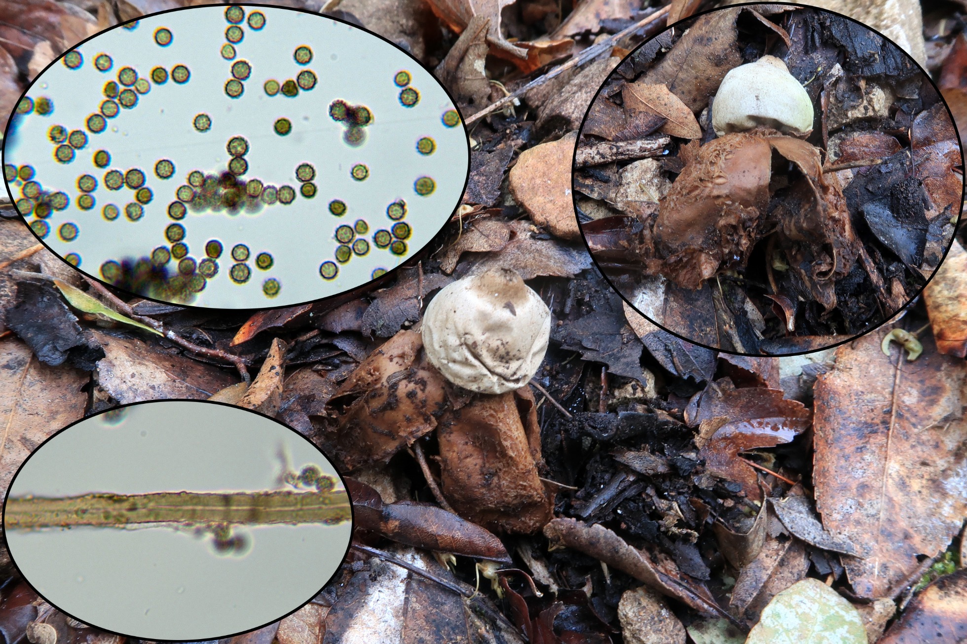 Un Geastrum, lo más parecido que pude encontrar a lo que se entiende como seta, gleba sin pie, perisporio fimbriado, no sulcado, capilicio de paredes gruesas y esporas con unas medidas de (3.2) 3.4 - 4 (4.5) × (3.1) 3.3 - 3.9 (4.1) µm., no parece ser otro que un Geastrum fimbriatum, un poco pasado.