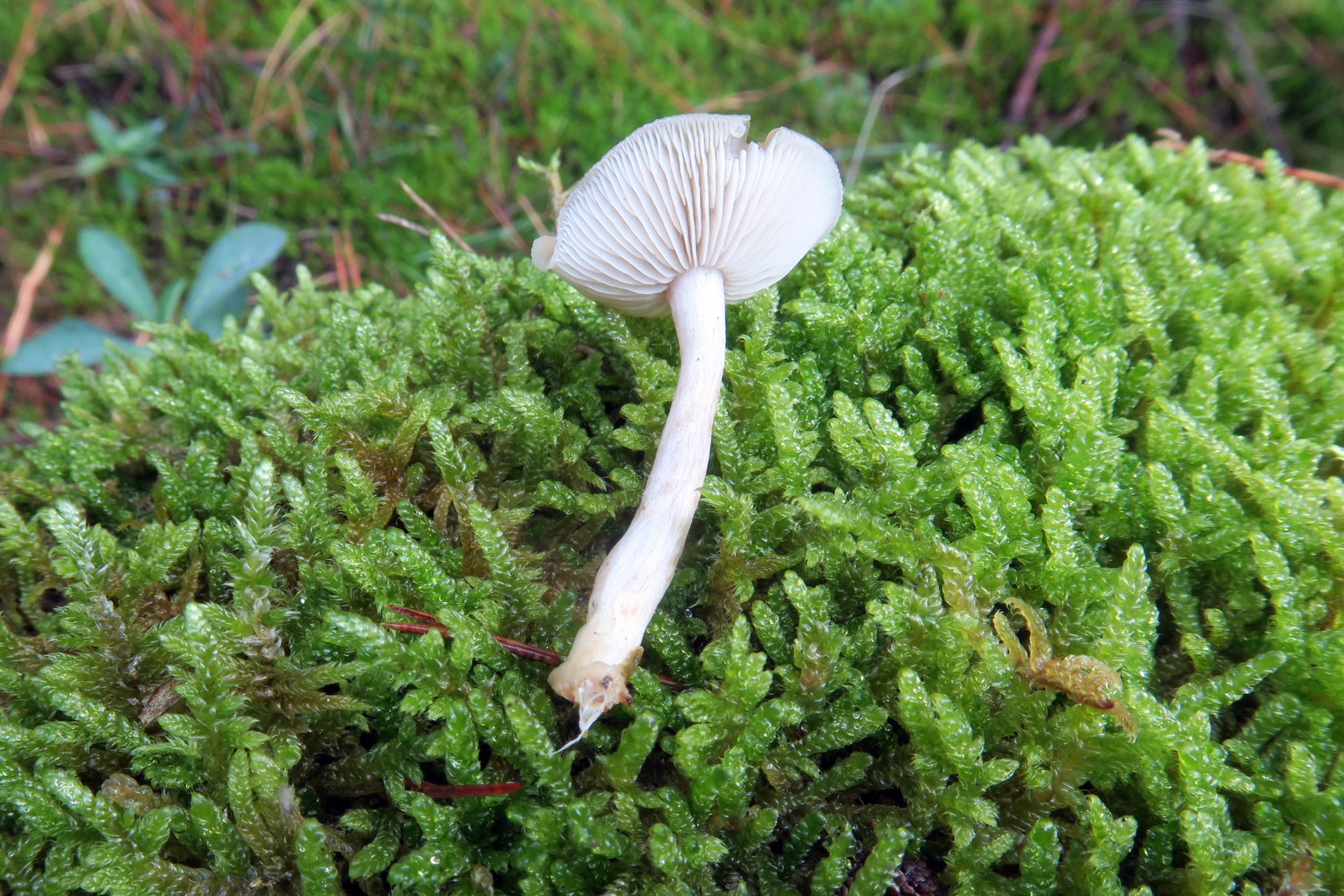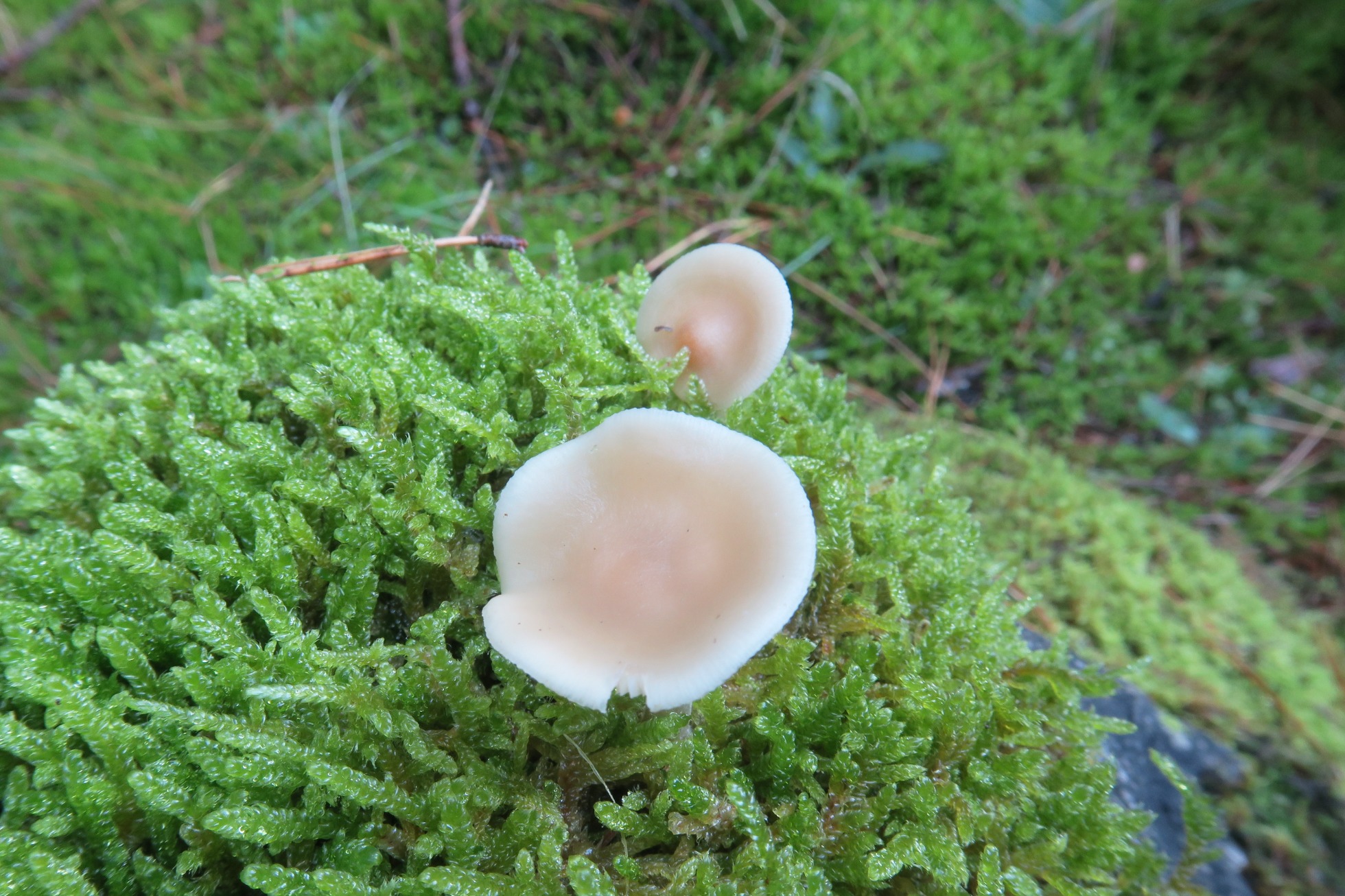 Un Clitocybe del 6 de Noviembre de 2022, bajo pinos y brotando sobre el musgo de un tocón.