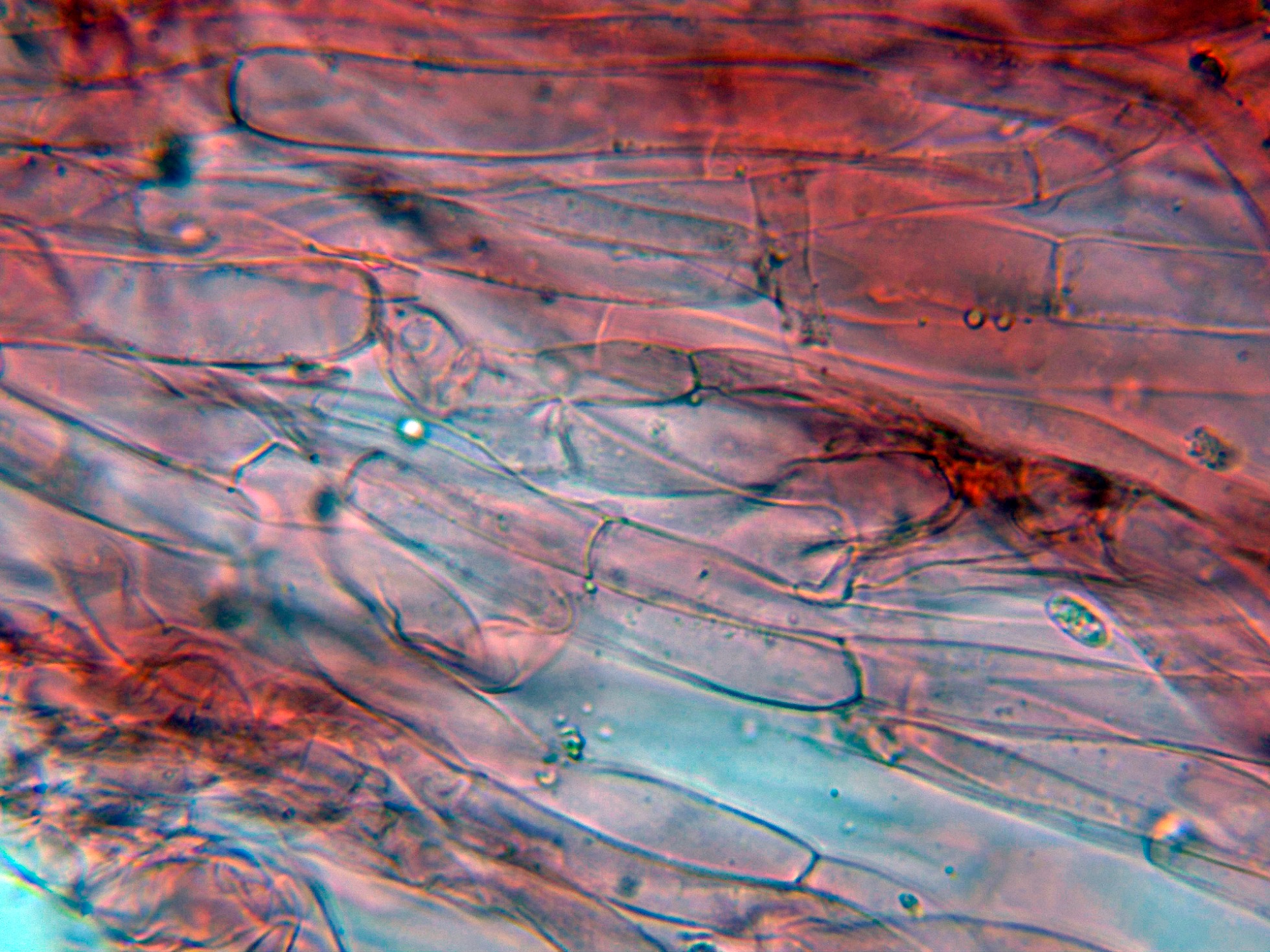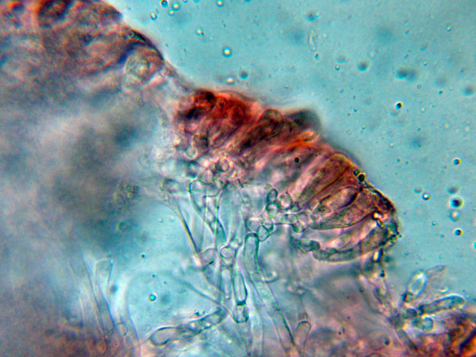 Suprapellis en Rojo Congo con hifas dispuestas más o menos paralelamente y con algunas margadas fíbulas.