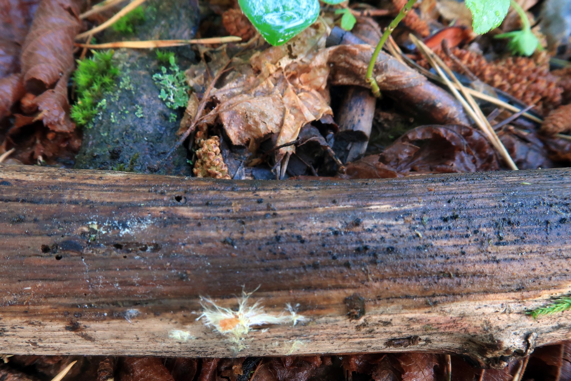 Sobre la superficie de un tronco descortezado, de la recogida de muestras del pasado domingo, tenemos un hongo Helicosporoide, probablemente: