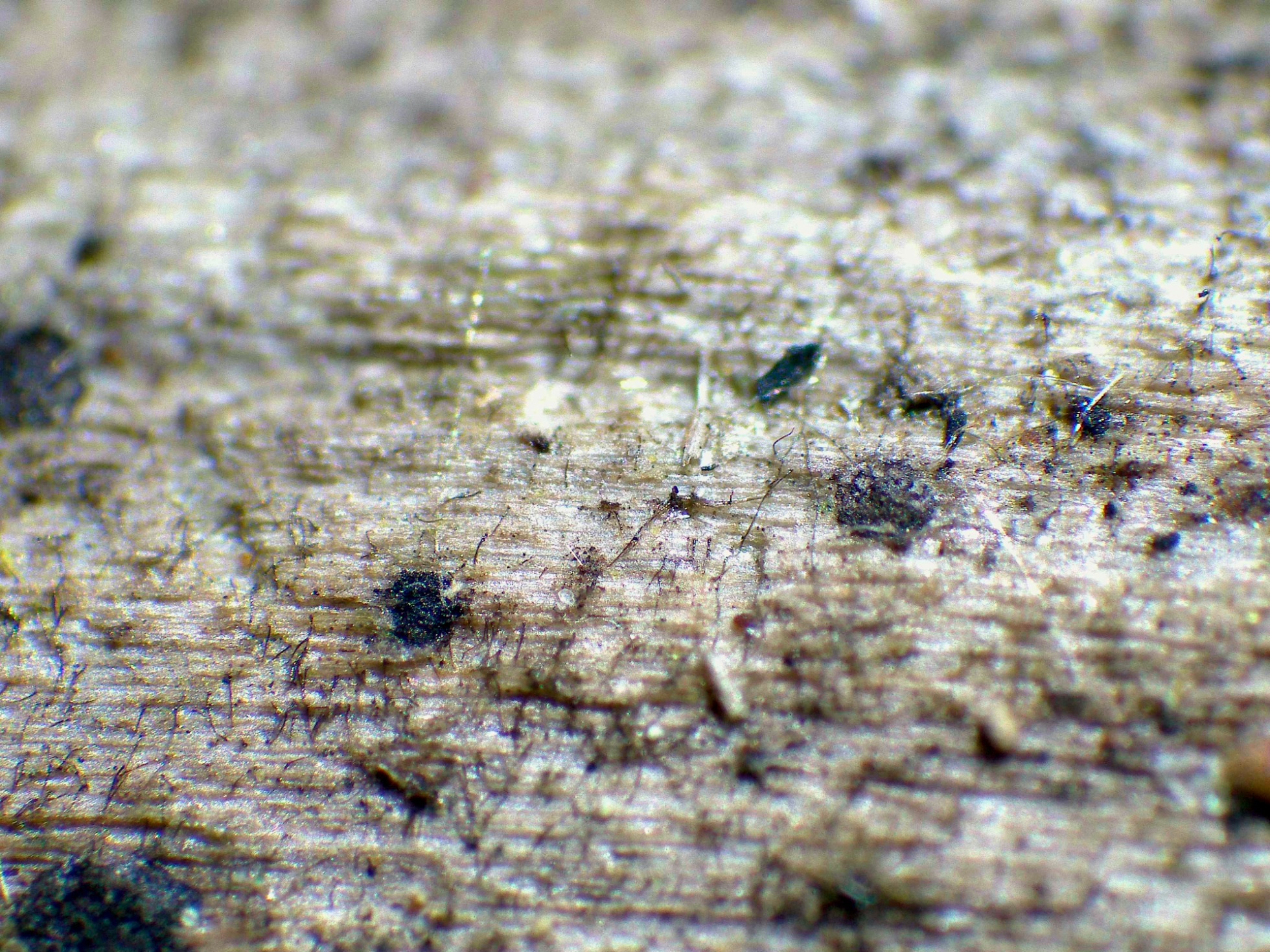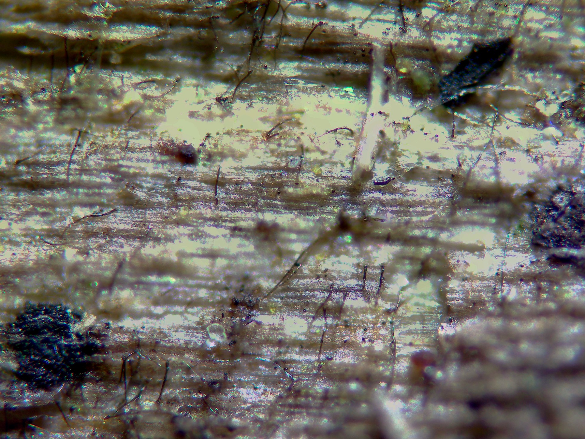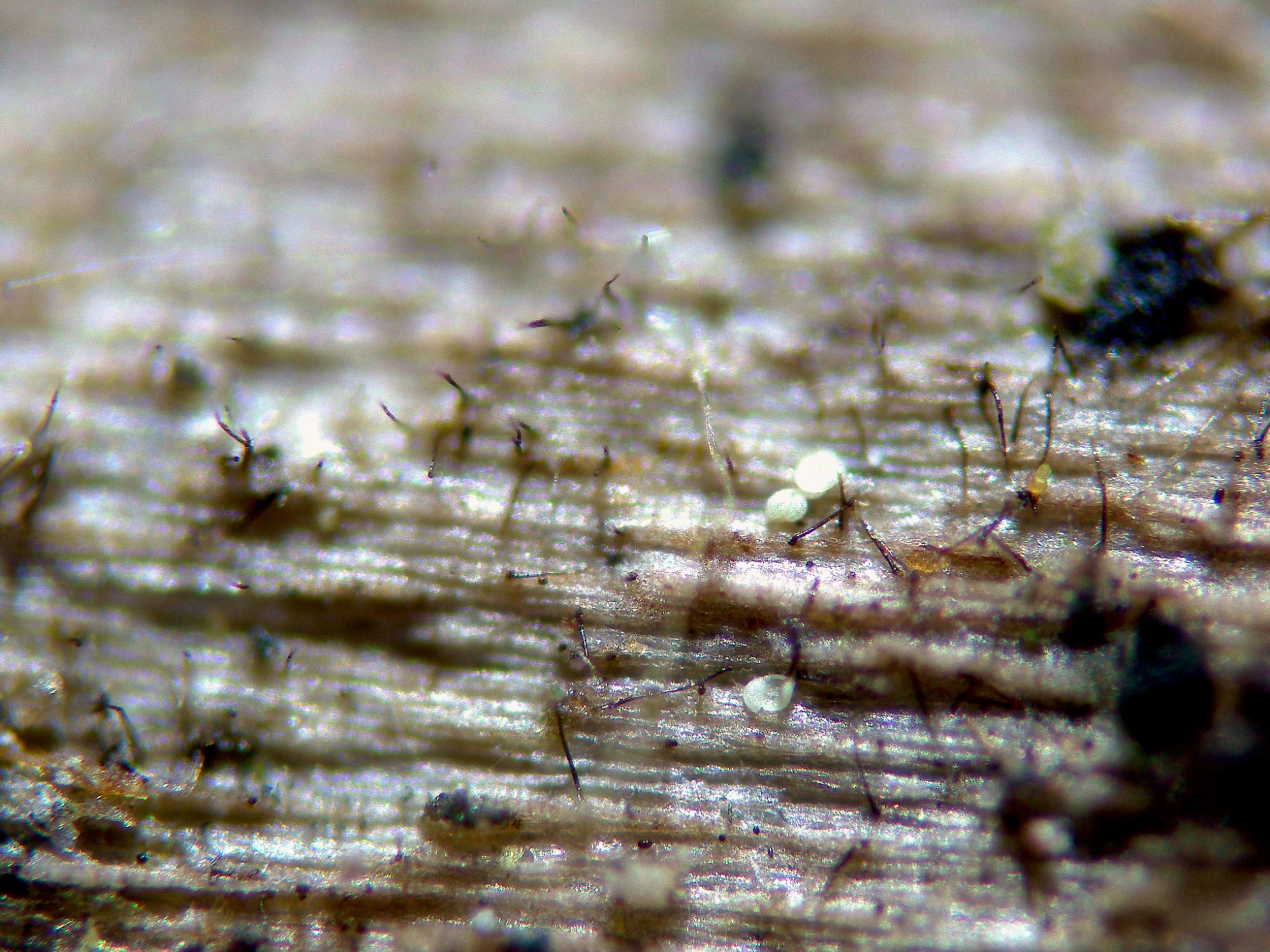 Ampliación a 100 aumentos en la superficie del tronco con los supuestos conidióforos.