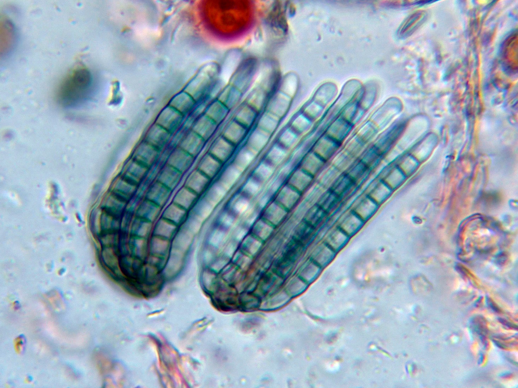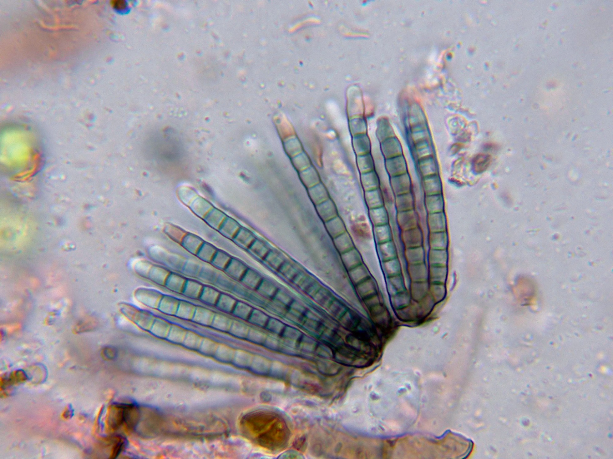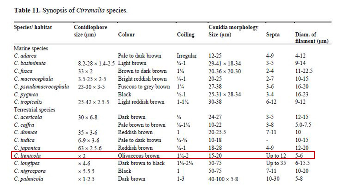 Encaja bastante bien el color pardo oliváceo de los conidios, así como las medidas, el número de septos que en mi estudio es de 6 a 12 y la anchura de los filamentos, lo único que me hace dudar es la morfología tan cilíndrica de los conidióforos, que debería ser más ensanchada en la base para ir decreciendo paulatinamente en anchura, por el dato de los conidióforos más o menos cilíndricos he considerado un posible Zalerion spp., pero aquí lo que ya no encaja ni de coña son las medidas y septos de los conidios, por lo que lo he dejado abierto como la opción más probable es decir Cirrenalia cf. lignicola.