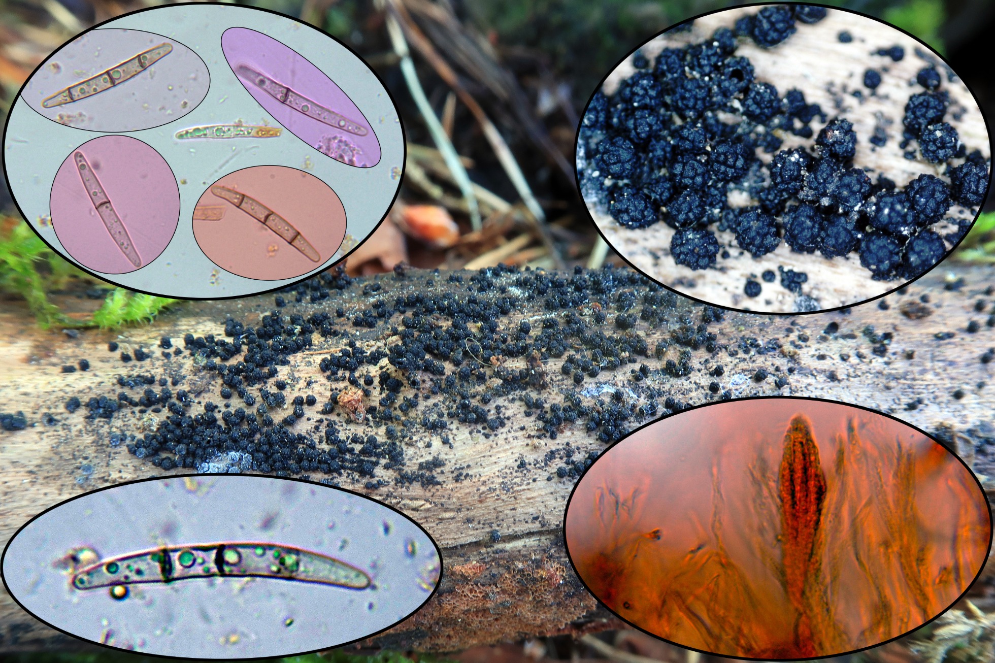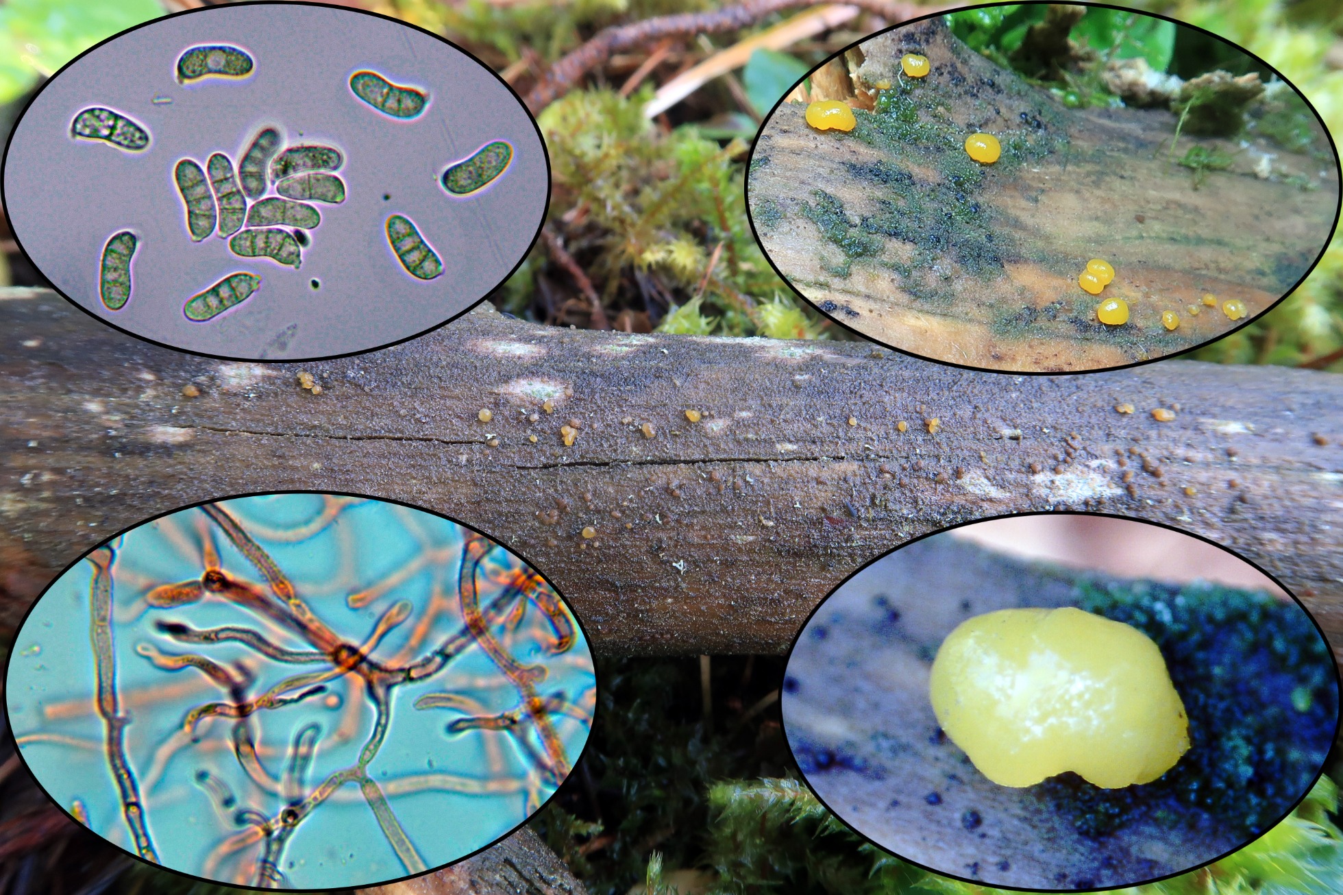 El Dacrymyces que se encontraba al lado del Exarmidium inclusum que he presentado recientemente, con hifas sin fíbulas, esporas con uno a tres septos y unas medidas de (13.6) 14.7 - 16.2 (16.9) × (5.1) 5.5 - 6.2 (6.4) µm., sin ningún género de duda se trata del Dacrymyces stillatus.