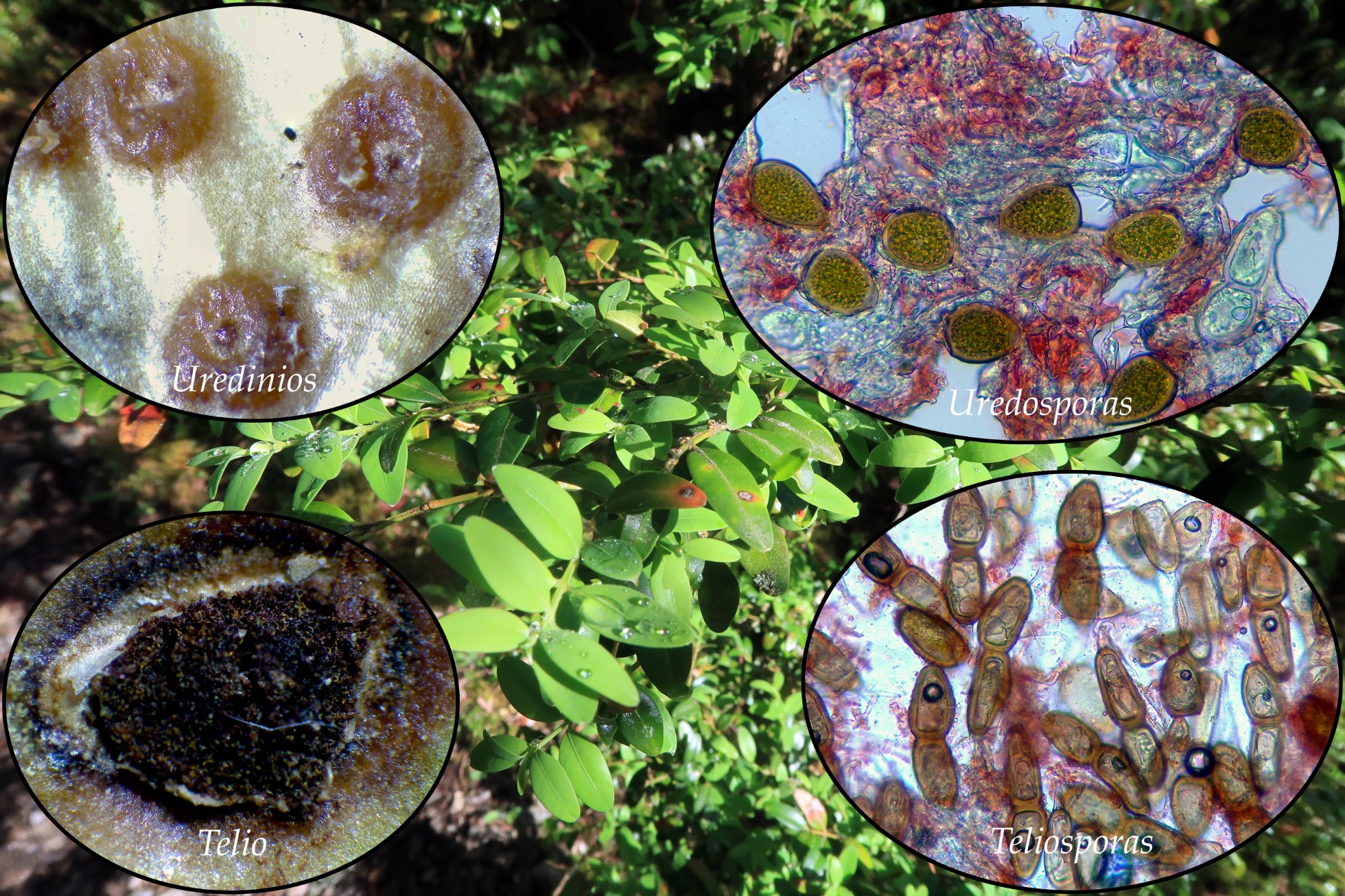 Y por último, todo un clásico, sobre Buxus sempervirens, la Puccinia buxi, en esta ocasión por primera vez parece que he podido localizar la fase previa a la formación de los telios, es decir los uredinios.