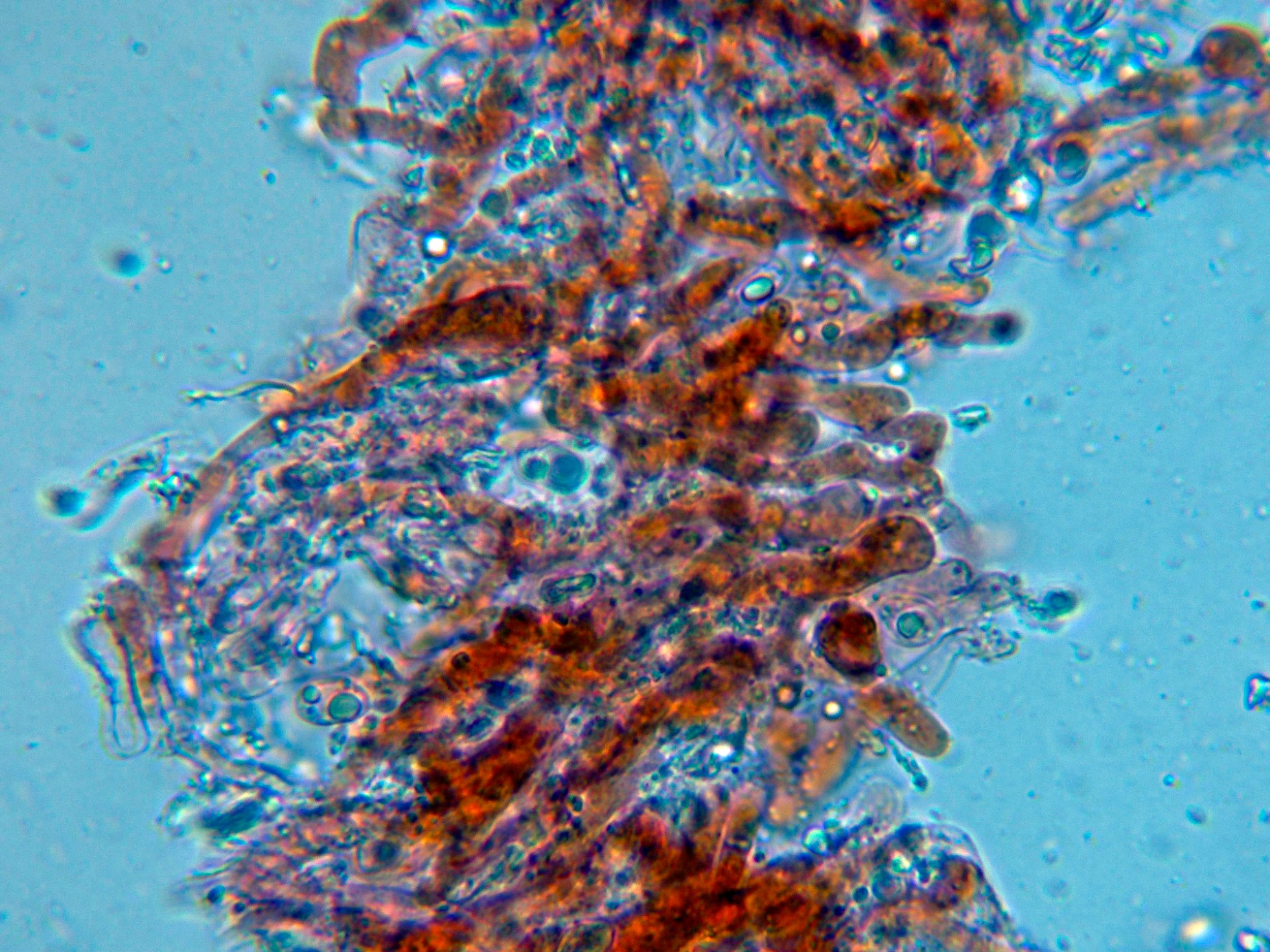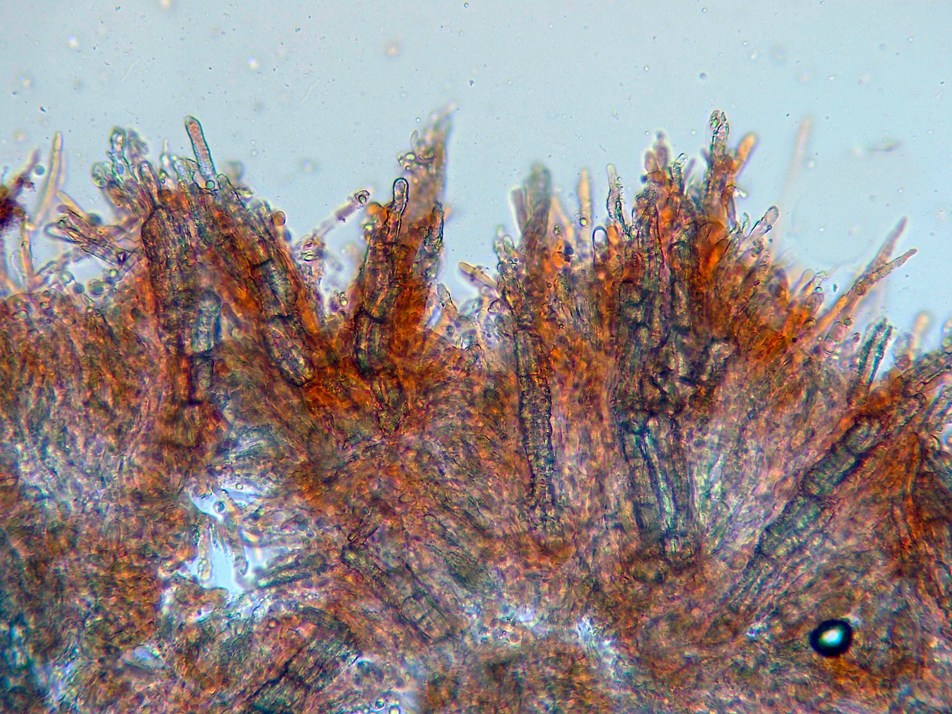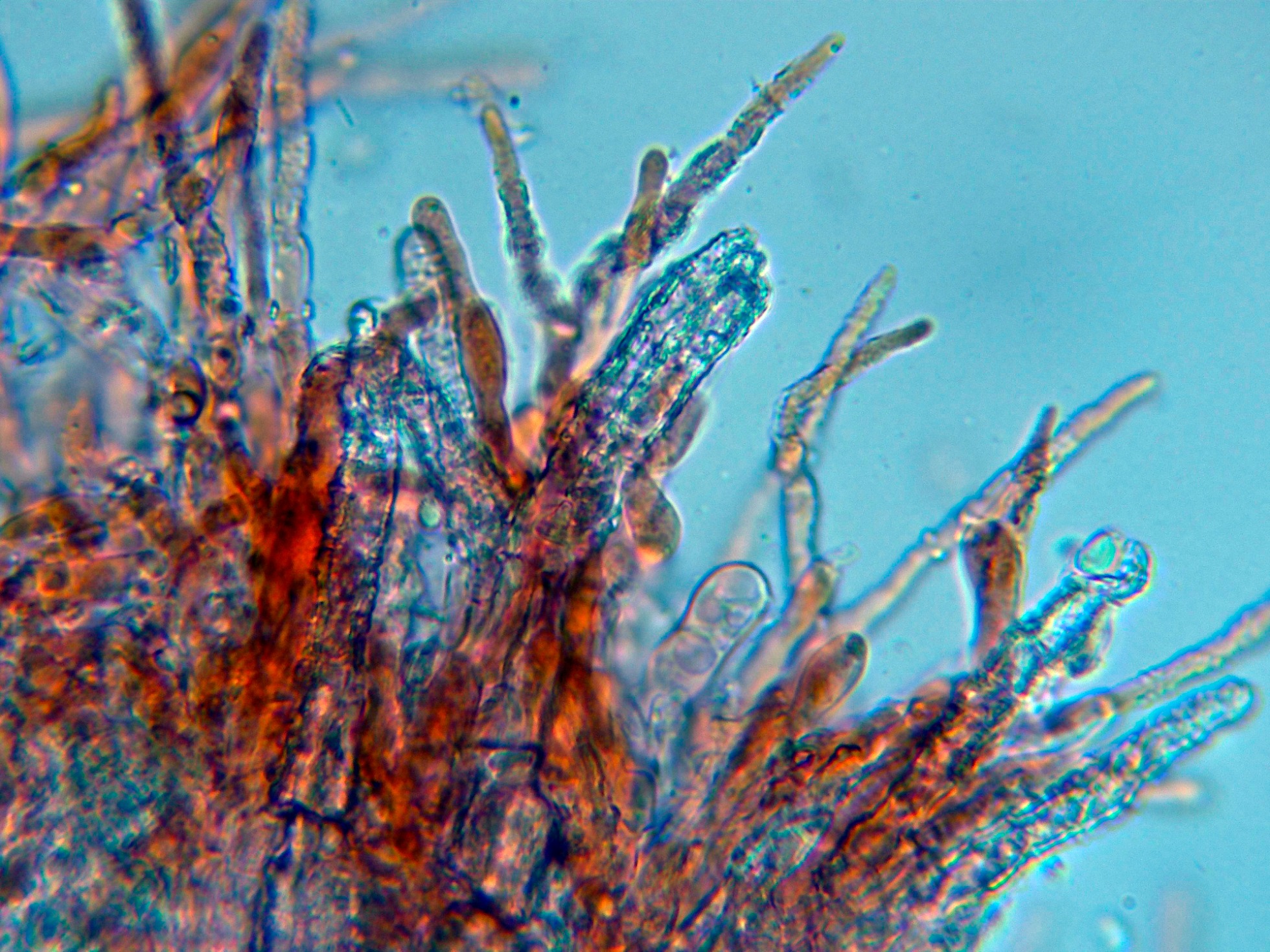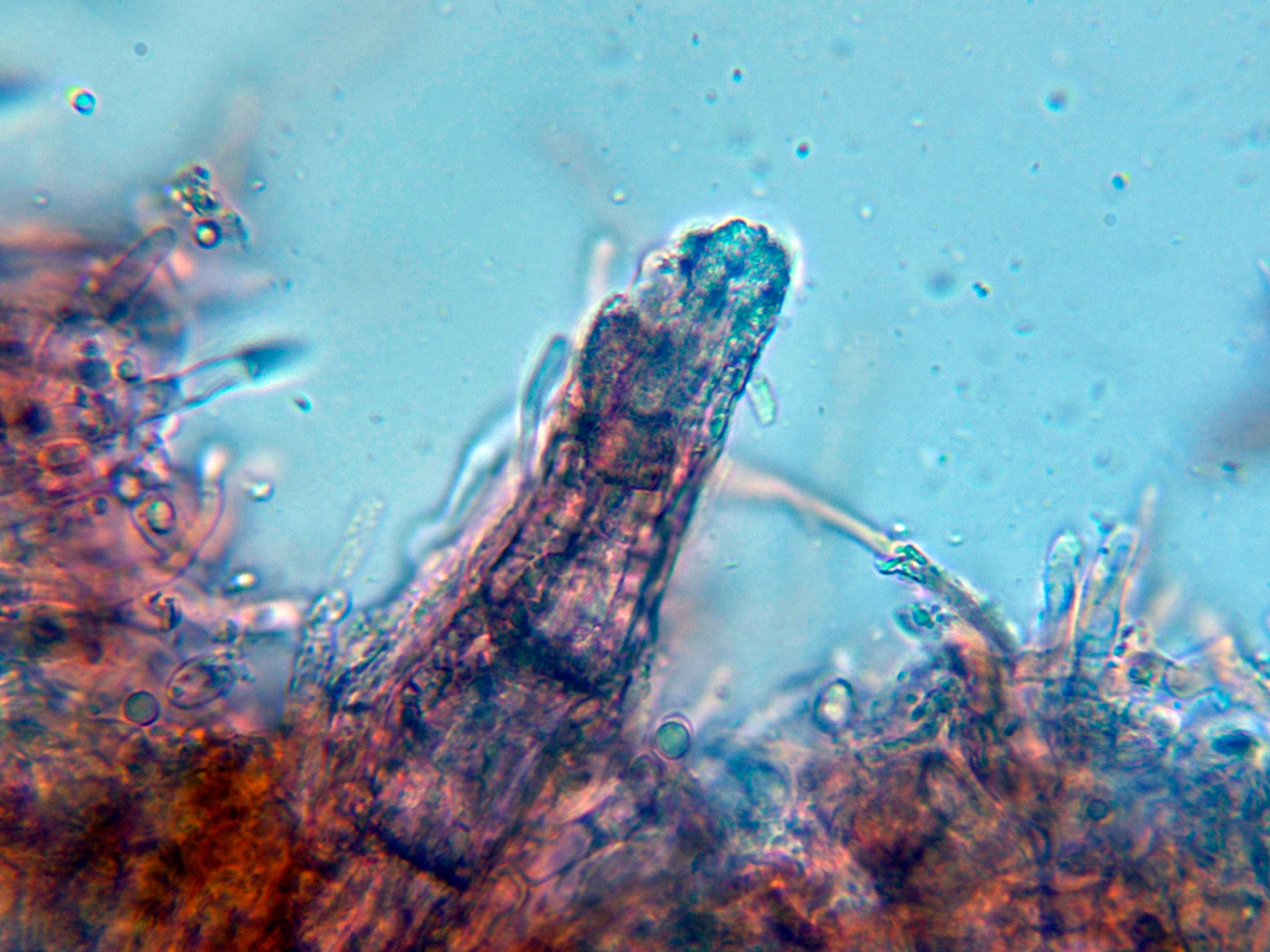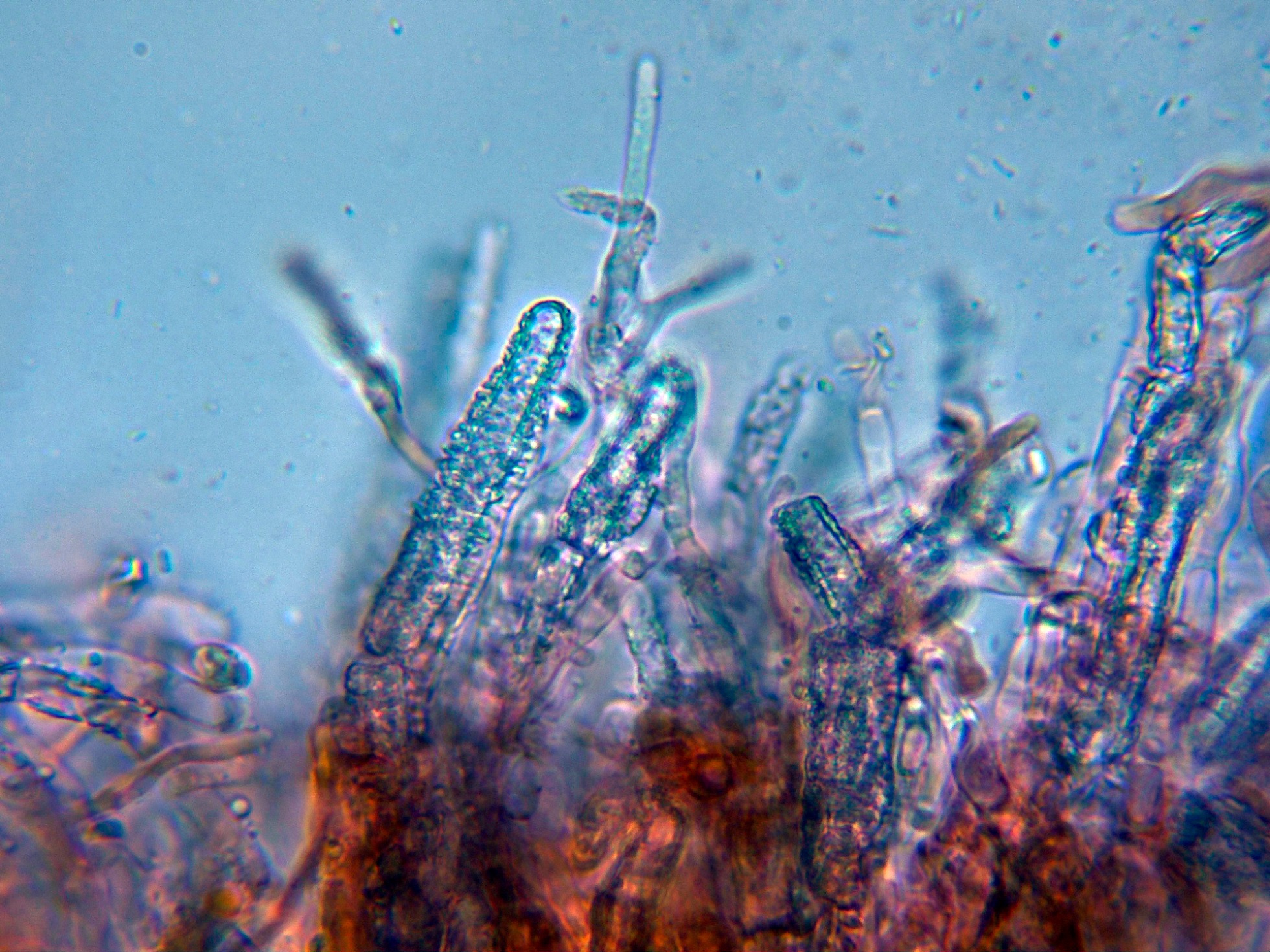 Aunque los autores definen la especie sin cistidios, si que se observan en las muestras unas prolongaciones de hifas con cristalizaciones por encima del nivel del himenio, a modo de pseudocistidios.
