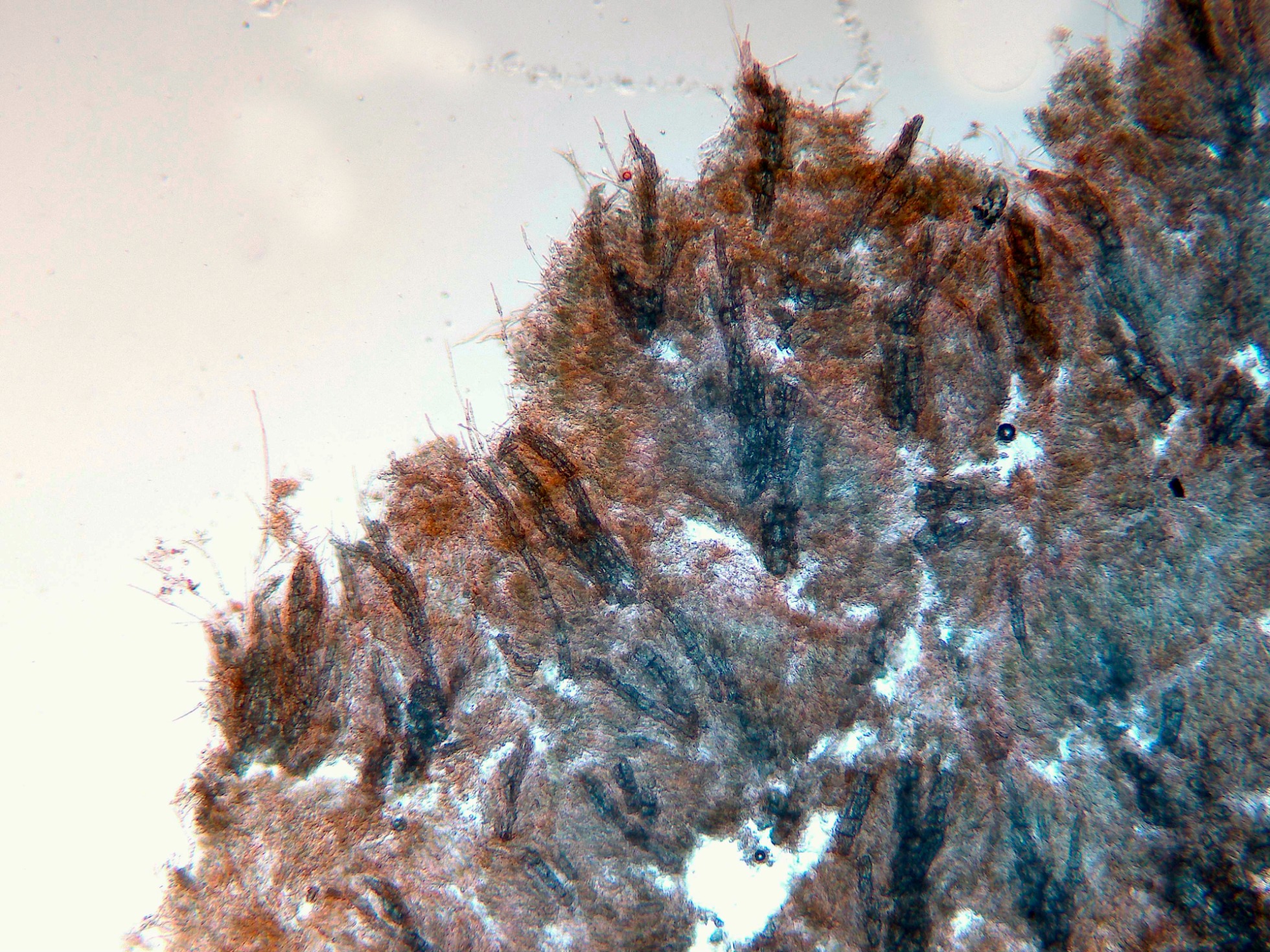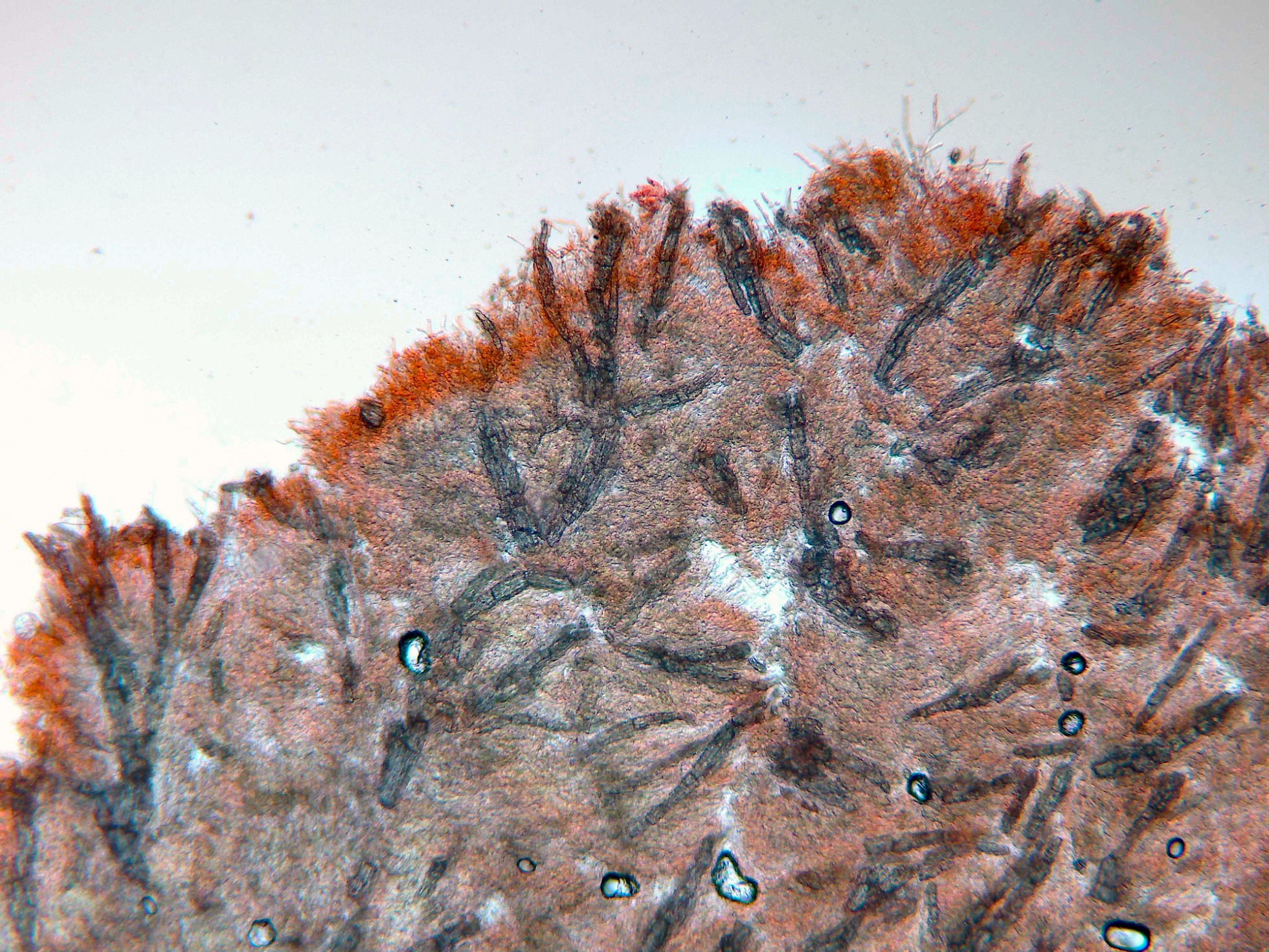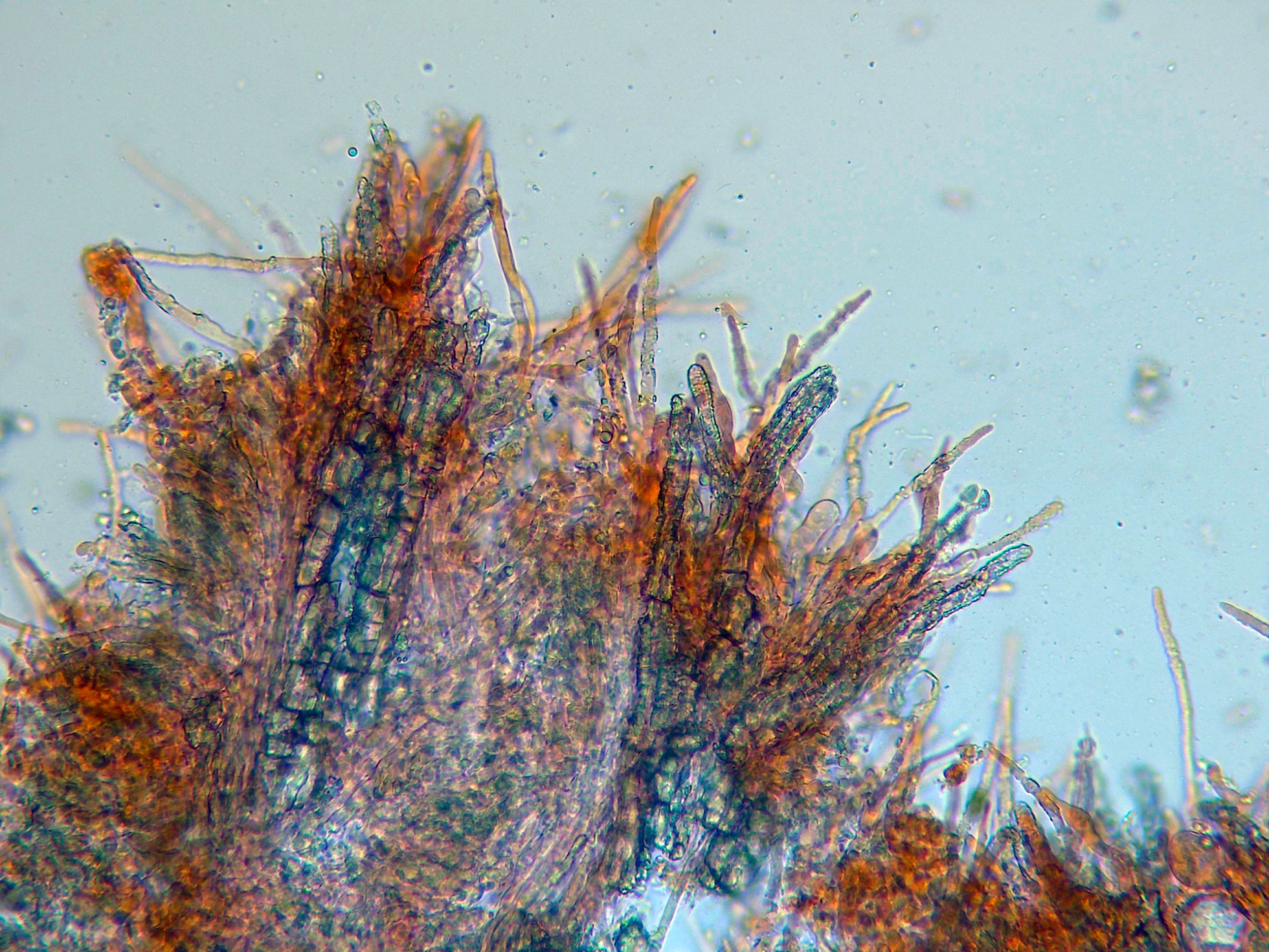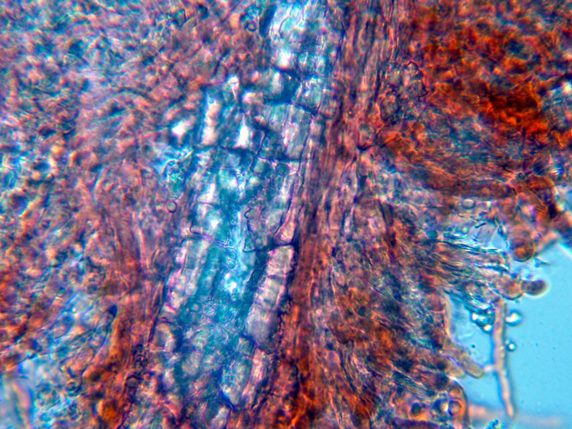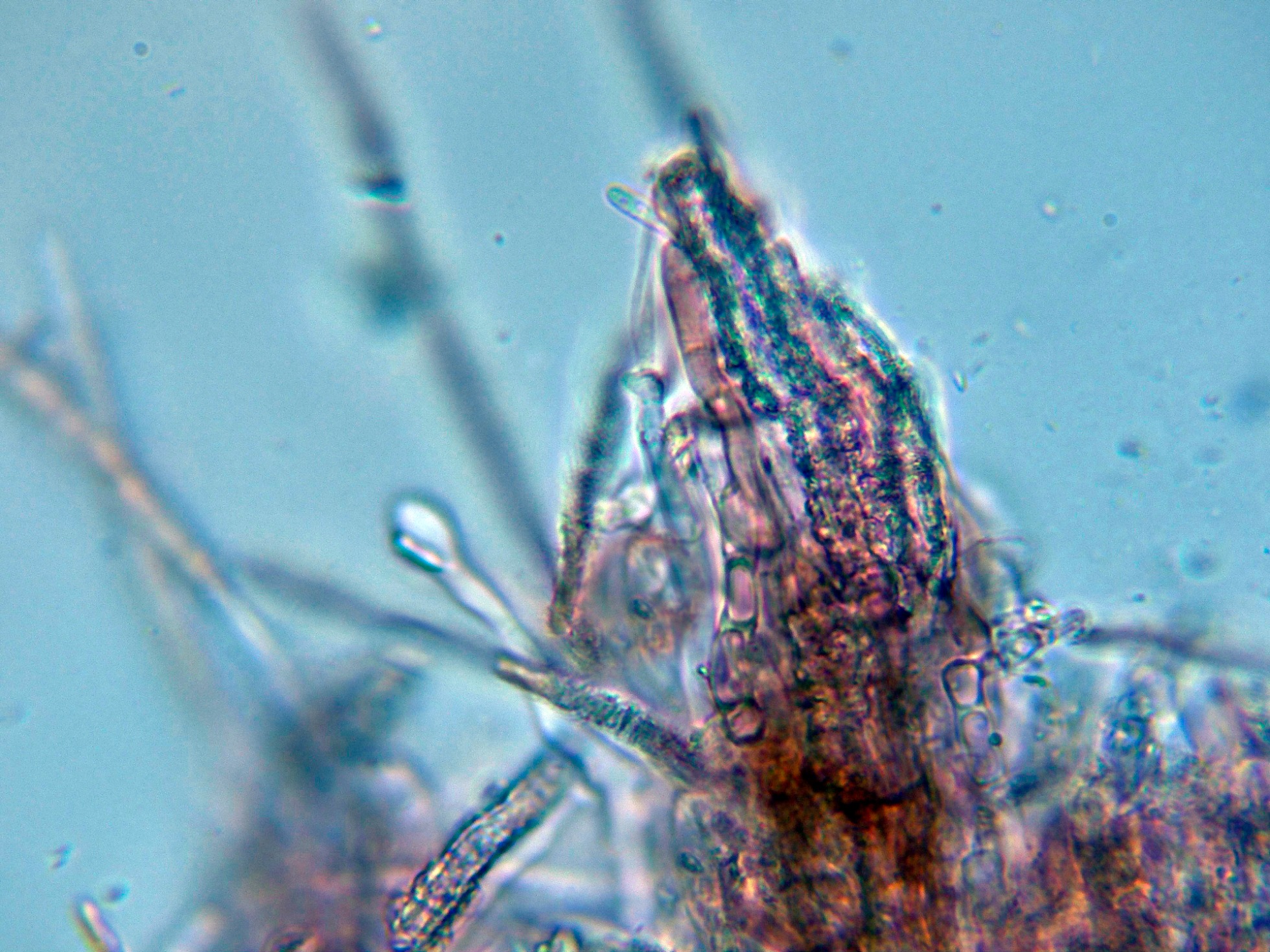 Aunque los autores definen la especie sin cistidios, si que se observan en las muestras unas prolongaciones de hifas con cristalizaciones por encima del nivel del himenio, a modo de pseudocistidios.