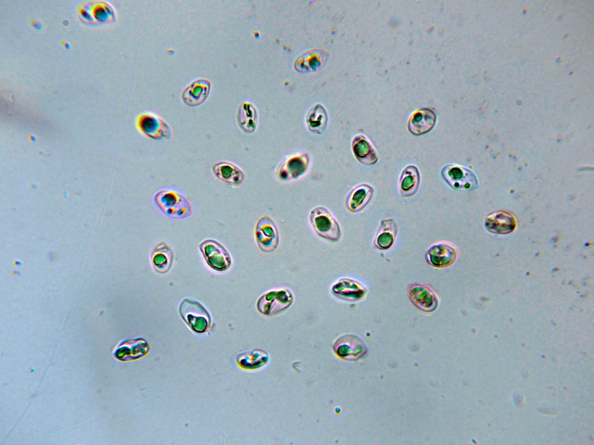 Medidas ligeramente por debajo a las que se atribuyen a la especie, probablemente debido a estar obtenidas de manera forzada, según bibliografía de 8-11x 5-6 um..