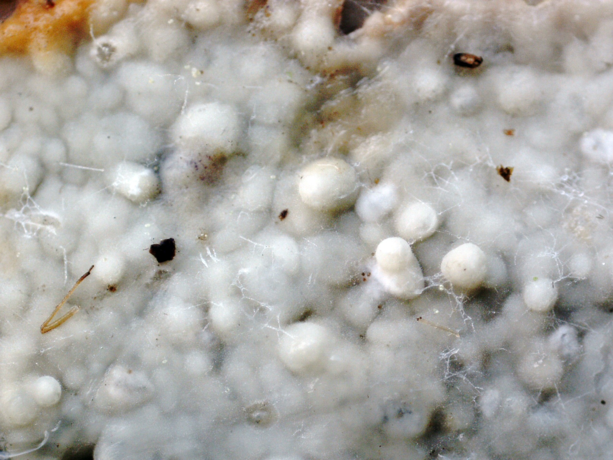 De consistencia cérea y poco grosor, a 20 aumentos se observa una superficie algo granulosa, aunque no se corresponde a la especie sino a las irregularidades del tronco huésped, ya que de grosor no llega ni de lejos al medio milímetro.