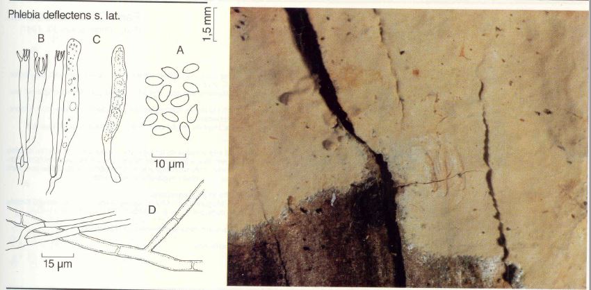 Observaciones: Determinación hecha siguiendo el criterio de "Les Champignons de Suisse" Tomo 2 Nº 173, donde se indican para la Phlebia deflectens = Efibulella deflectens unas medidas de los cistidios de 45-60 x 4,5-6 µm. unos basidios de hasta 45 µm. y unas medidas esporales de 4-5,5 x 2,3-3 um,, parámetros totalmente acordes a los de este estudio.