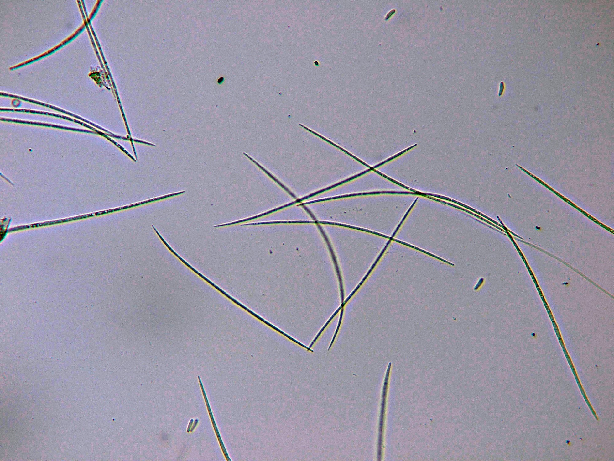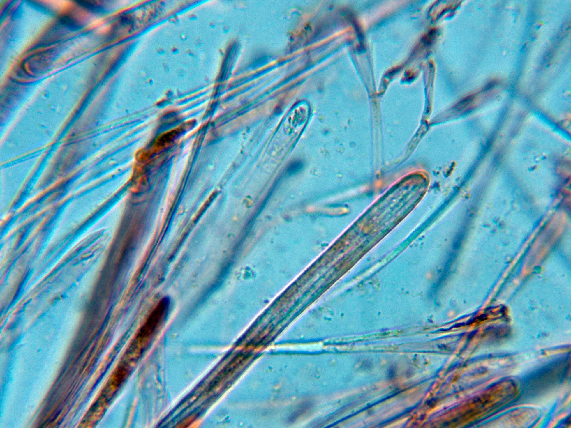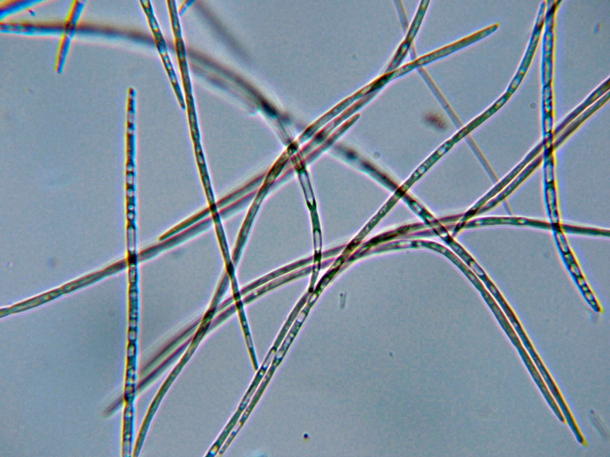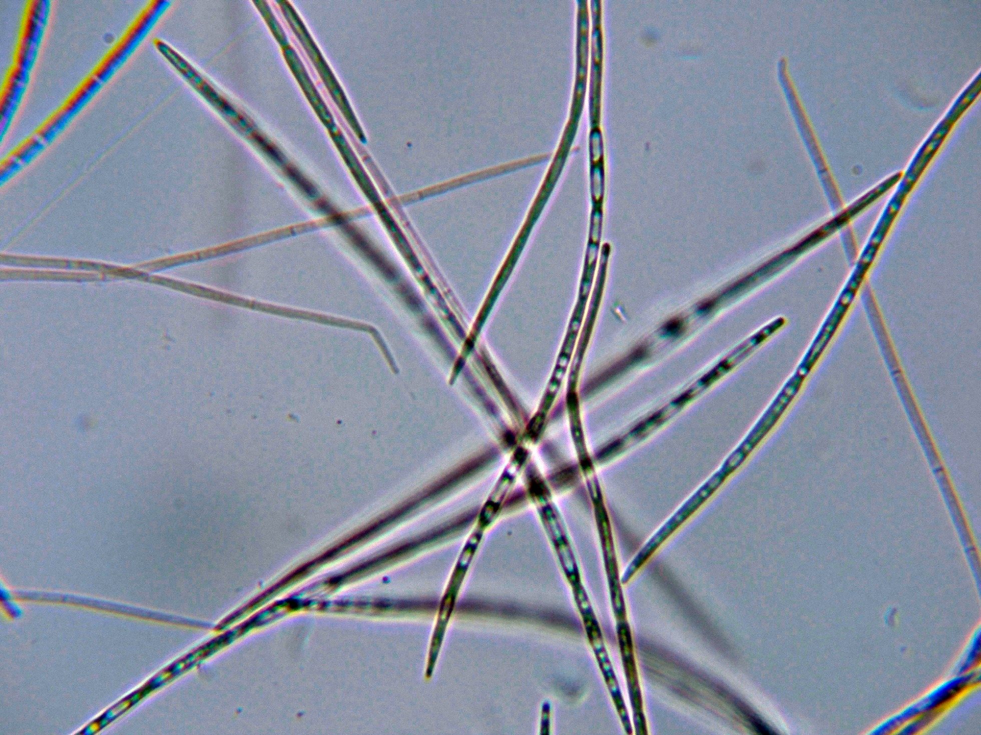 A 40 aumentos con las esporas saliendo (son los pequeños hilillos blancos).