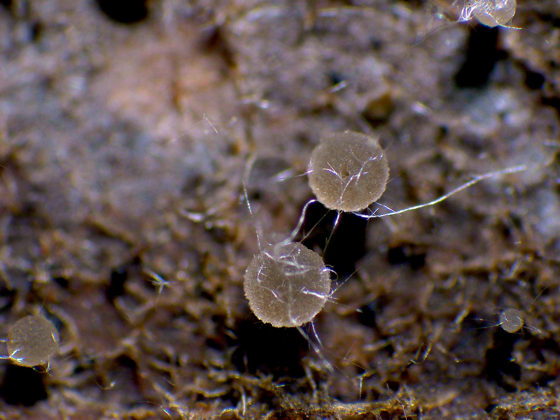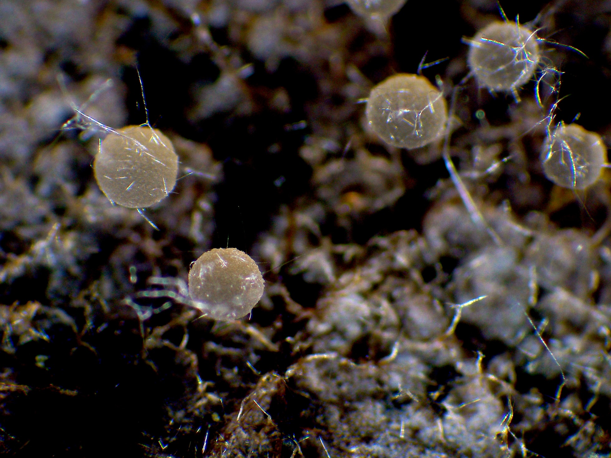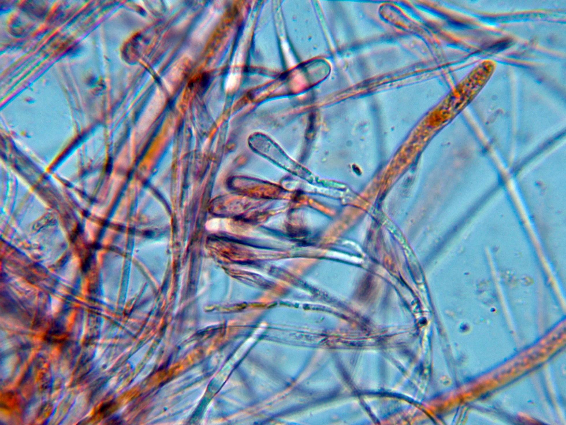 A 40 aumentos con las esporas saliendo (son los pequeños hilillos blancos).