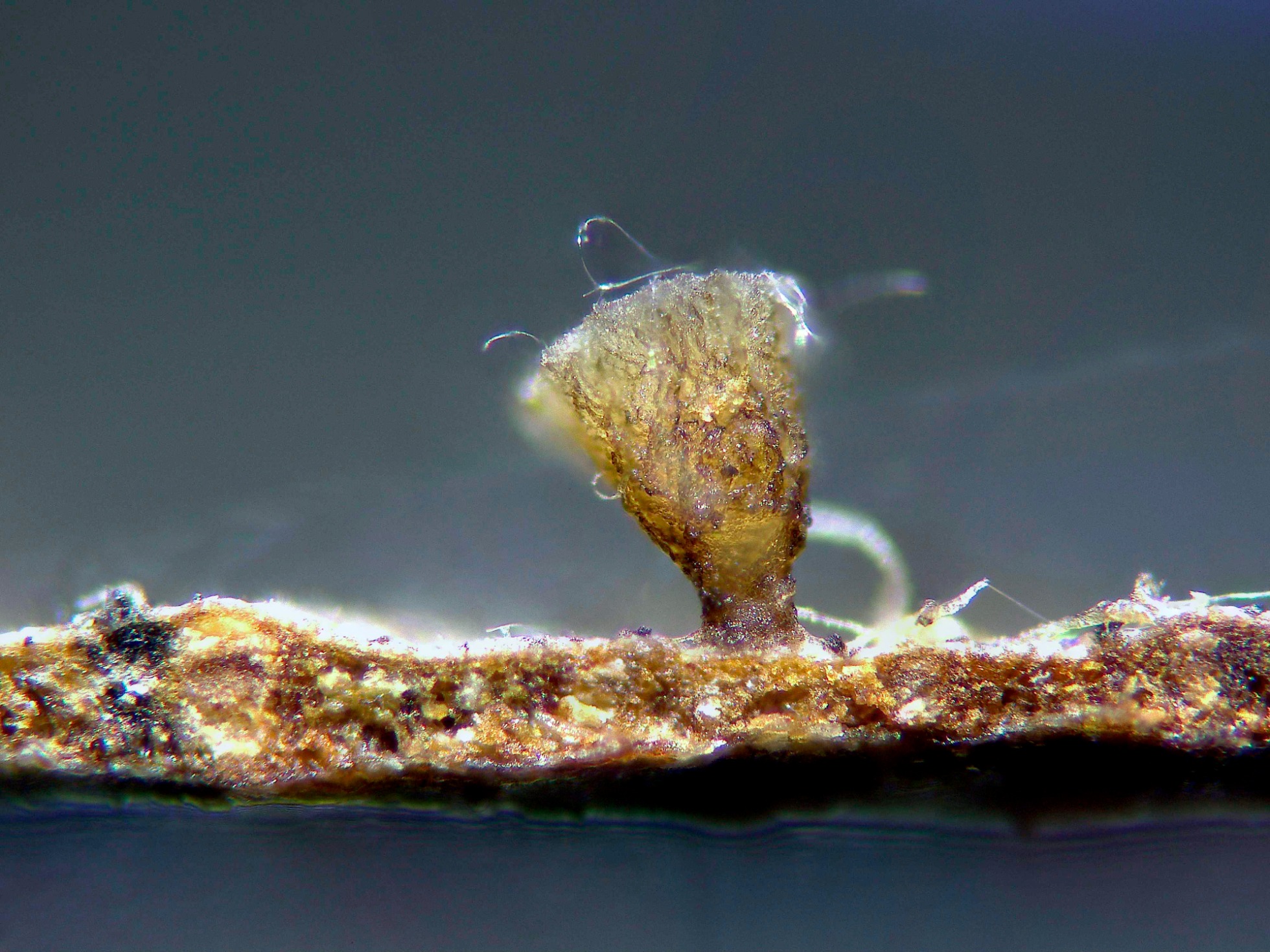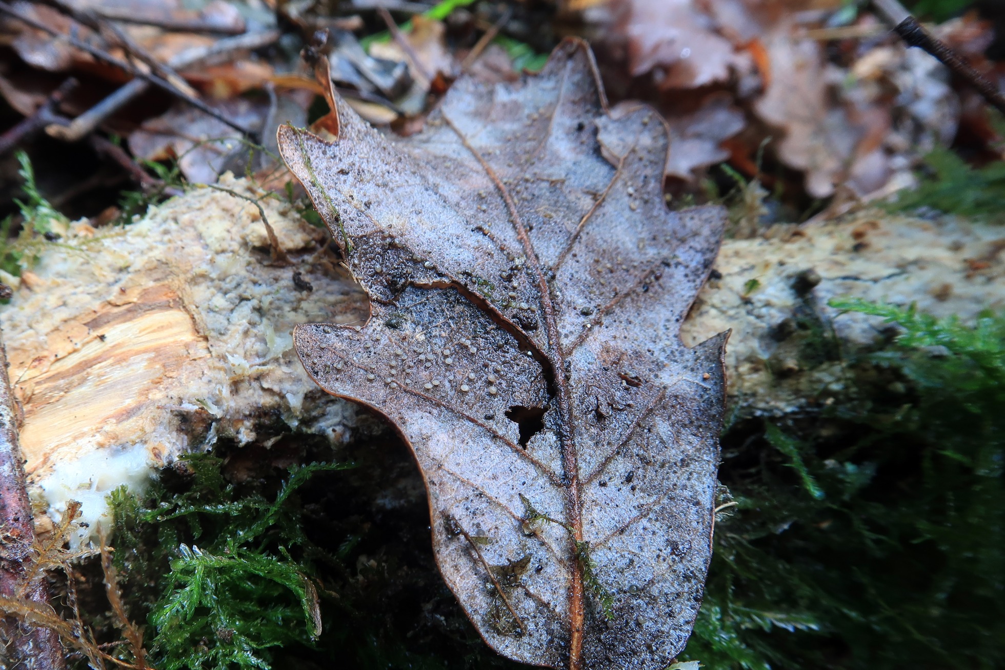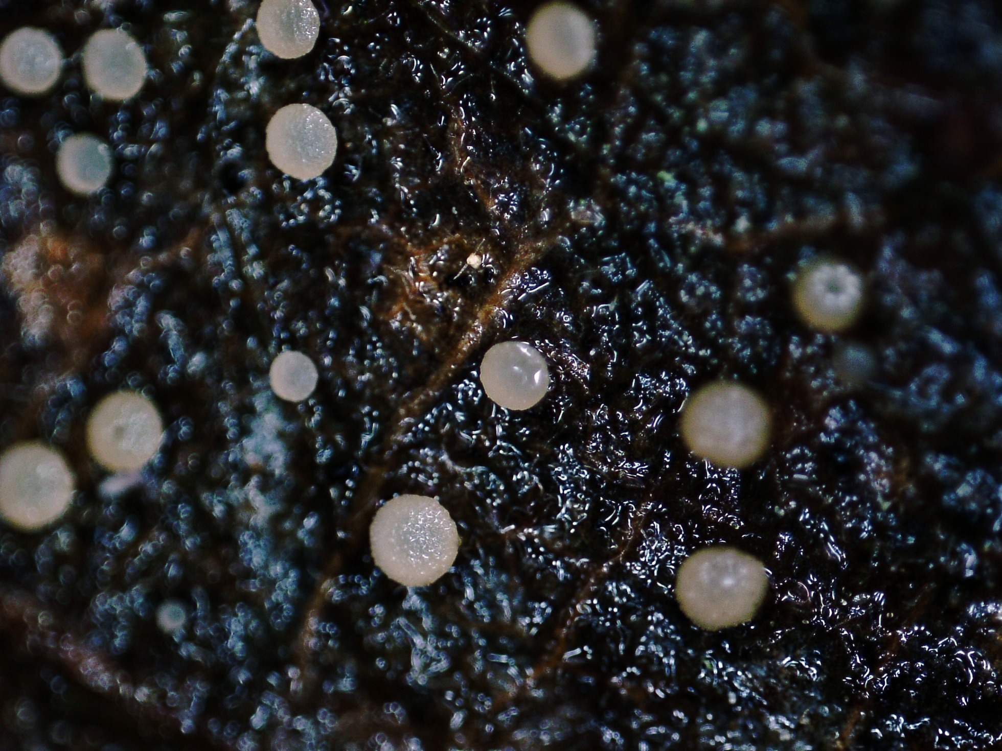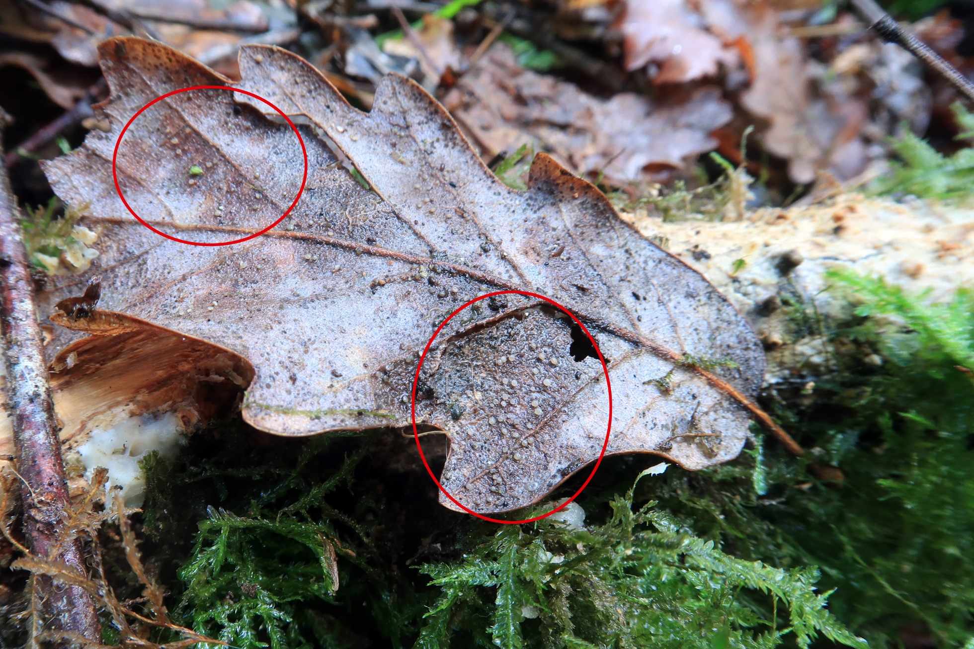 Unos pequeños apotecios sobre una hoja de Quercus (probablemente roble) del suelo, de color amarillento con un diámetro de entre 0,4 y 0,8 mm.
