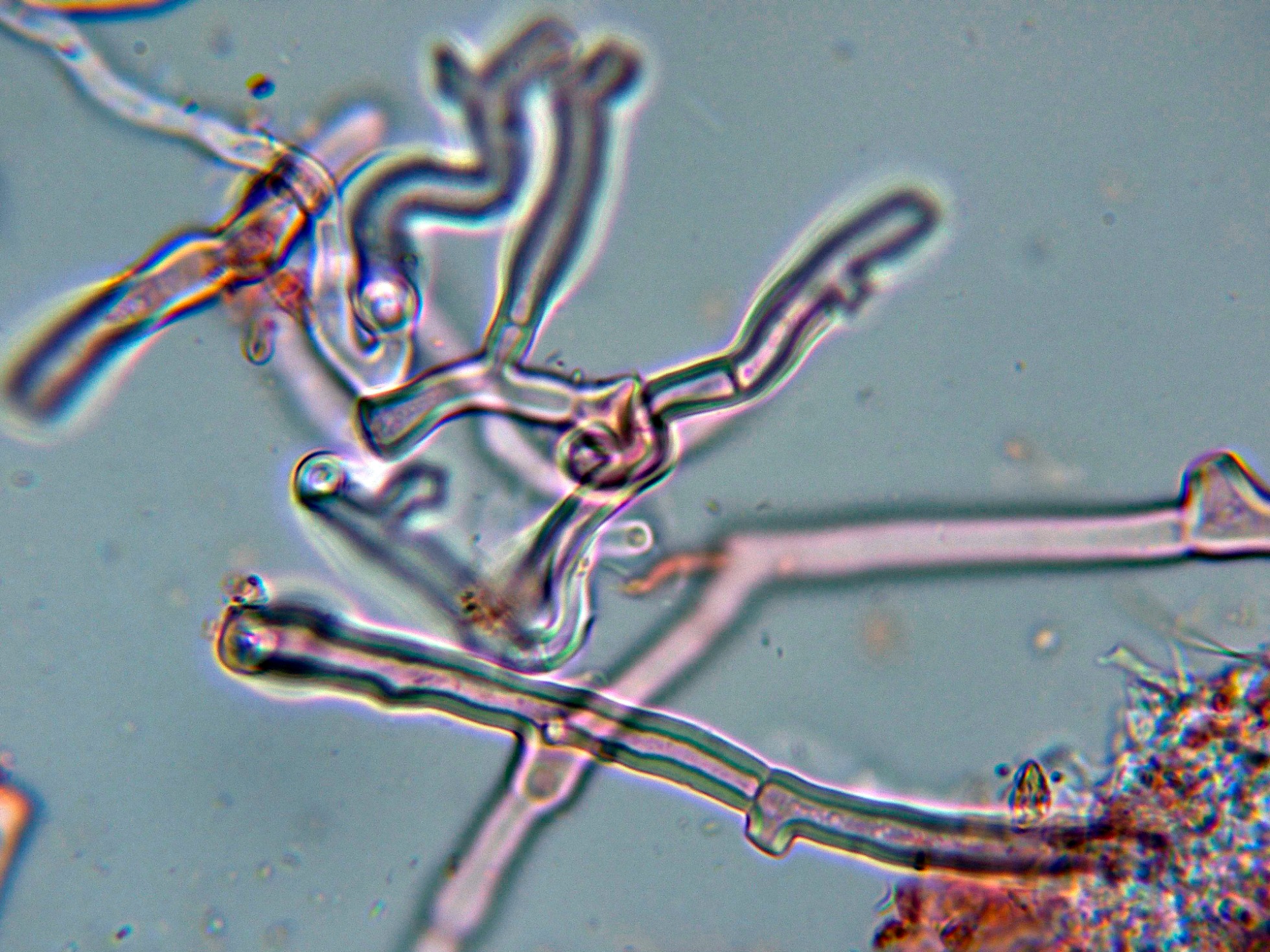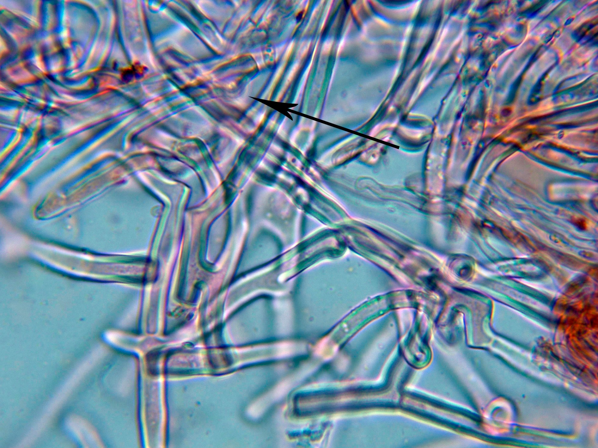 Sistema hifal monomíto, formado por hifas generativas de paredes gruesas, mayoritaramente sin fíbulas, aunque si que puede observarse alguna fíbula en las hifas subiculares.