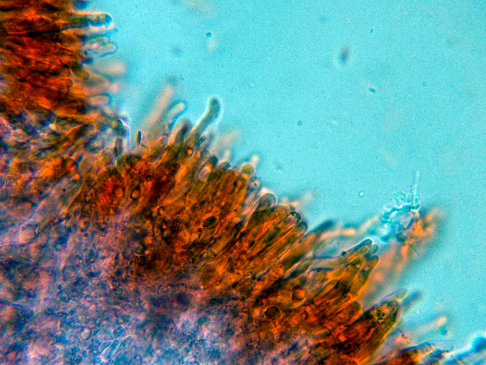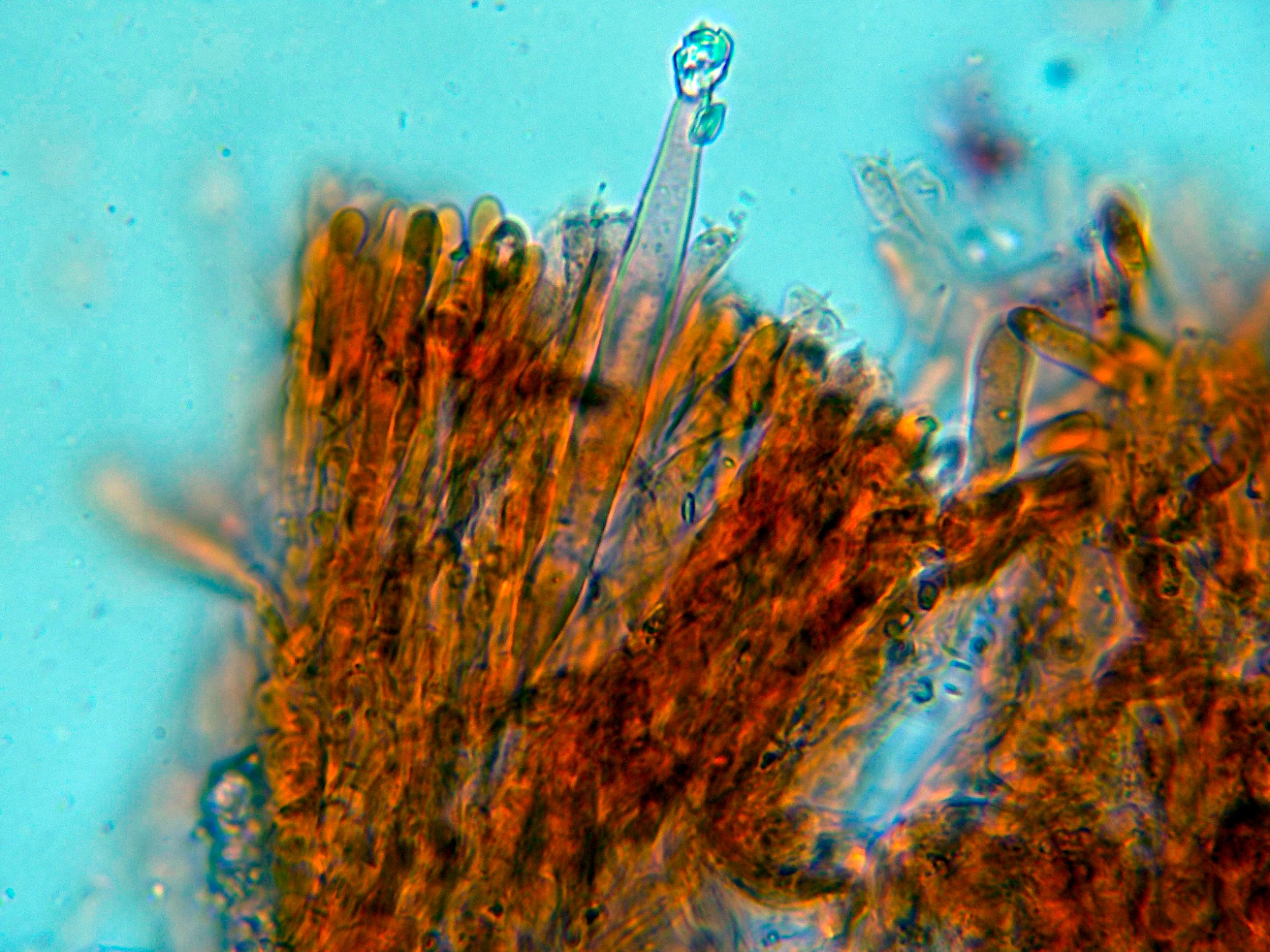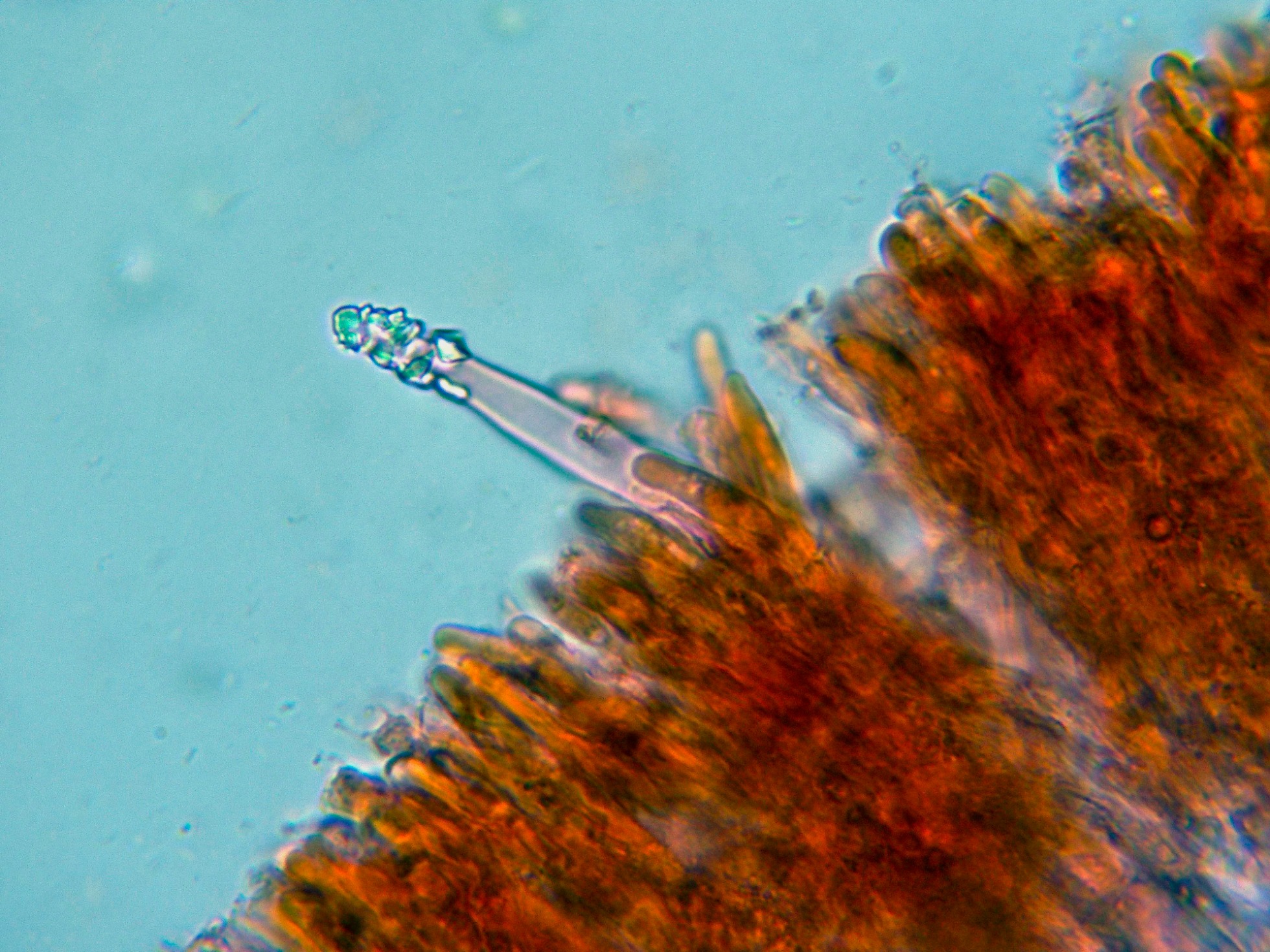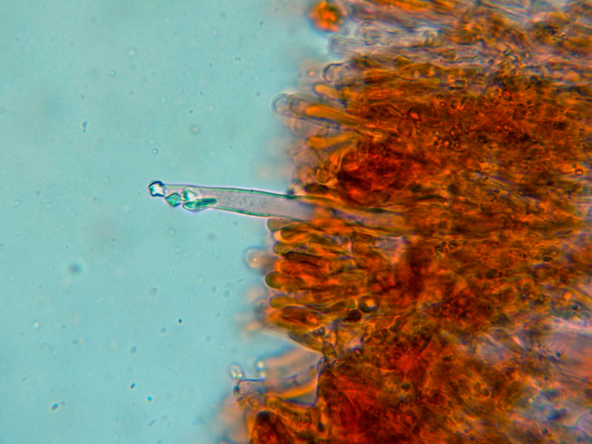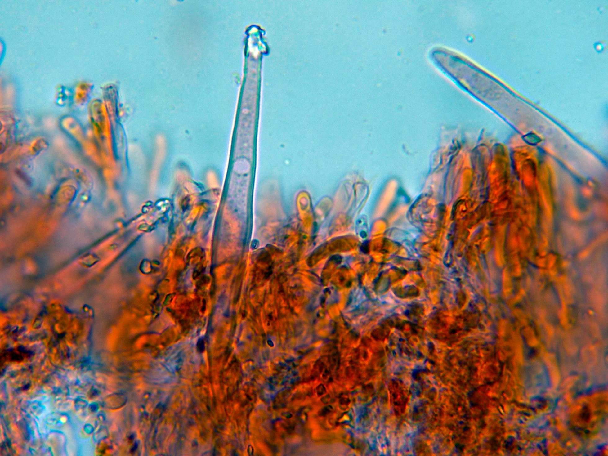 Cistidios dispersos con cristalizaciones en el ápice y unas medidas de (55.5) 58.9 - 75.3 (79.2) × (4.9) 5.4 - 7.3 (7.4) µm.