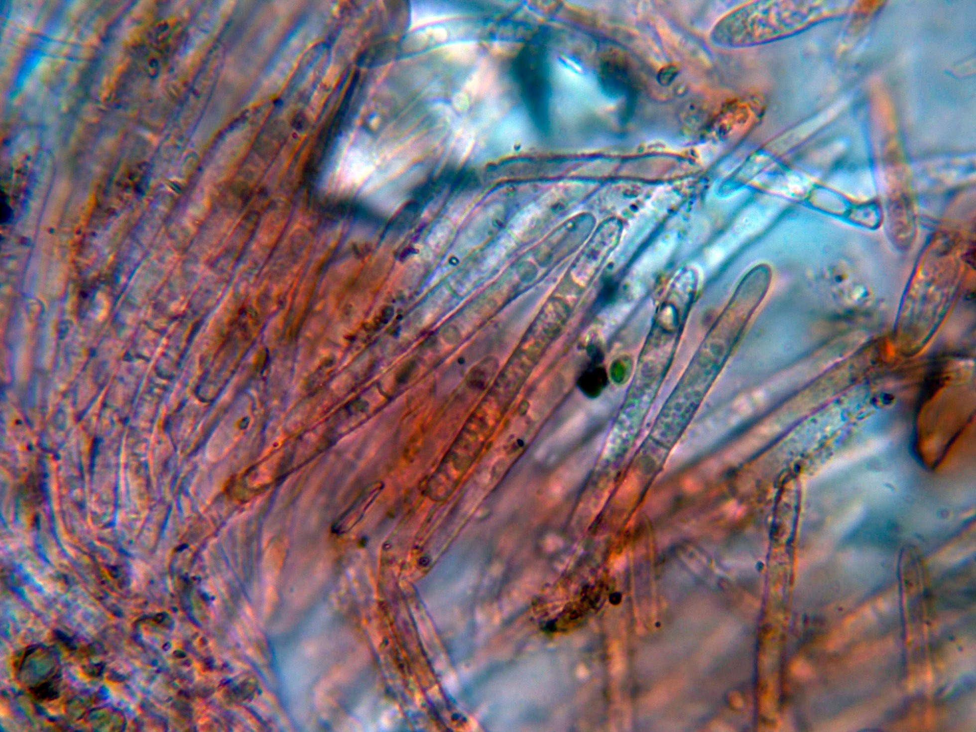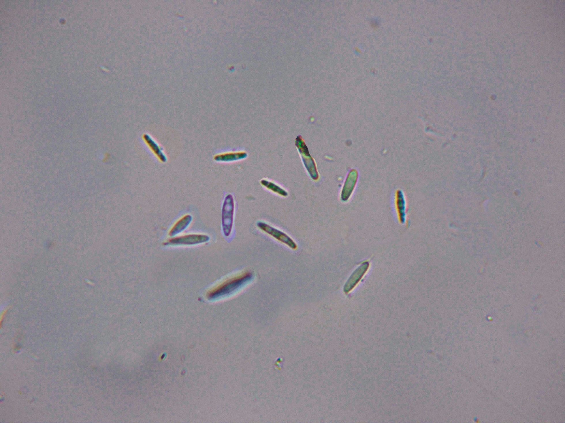 Estas esporas con unas medidas de (5.4) 6.8 - 10 (10.6) × (1.3) 1.4 - 2.1 (2.2) µm., bastante acordes con las indicadas en las Claves que le atribuyen una anchura de 1,5 a 2,1 µm.