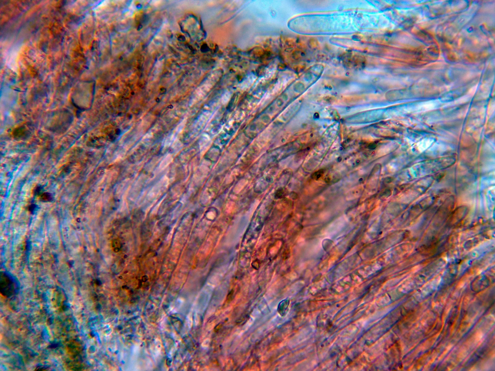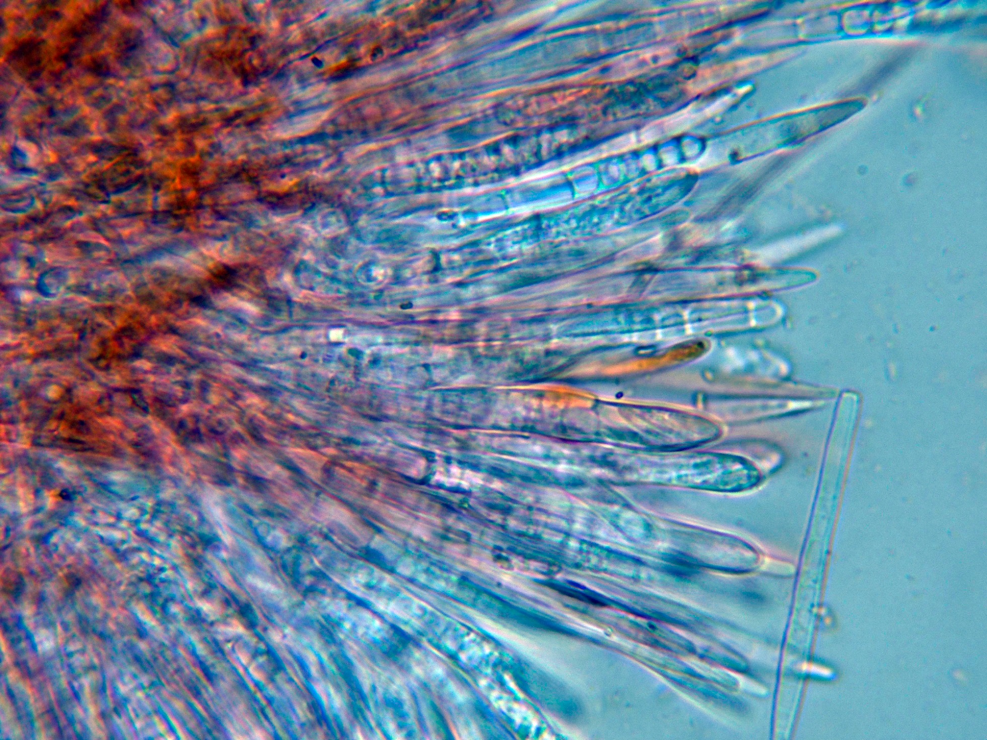 Paráfisis multigutuladas que sobresalen considerablemente por encima del nivel de los ascos, con unas medidas de (59.2) 62 - 89.6 (89.8) × (3.6) 3.9 - 5.8 (6) µm.