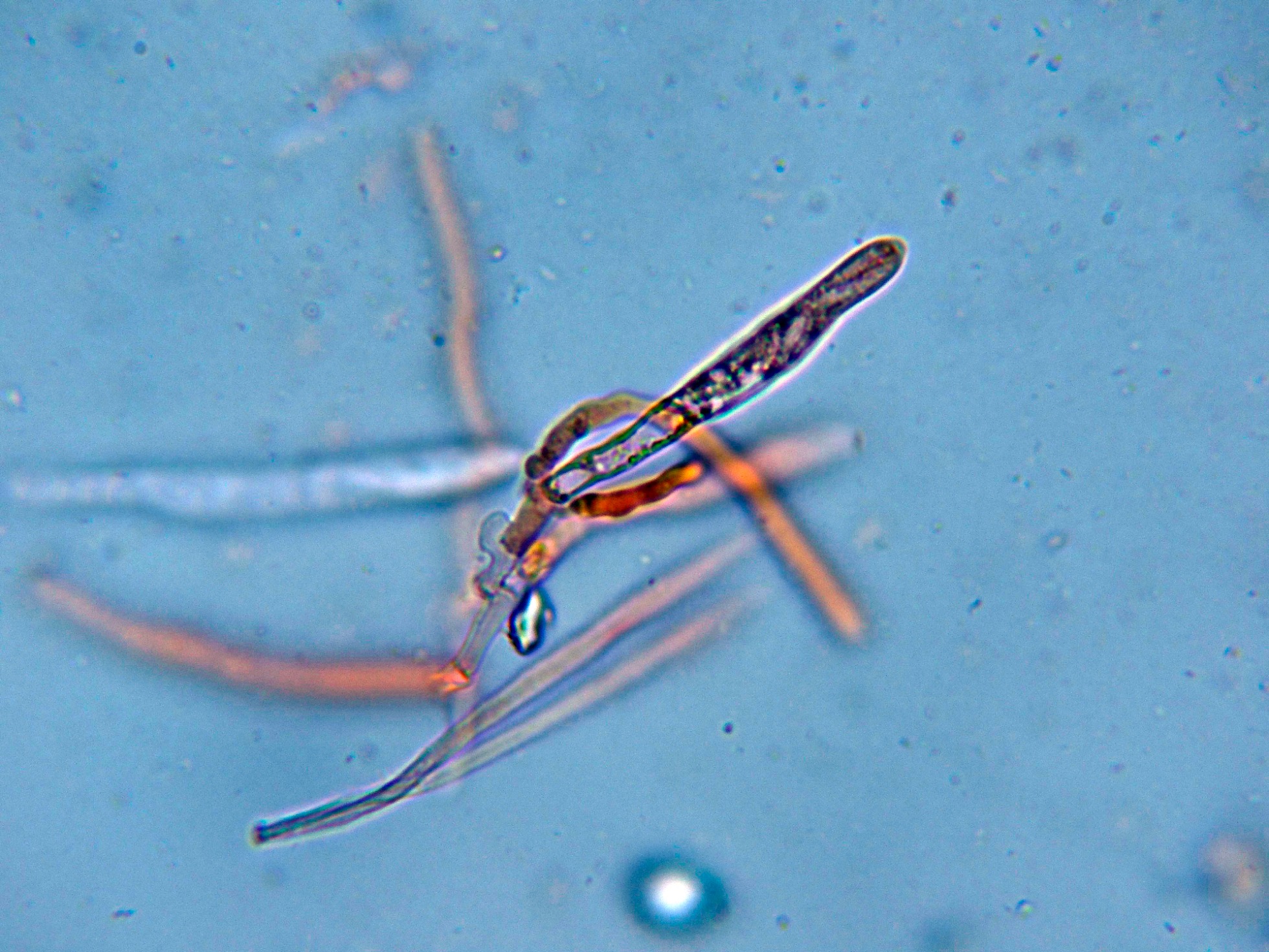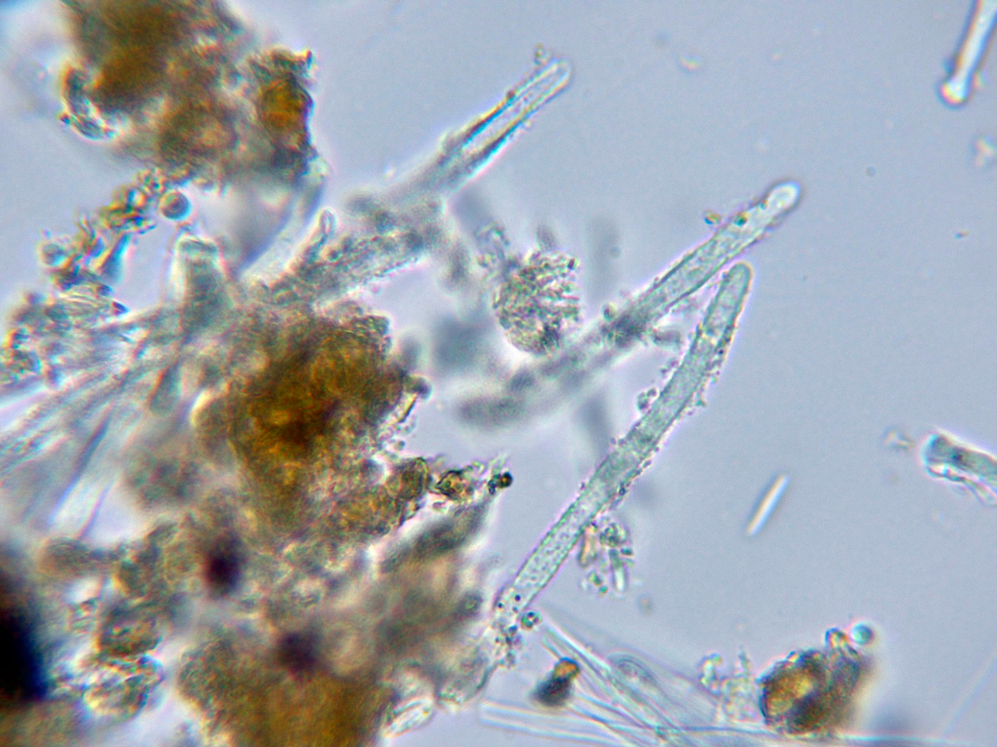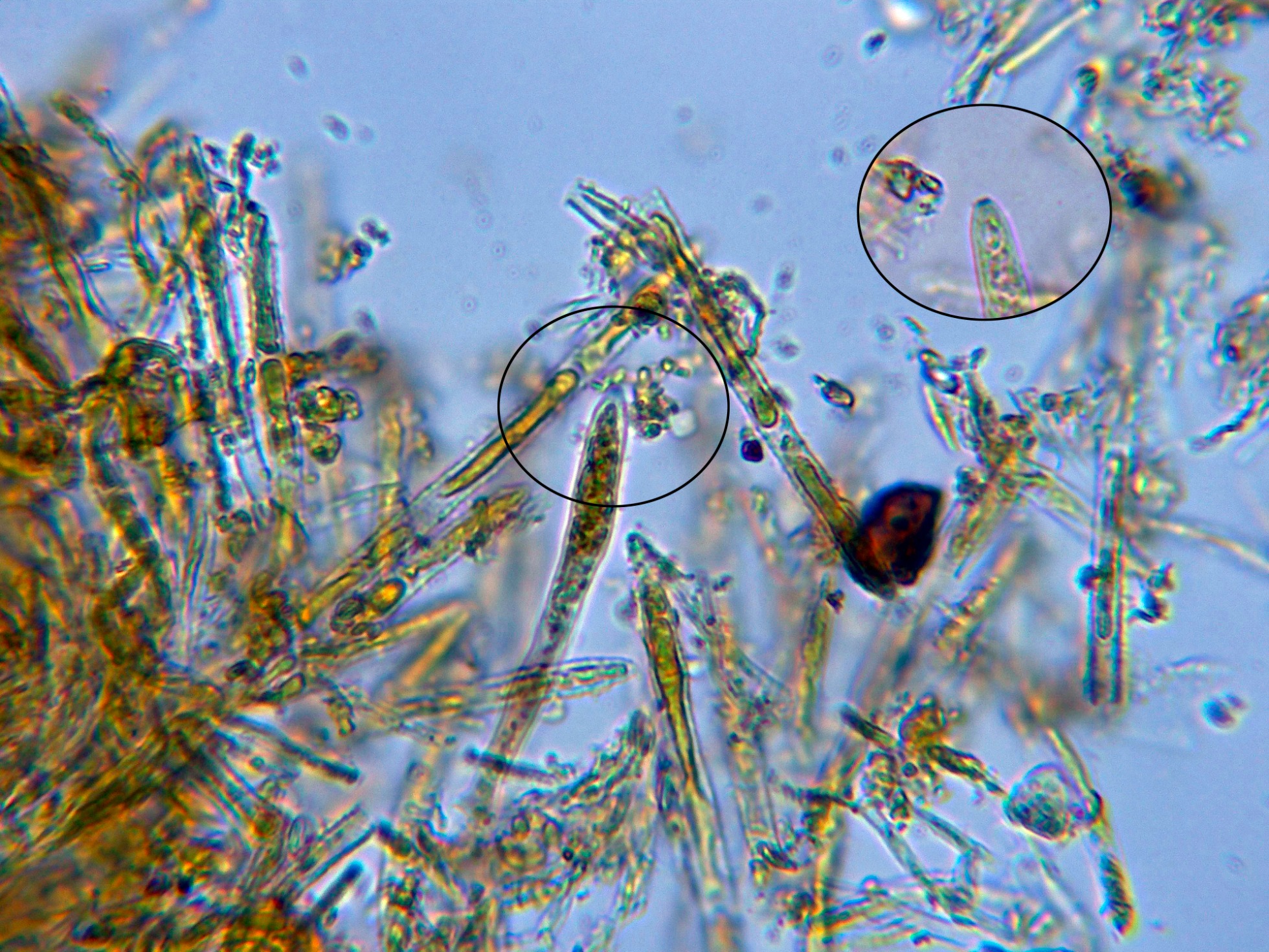 Las gútulas refractivas de sus paráfisis curiosamente son más visibles en agua.