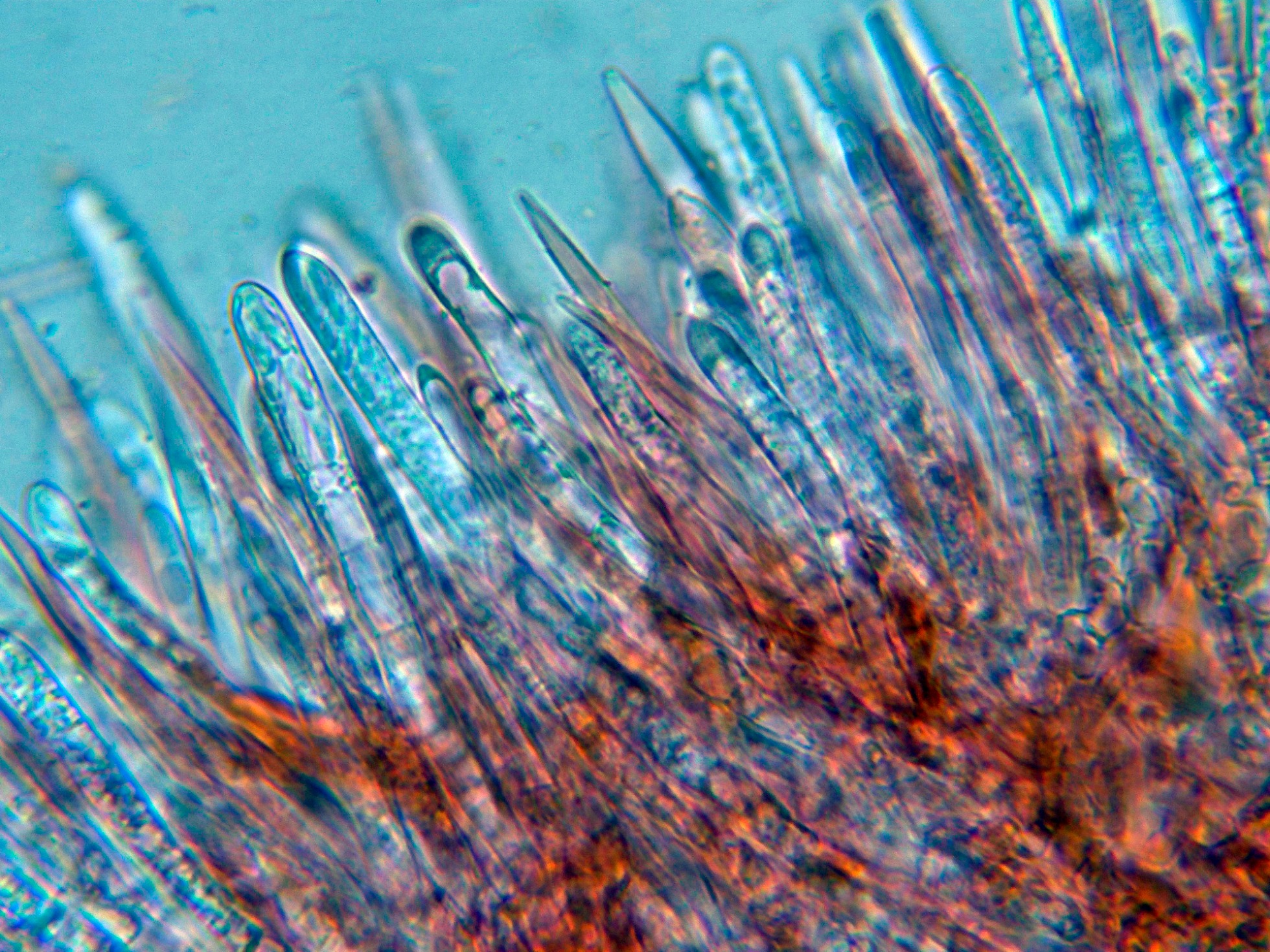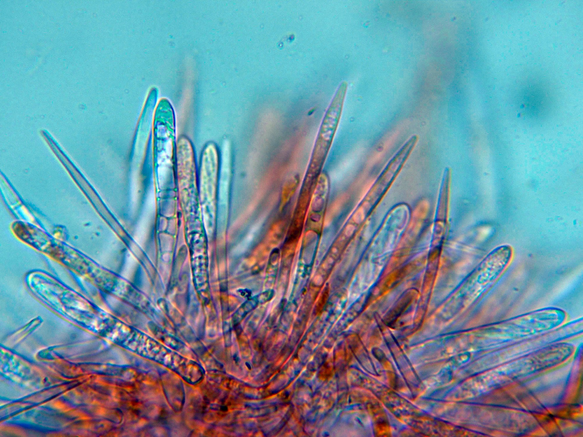 Estos pelos marginales, septados, presentan en su interior múltiples gútulas, con unas medidas de (52.1) 65.8 - 88.1 (90.1) × (3.1) 3.14 - 4.2 (4.3) µm., según las Claves de 50-85 µm.