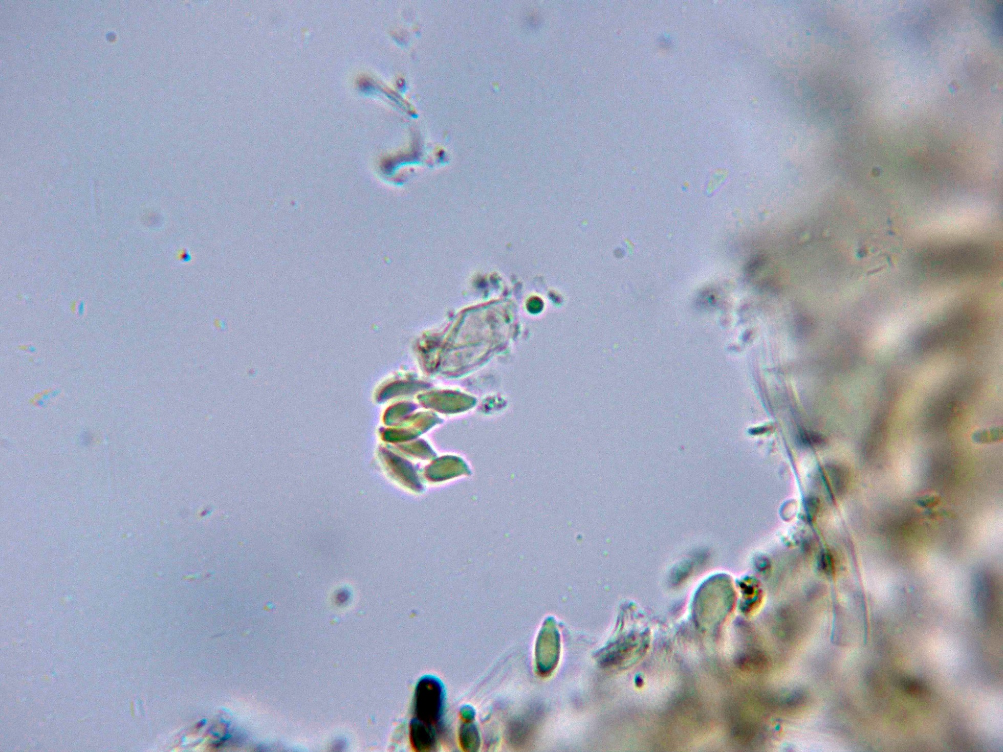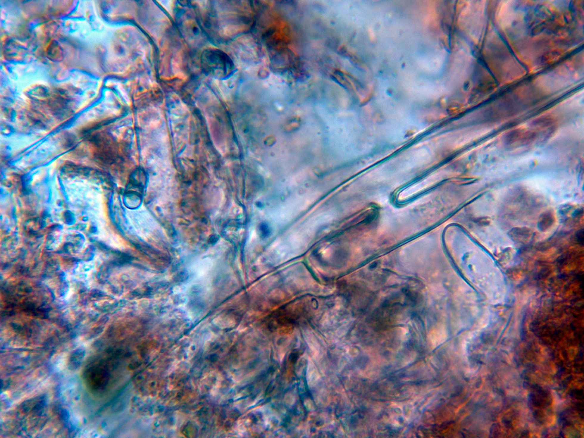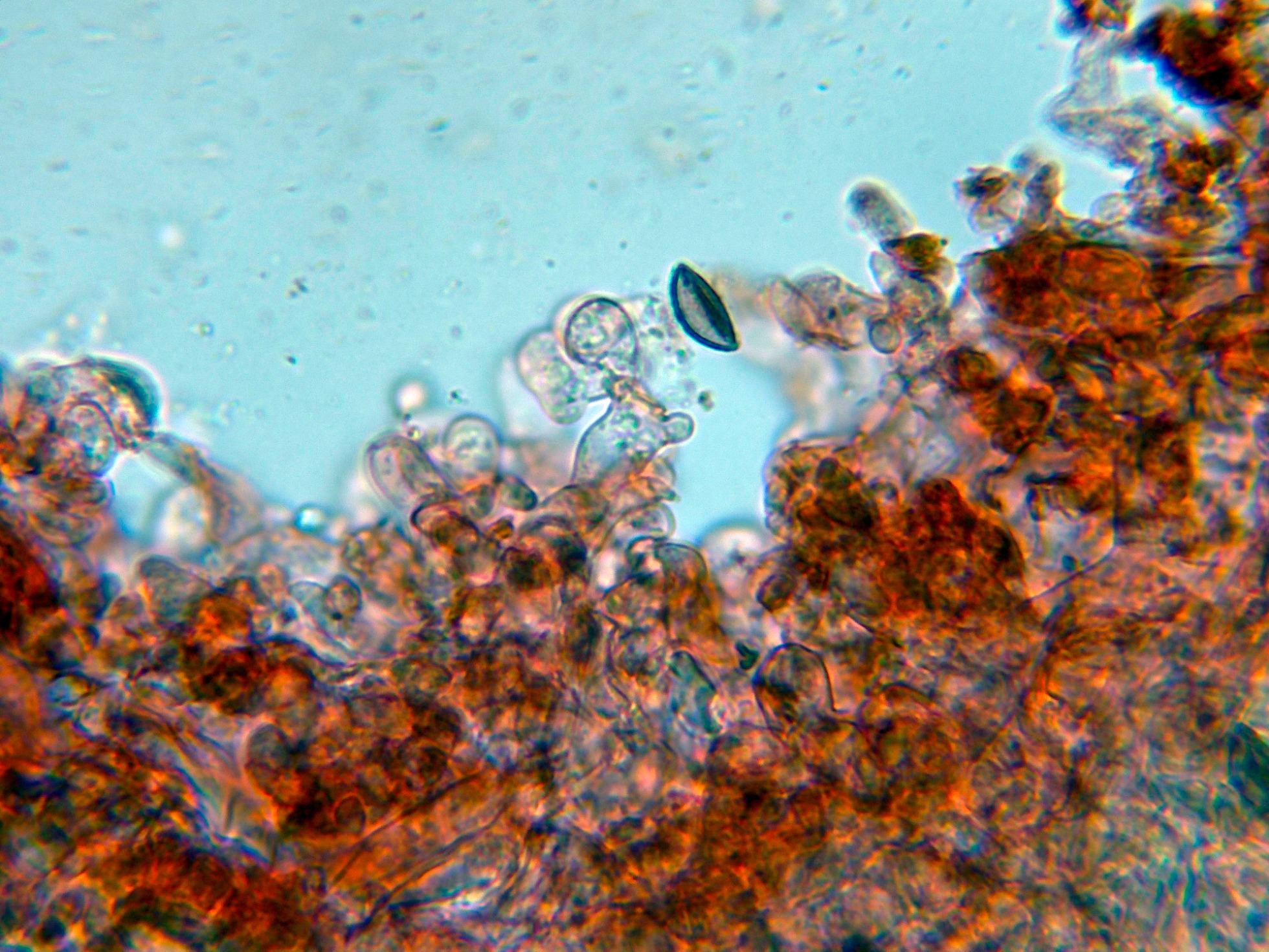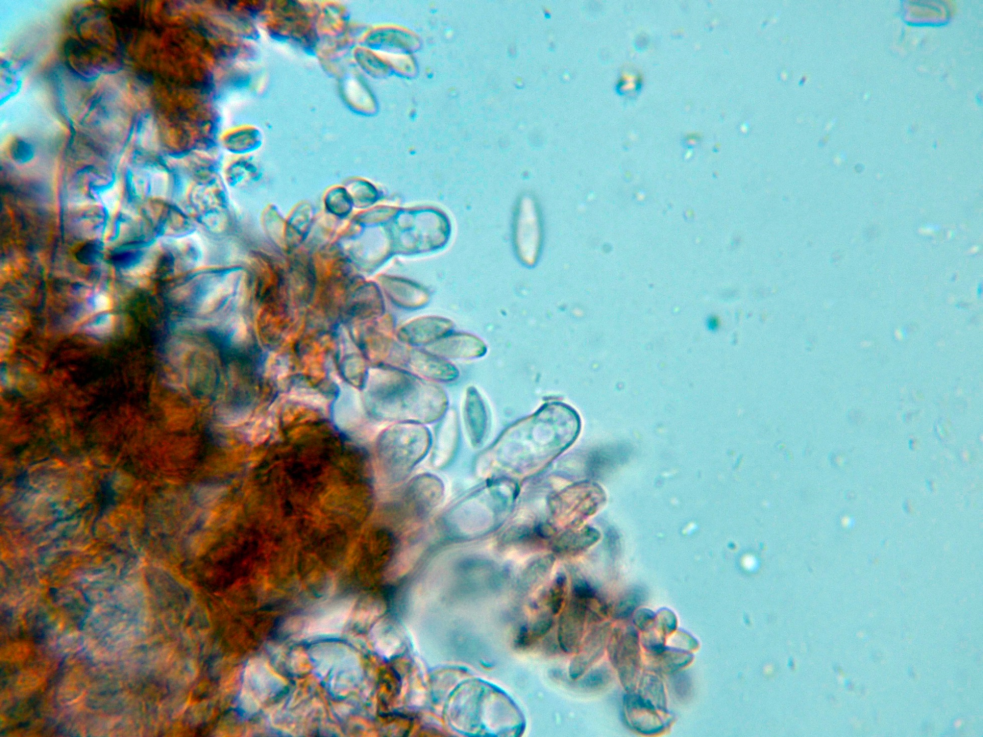 Aunque no se citan cistidios para la especie, si que pude observar algunos elementos terminales deformes y con ensanchamientos.