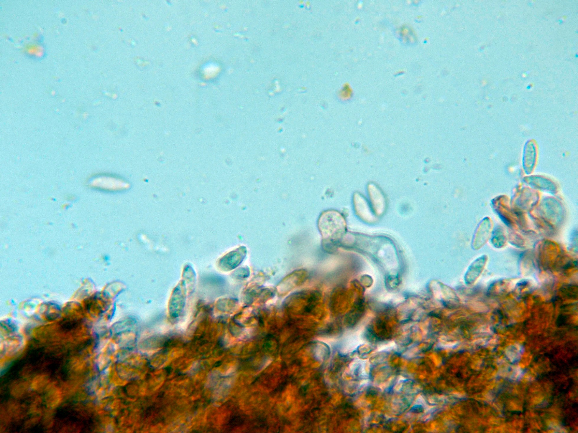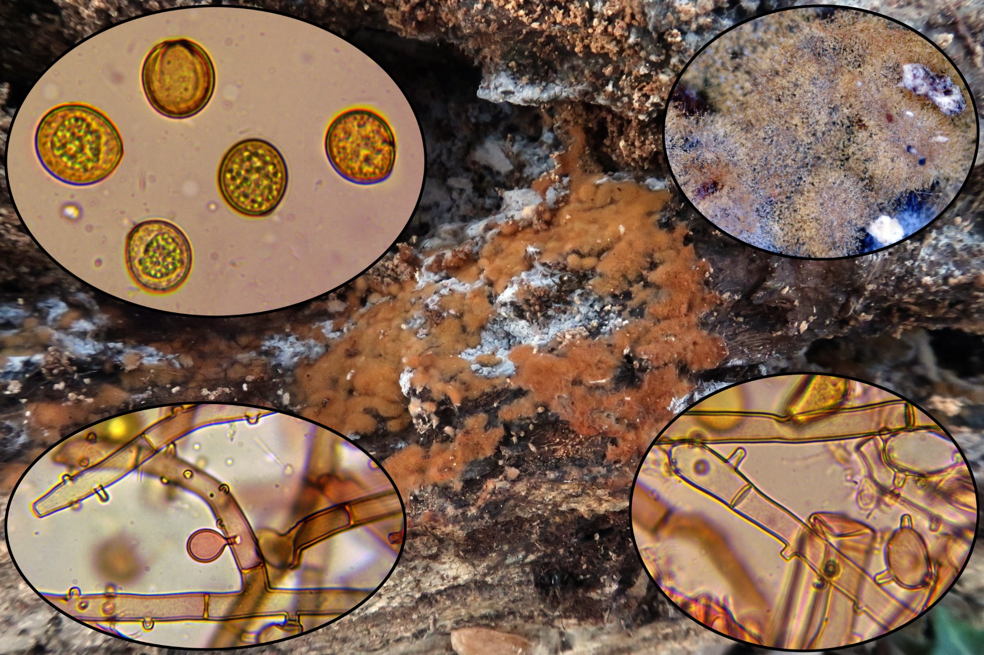 El Botryobasidium subcoronatum se caracteriza por su sistema hifal monomítico, con hifas anchas y fibuladas (según bibliografía con una anchura de entre 5 a 10 micras, sus basidios con 6 esterigmas y sus esporas naviculares con sus medidas esporales (según bibliografía de 6-9 x 3-3,5 micras.), todos los parámetros completamente acordes con los del presente estudio.