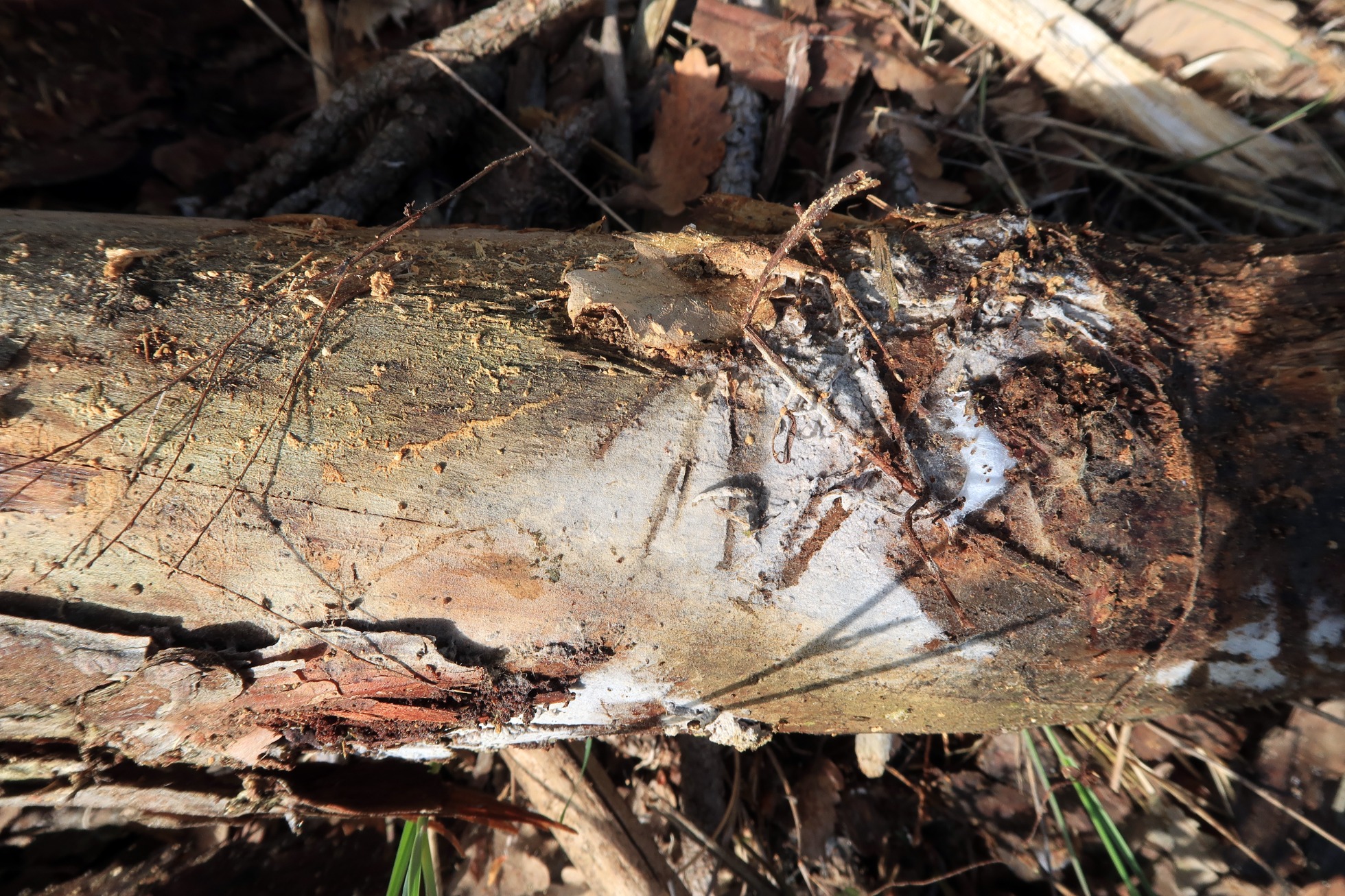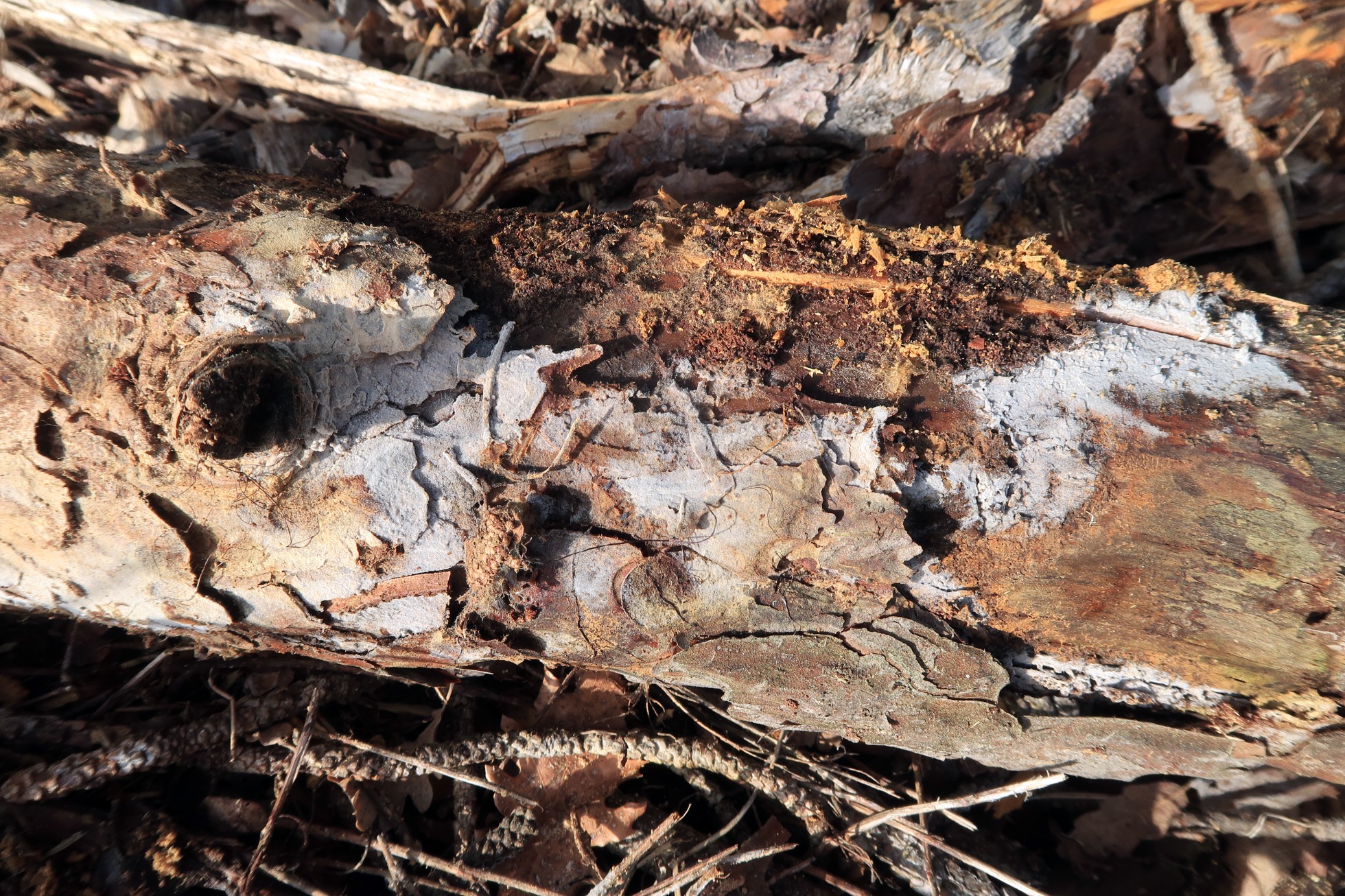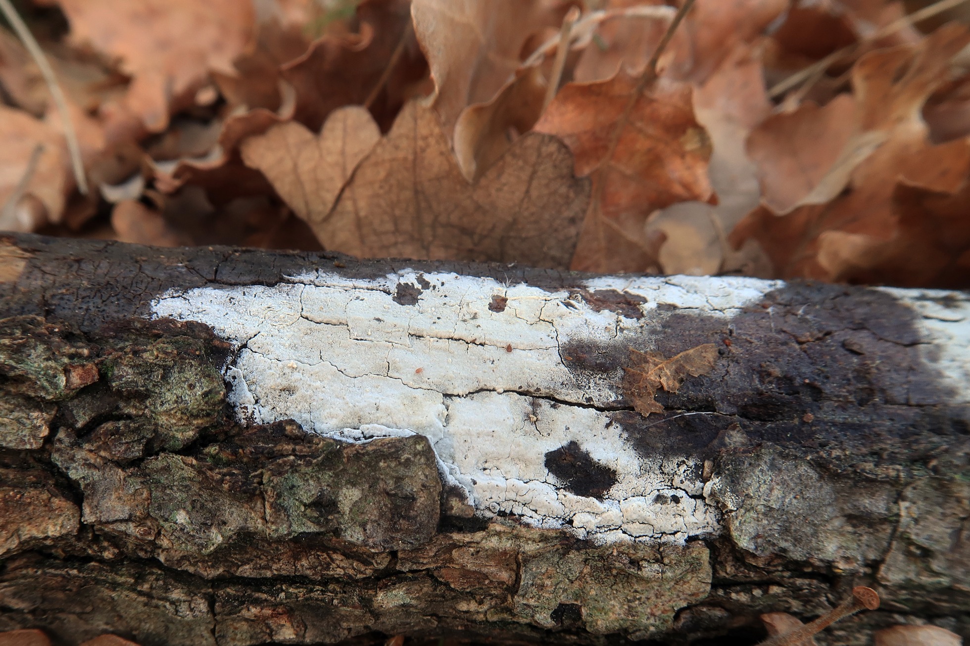 Un Corticial del domingo 28 de mayo, fotografiado sobre la corteza y también sobre el tronco decorticado, probablemente de roble.