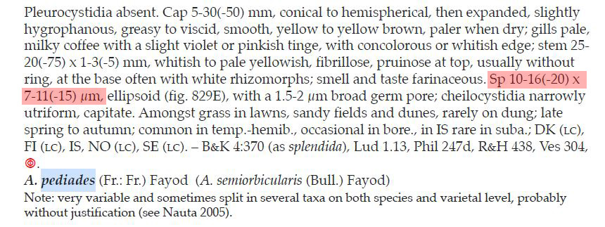 También estas opiniones coinciden con las indicadas por otros autores como Amanitacesarea con unas medidas esporales para la Agrocybe pediades de 11-14 X 7-8 µm., te añado el enlace: