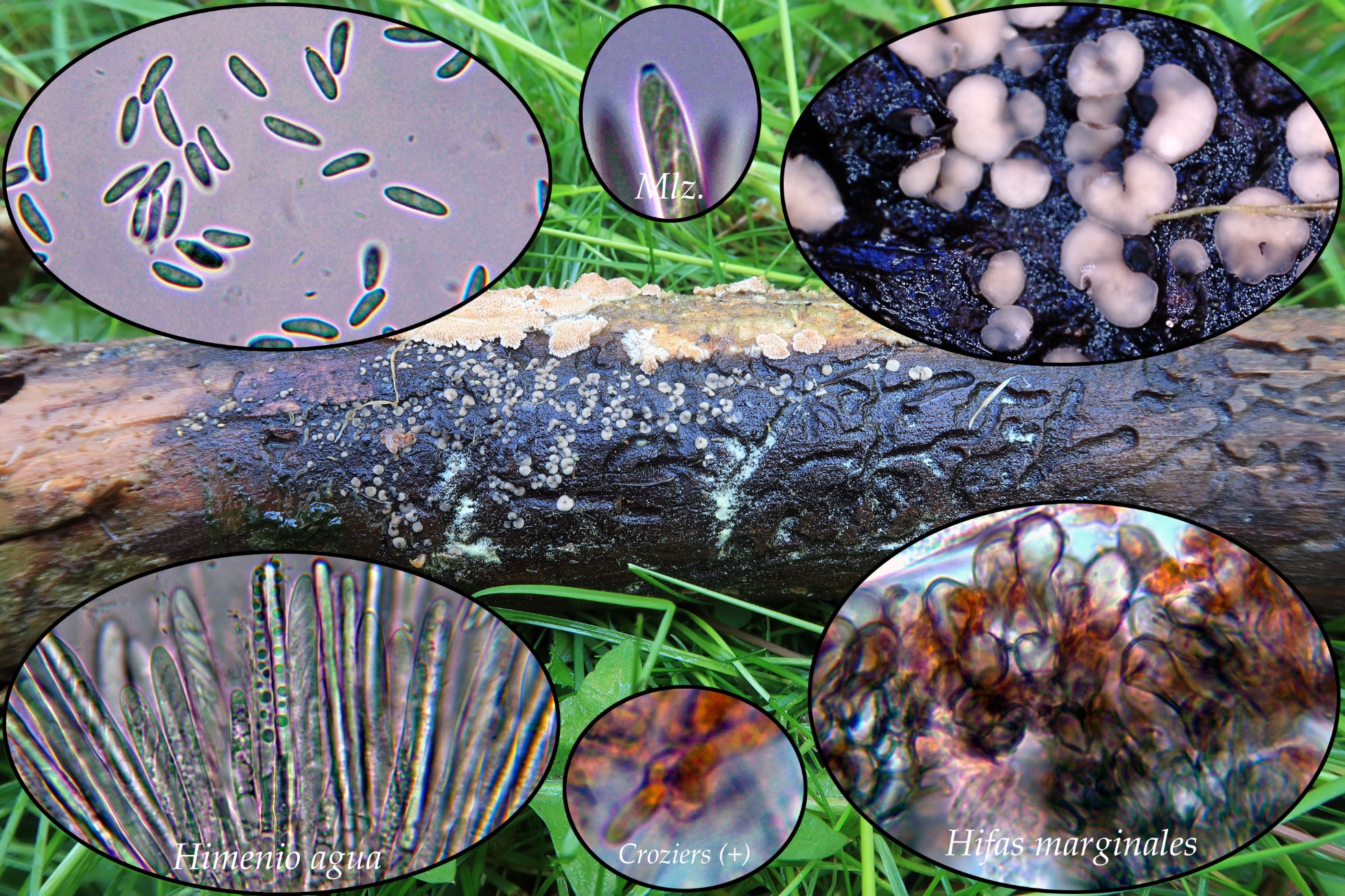 Sobre madera decorticada de pino, una Mollisia, siguiendo las Claves del género que no podemos nombrar, me conducen irremediablemente a la Mollisia ponticulorum.