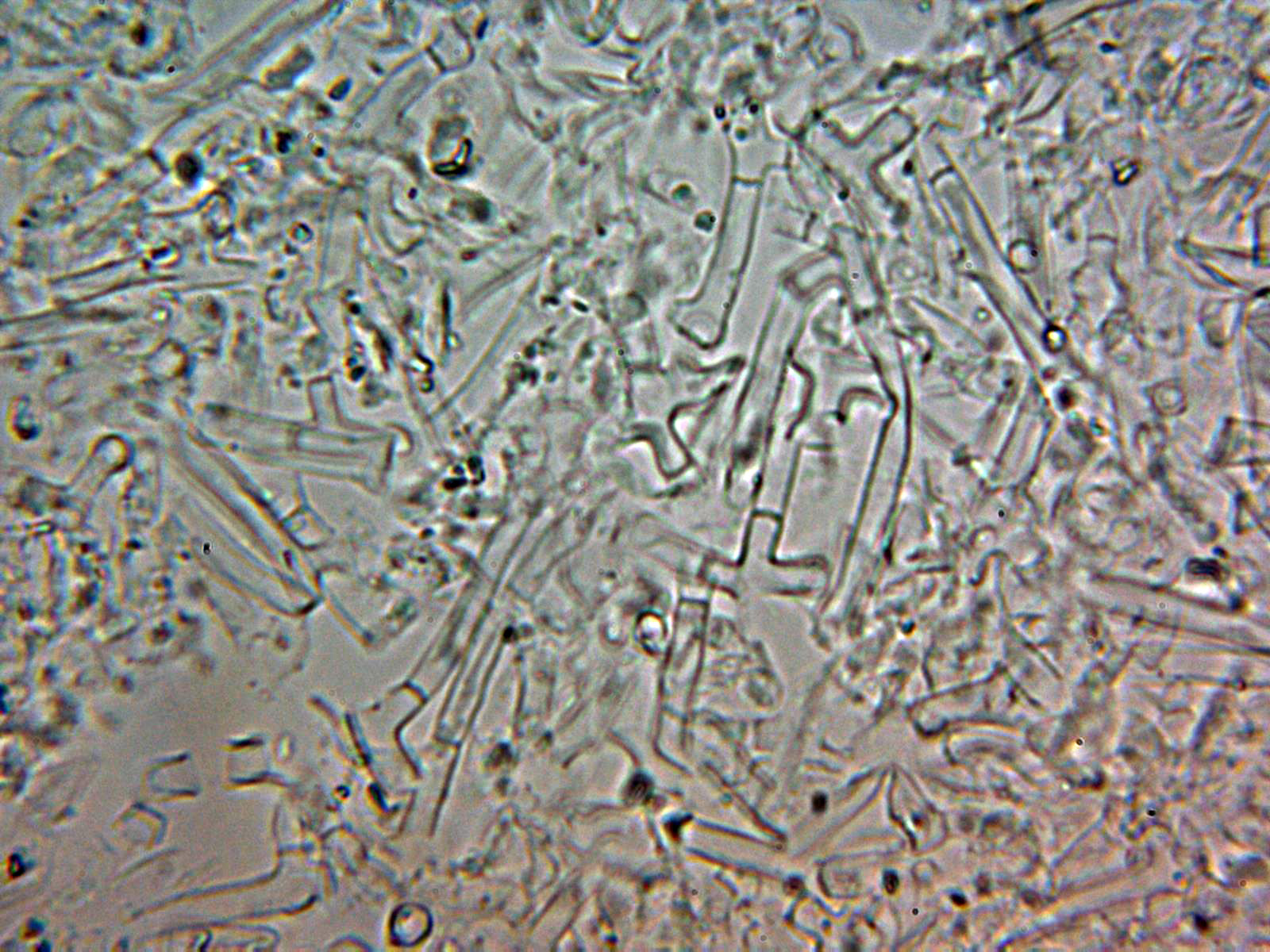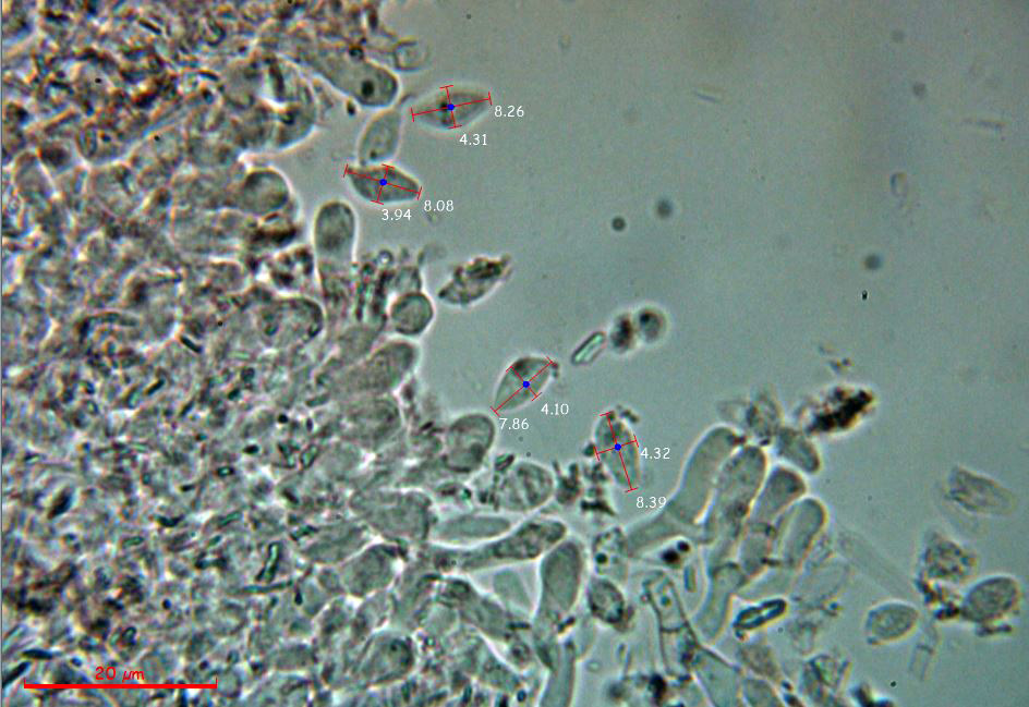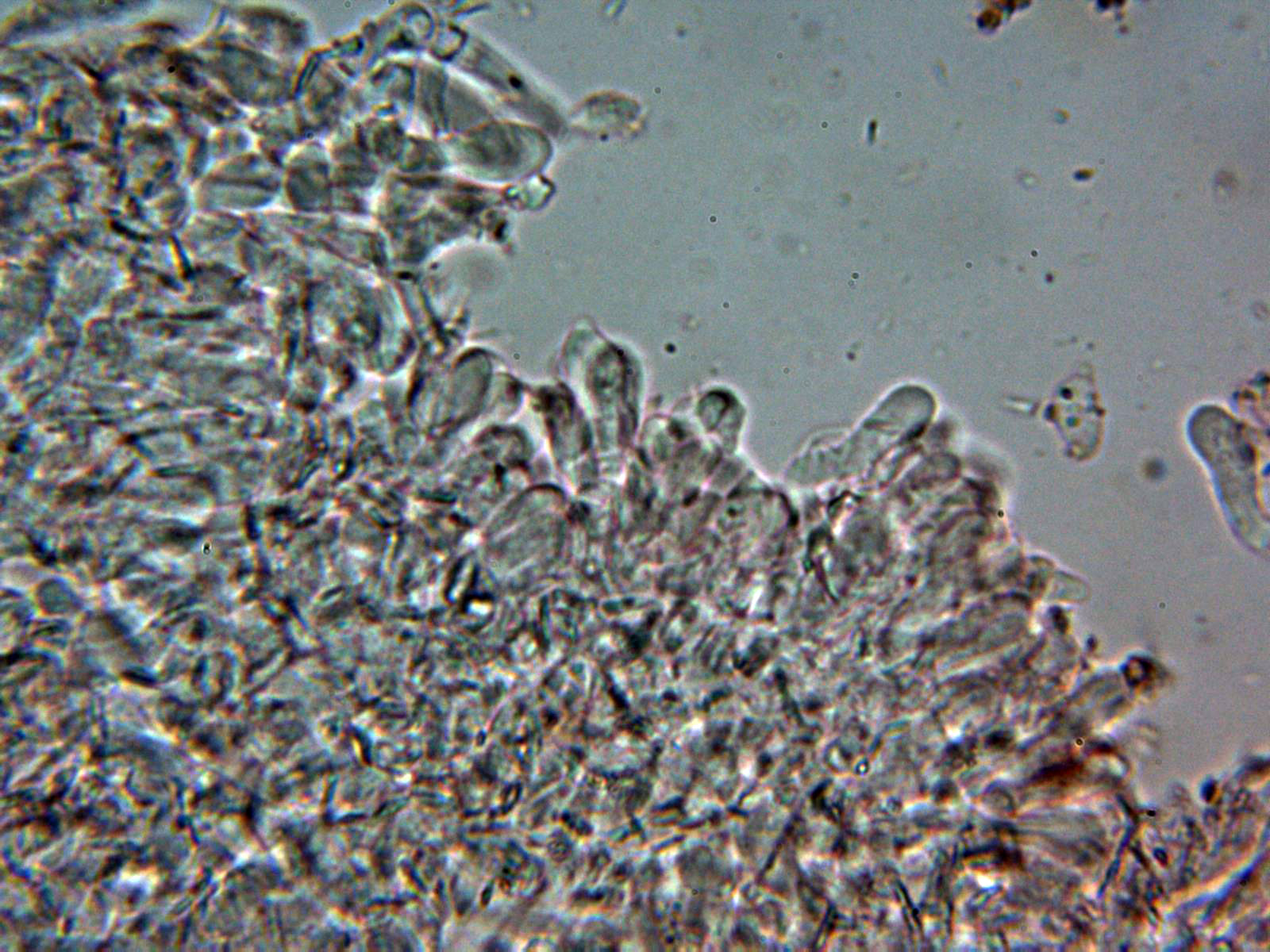 Observaciones: Siguiendo las Claves de "Les Champignons de Suisse", con sistema hifal monomítico, hifas en ángulos rectos, sin fíbulas, con una anchura de 2 a 7 micras, basidios con unas medidas de 12-20 x 5,5-6 um,. sin cistidios y esporas fusiformes, con unas medidas de 7-8 x 3,2-3,7 um. conducen al Athelidium aurantiacum propuesto, y aunque en la misma fuente se admite que en estado joven puede presentar este color blanquecino, al desarrollarse debería adquirir tonos amarillentos que deberían hacer honor a su nombre (al deshidratarlo prácticamente desapareció), atendiendo a las pocas esporas observadas deduzco que la fructificación aún no se había desarrollado, aun así las esporas del presente estudio arrojan una anchura ligeramente por encima de las citadas en las Claves, por lo que ante las razonables dudas dejo aparcado el tema como Athelidium cf. aurantiacum.