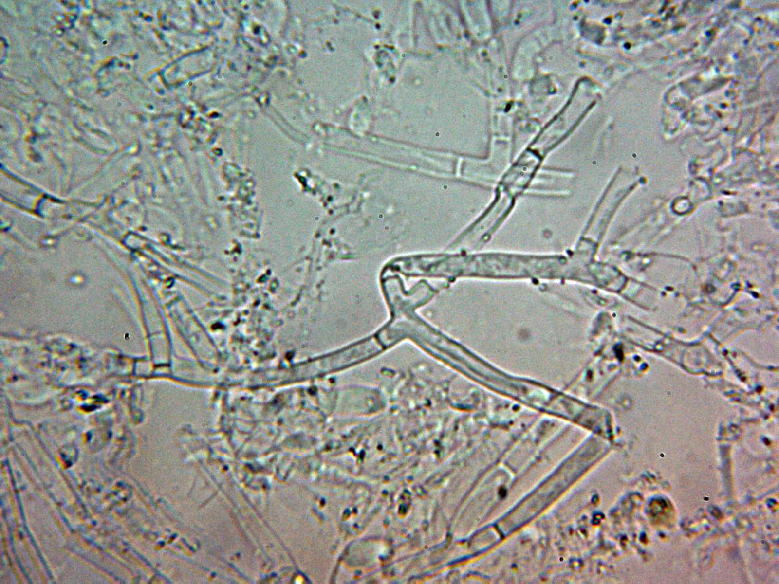 Sistema hifal monomítico con hifas subiculares con ramificaciones en ángulo recto, sin fíbulas y con una anchura de 2,7 a 4,1 micras.