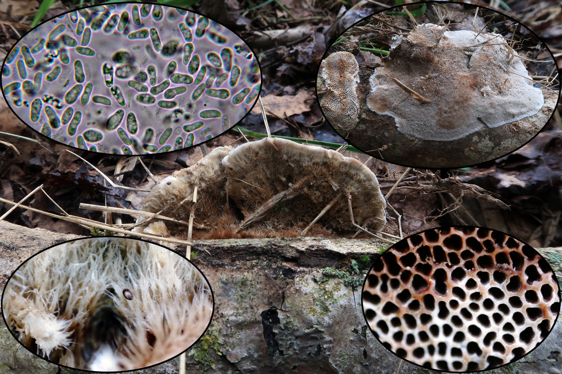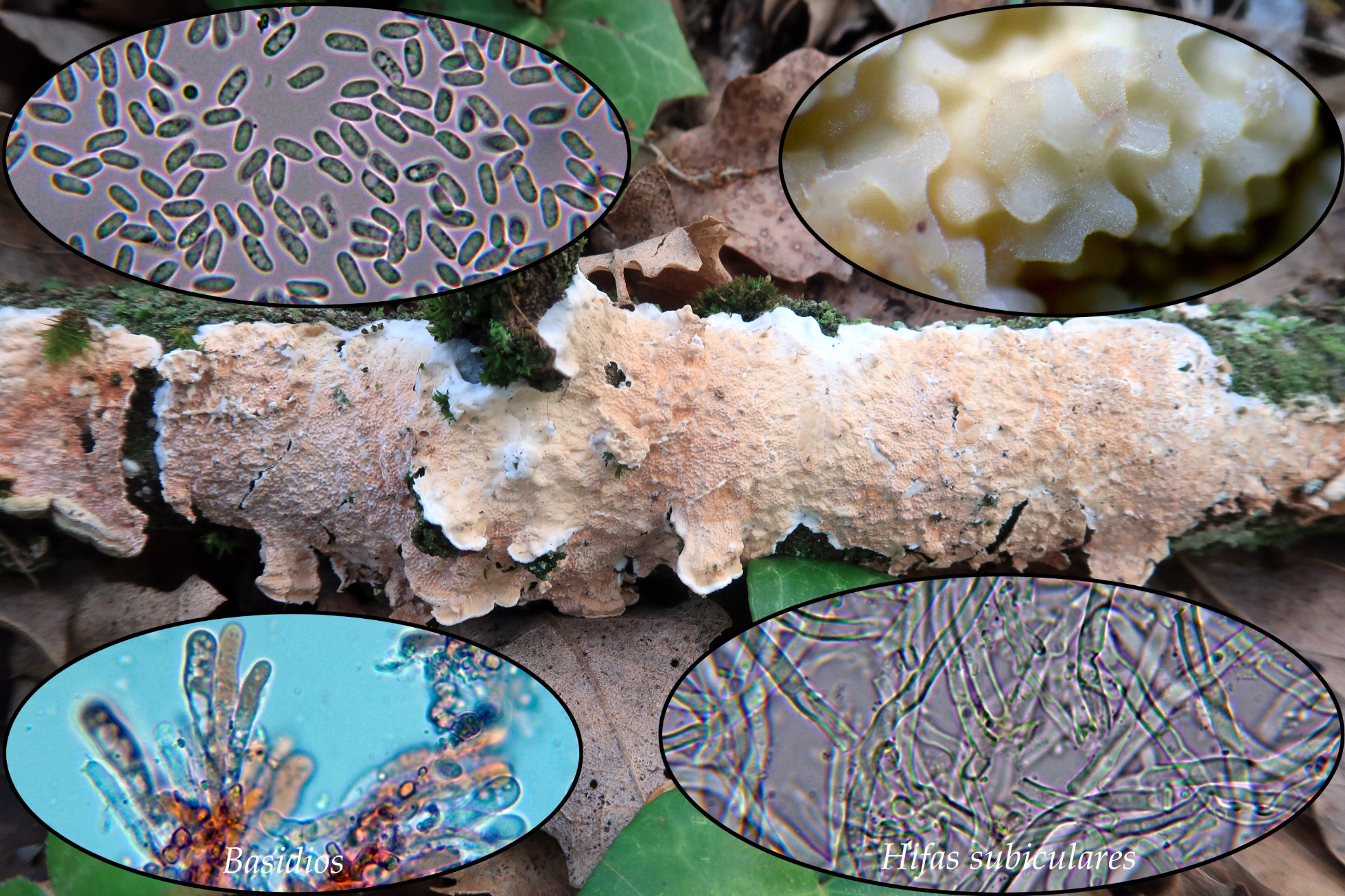 Un hongo que a pie de campo su aspecto me despistó un poco, luego ya en casa al hidratarlo, no me quedó ninguna duda (miniatura superior derecha), el Byssomerulius corium.