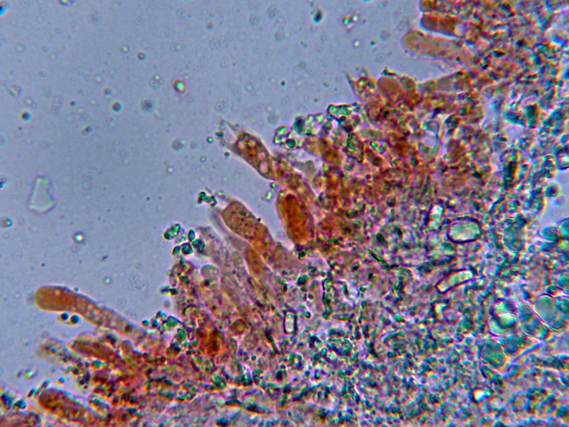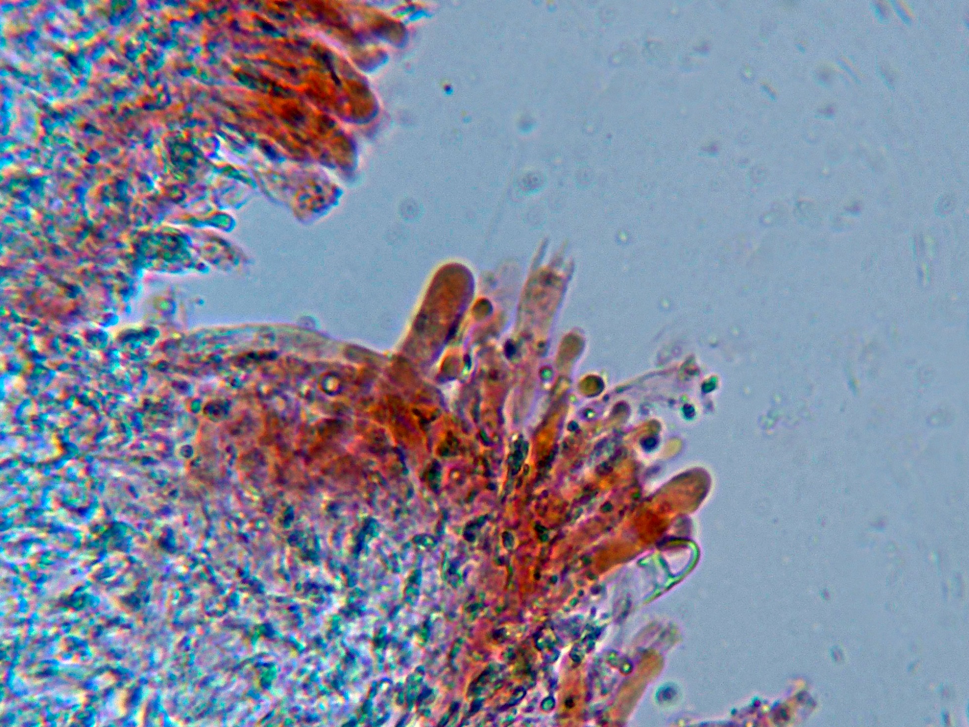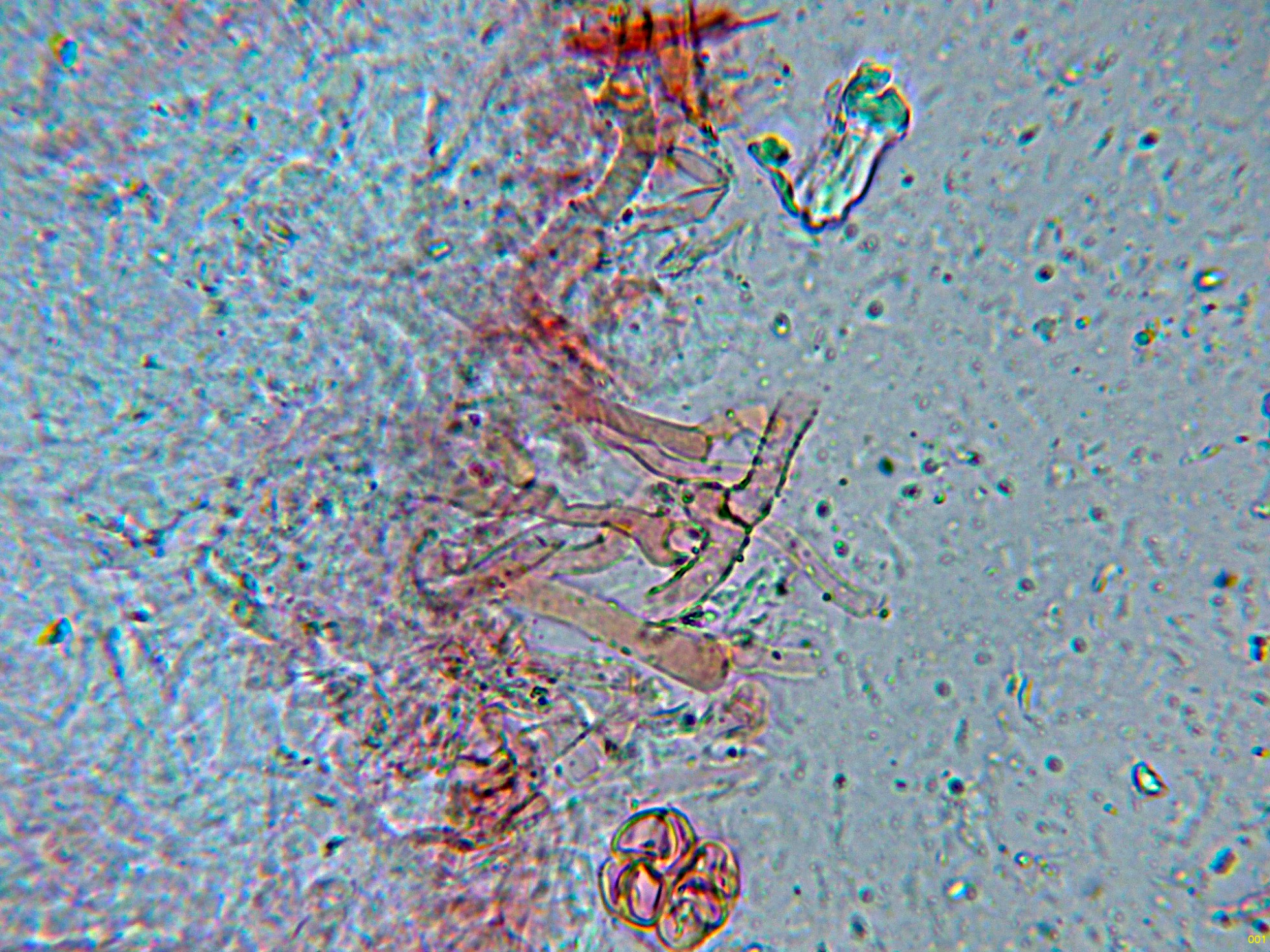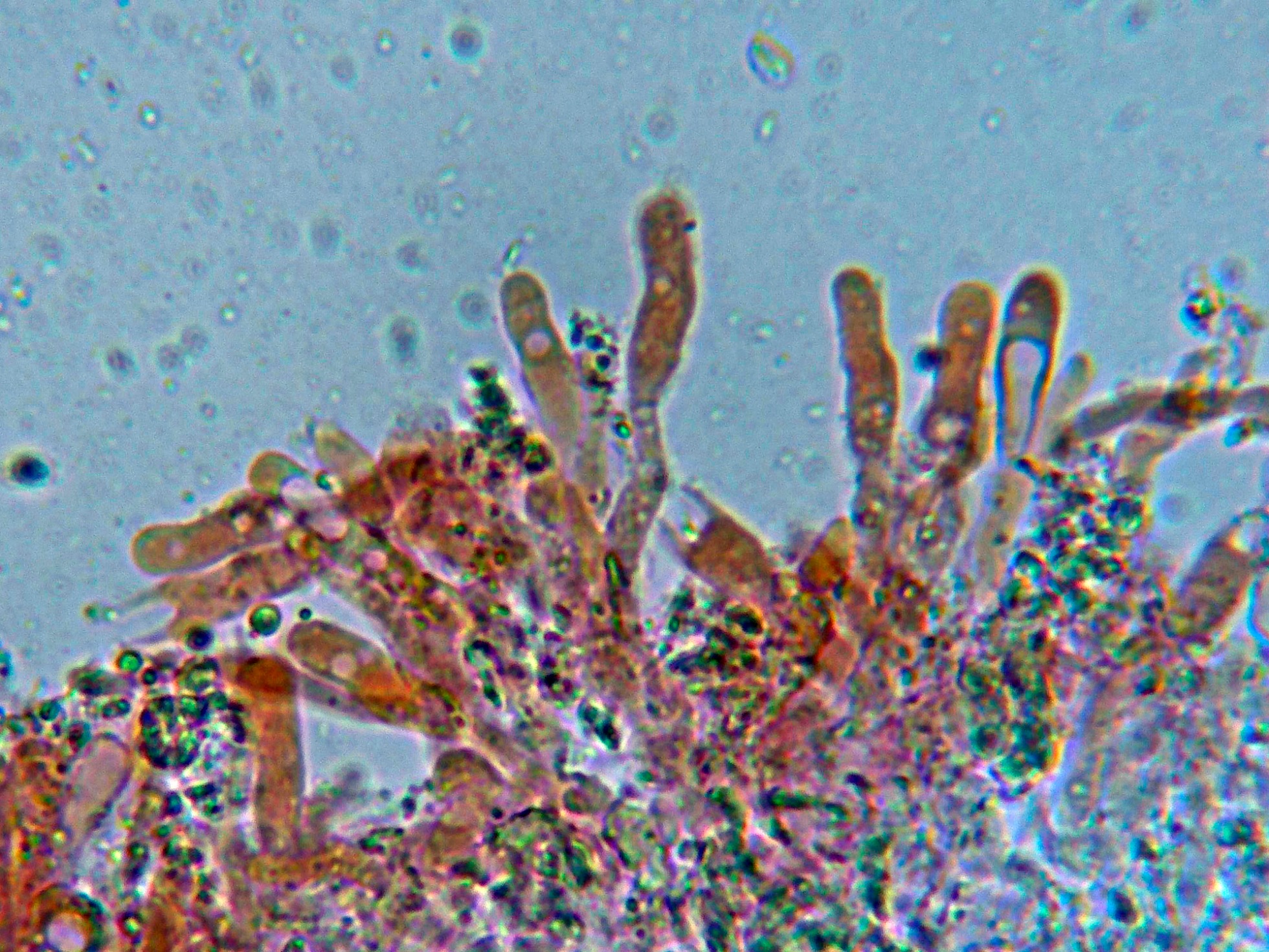 Observaciones: Aunque todos los datos obtenidos parecen apuntar a la Serpula himantioides propuesta, hay un dato que no termina de encajarme, es el de la pigmentación esporal, que atendiendo a la opinión de la mayoría de los autores, presumiblemente debería ser de color marrón ocráceo y en este estudio presenta tintes violáceos, quizás por tratarse de esporas inmaduras.