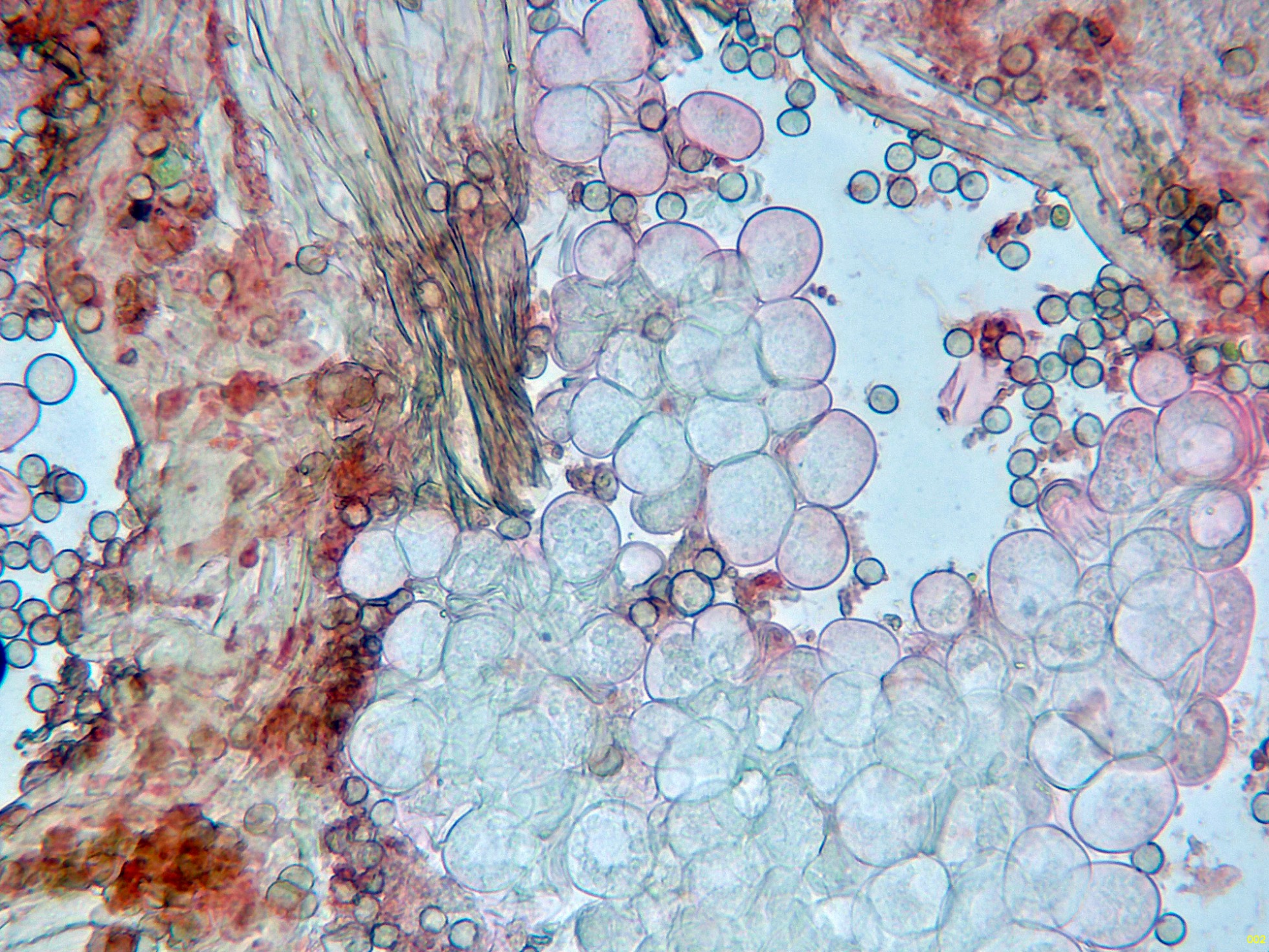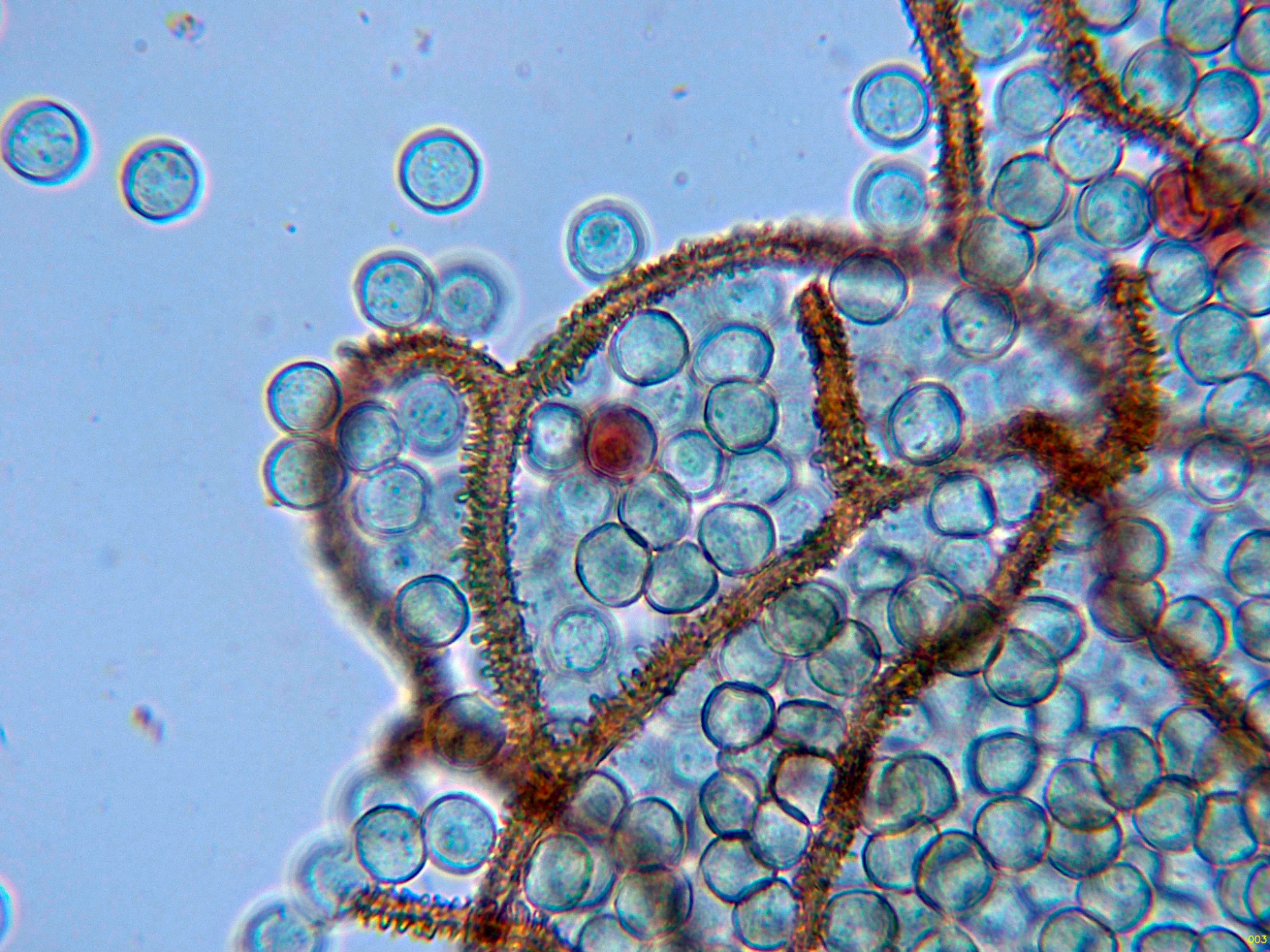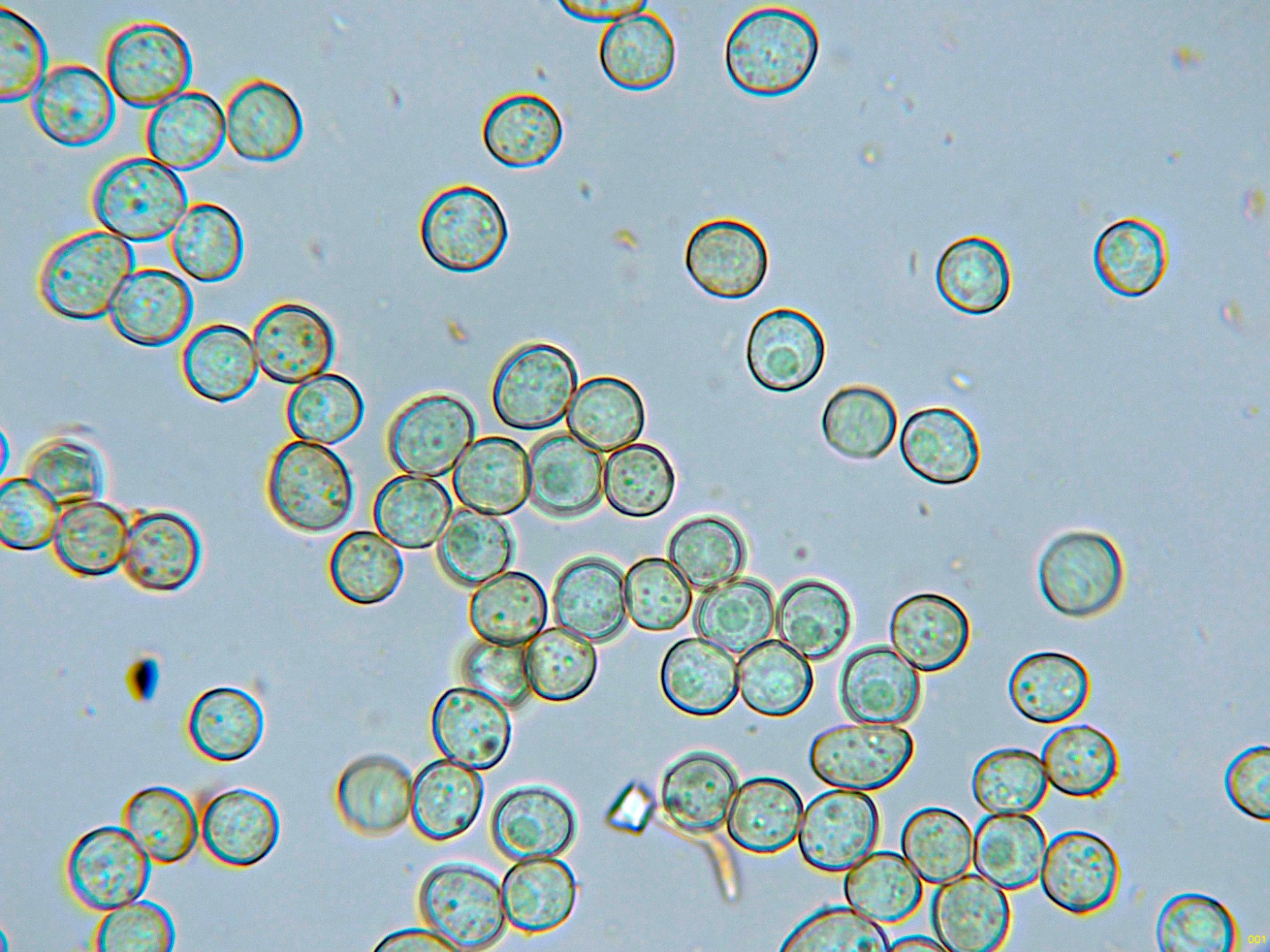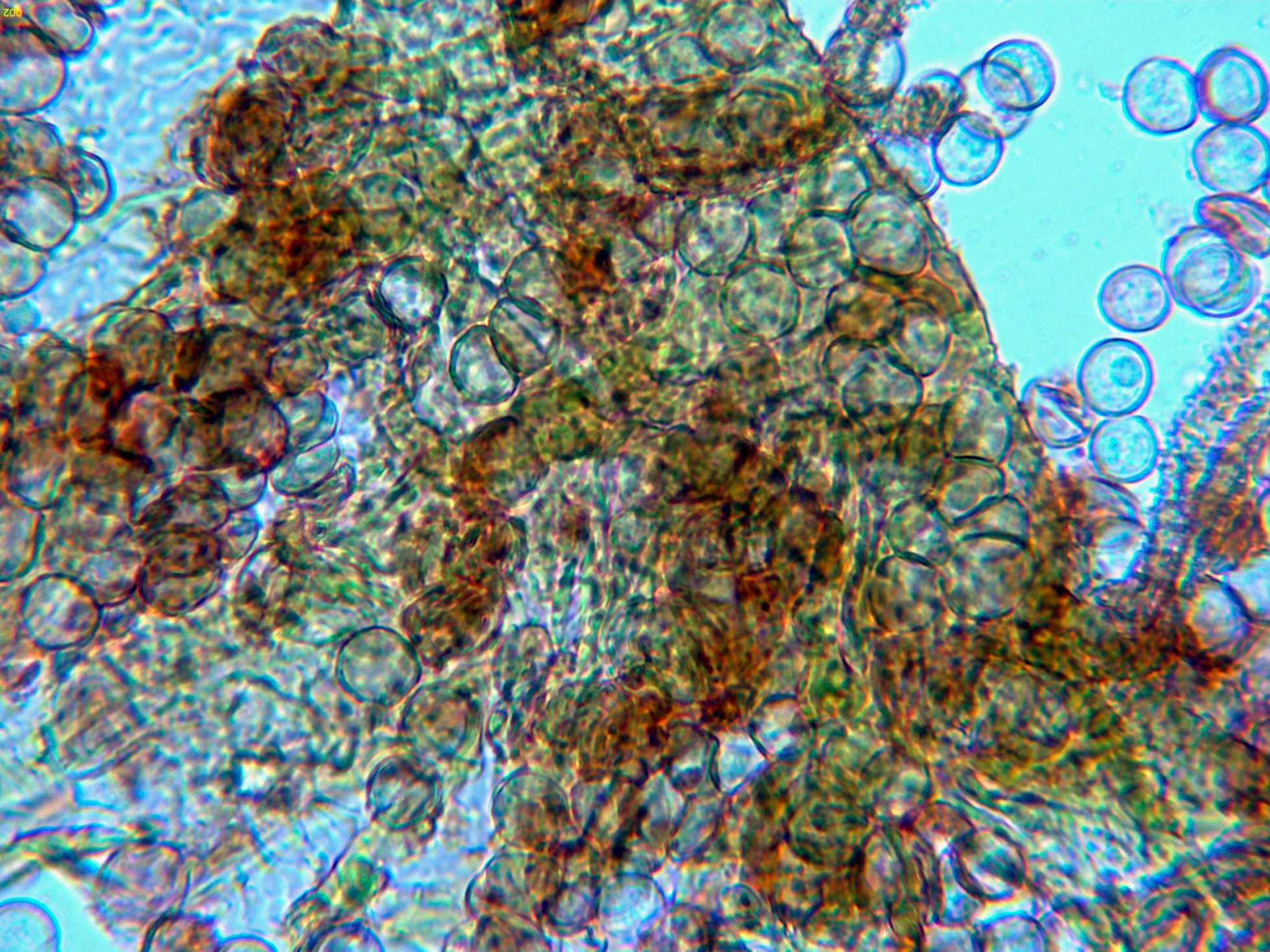 Esporas globosas, hialinas a débilmente ocráceas vistas al microscopio, lisas con algún que otro grupo de minuciosas verrugas.