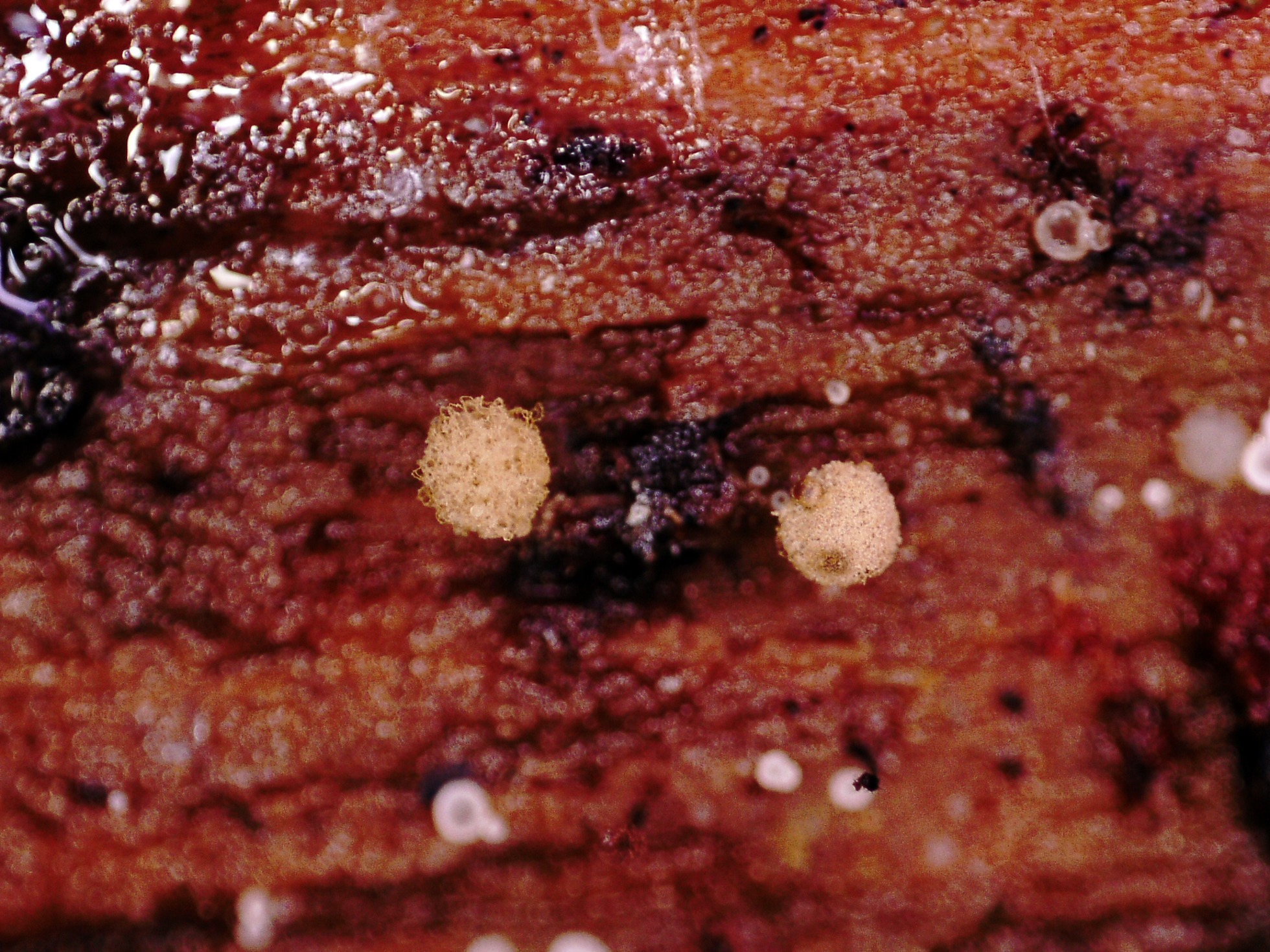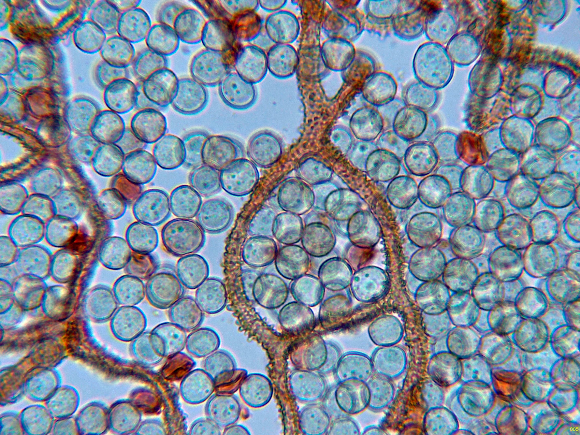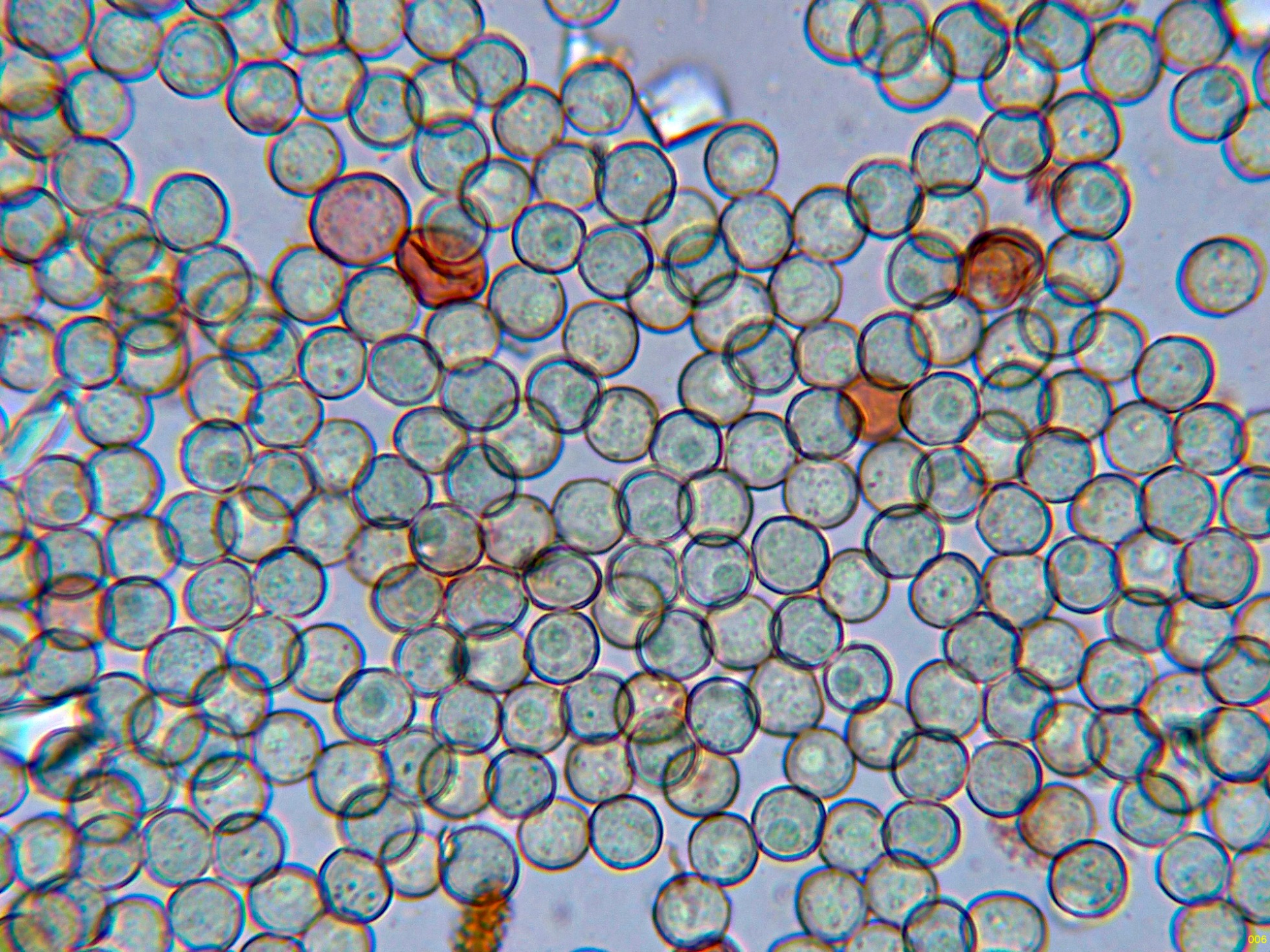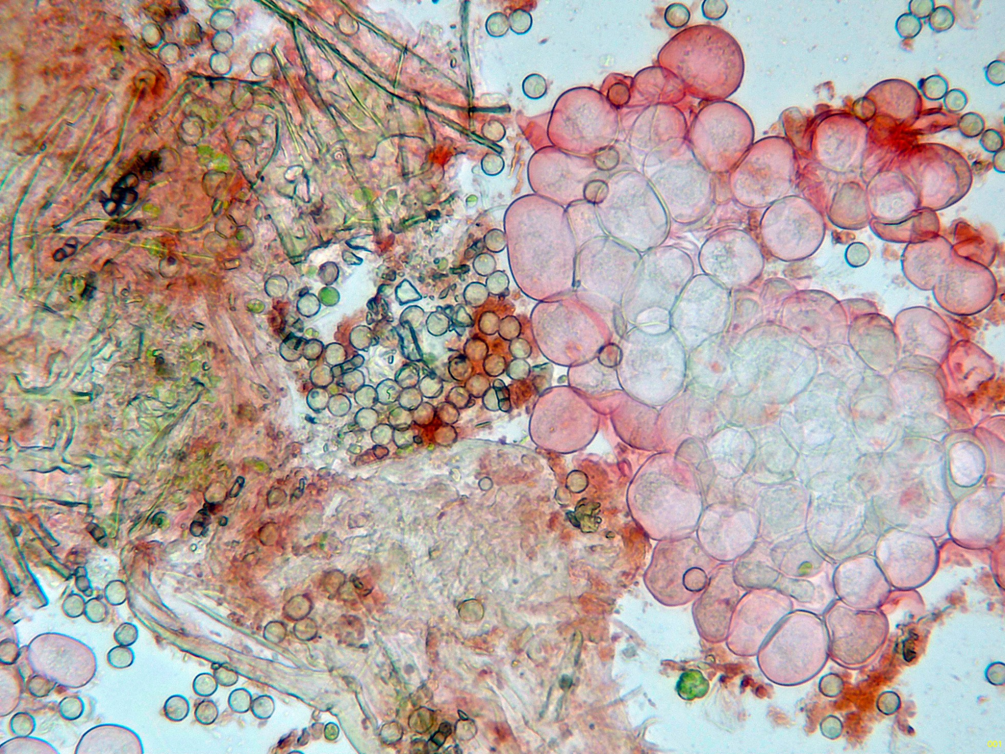 Esporas globosas, hialinas a débilmente ocráceas vistas al microscopio, lisas con algún que otro grupo de minuciosas verrugas.