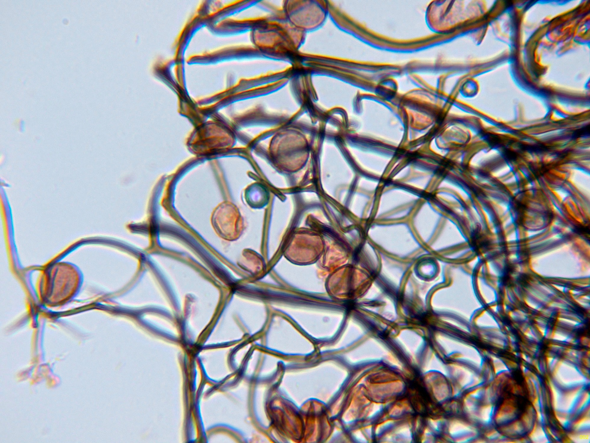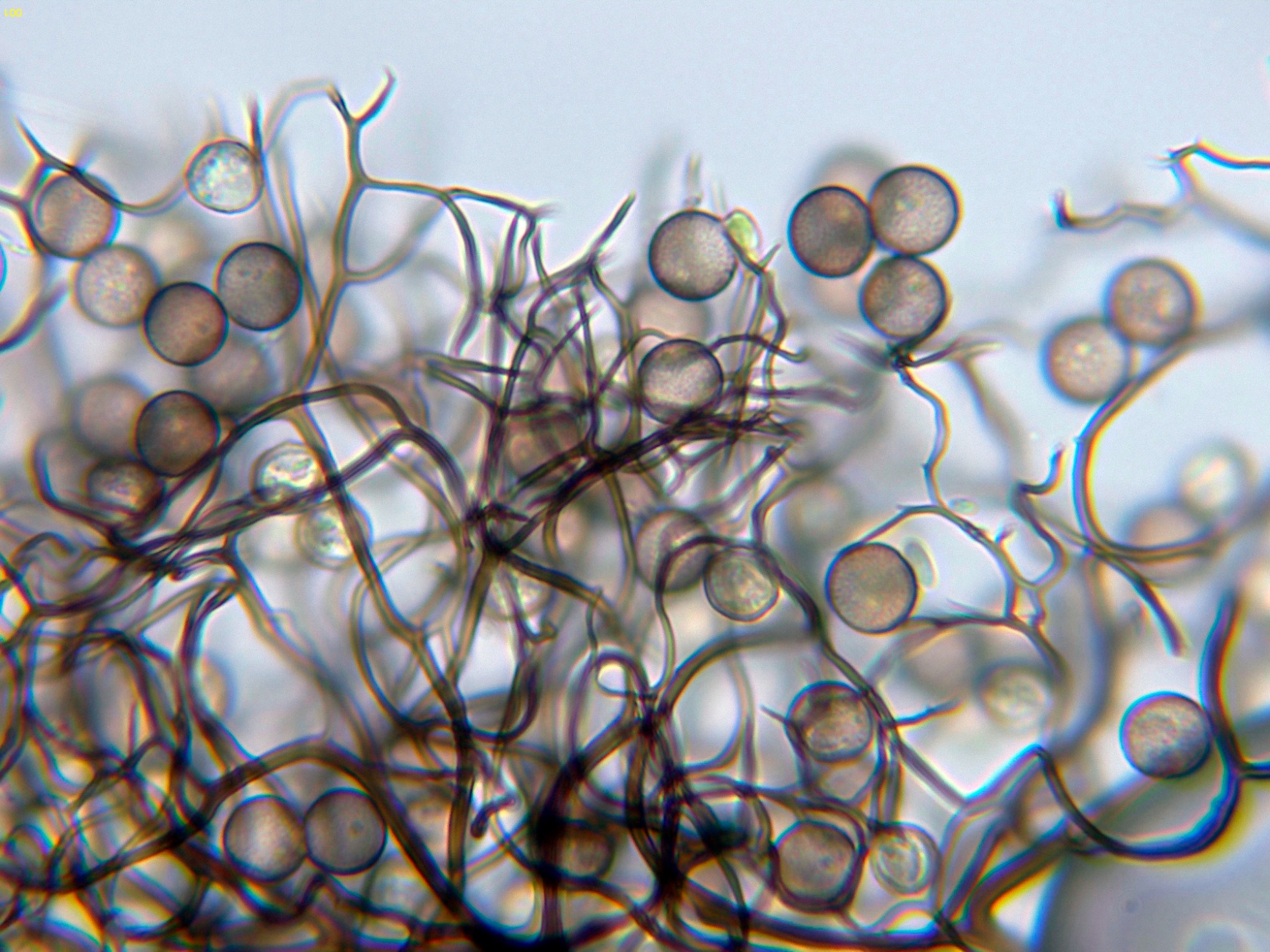 Estas esporas globosas, de color marrón al microscopio, con sutiles verrugas dispuestas uniformemente, y con unas medidas en agua de: