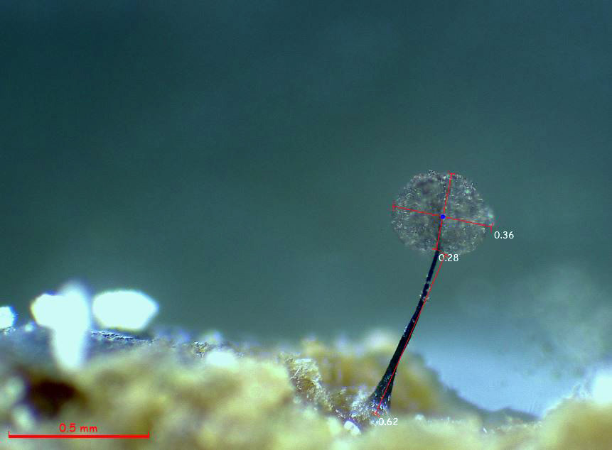 Otro Mixomiceto, este localizado justo al lado de la Arcyria pomiformis que he presentado recientemente, solo 3 ejemplares, que el mayor apenas llegaba a 1 mm. de altura total.