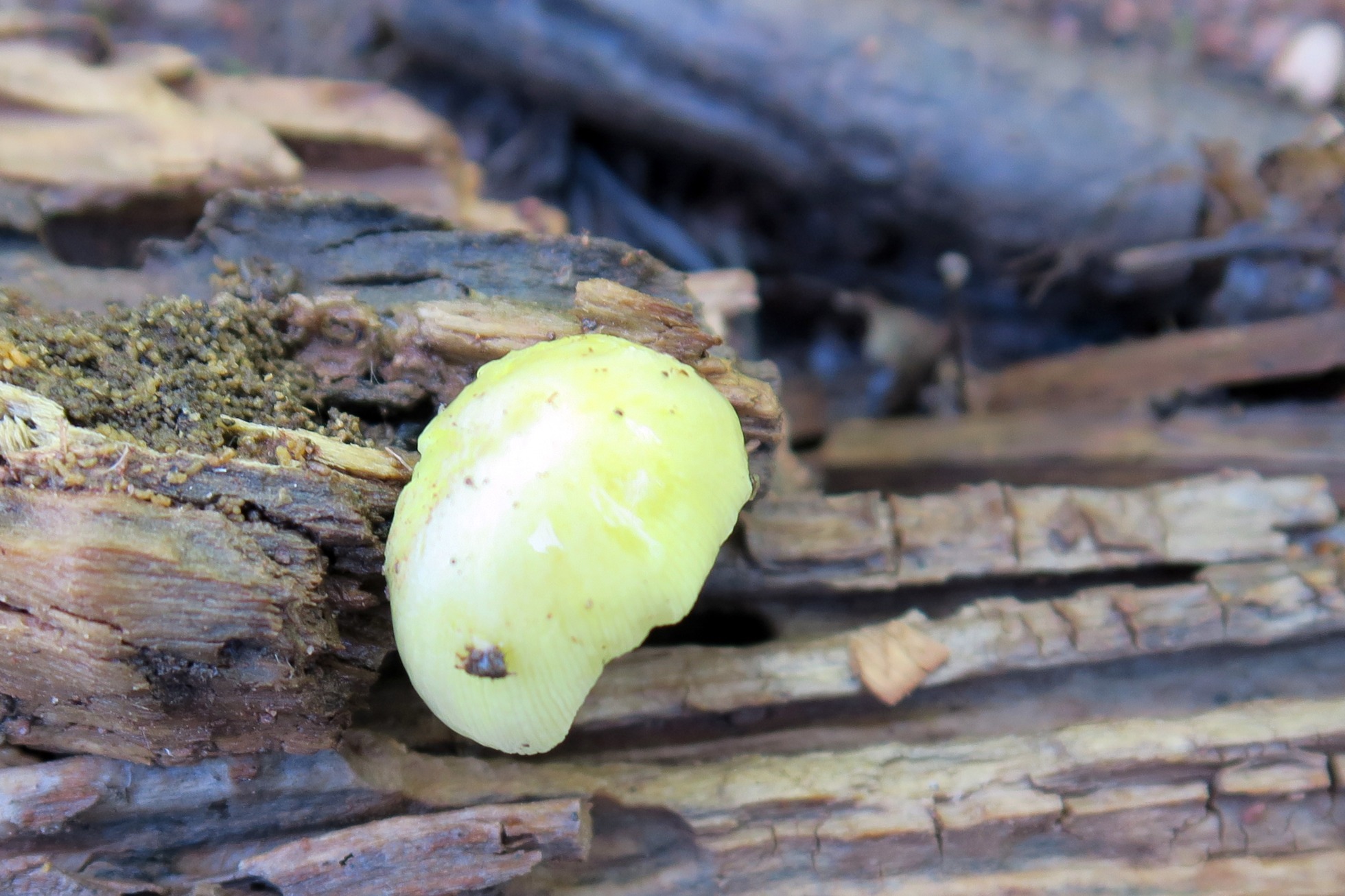 Bolbitius titubans sobre madera.