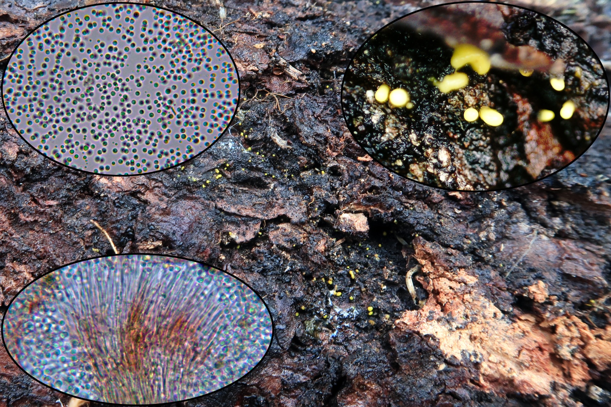Sobre la corteza de un tronco tumbado de pino, tenemos un viejo conocido que suele aparecer por estas fechas, con un tamaño muy diminuto tenemos el Dendrodochium citrinum.